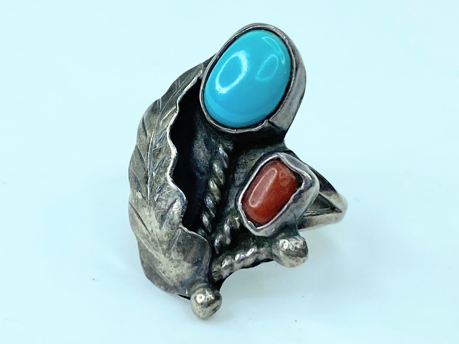 Navajo Ring 925 Silver Turquoise & Coral Artist Signed c1980 JR761