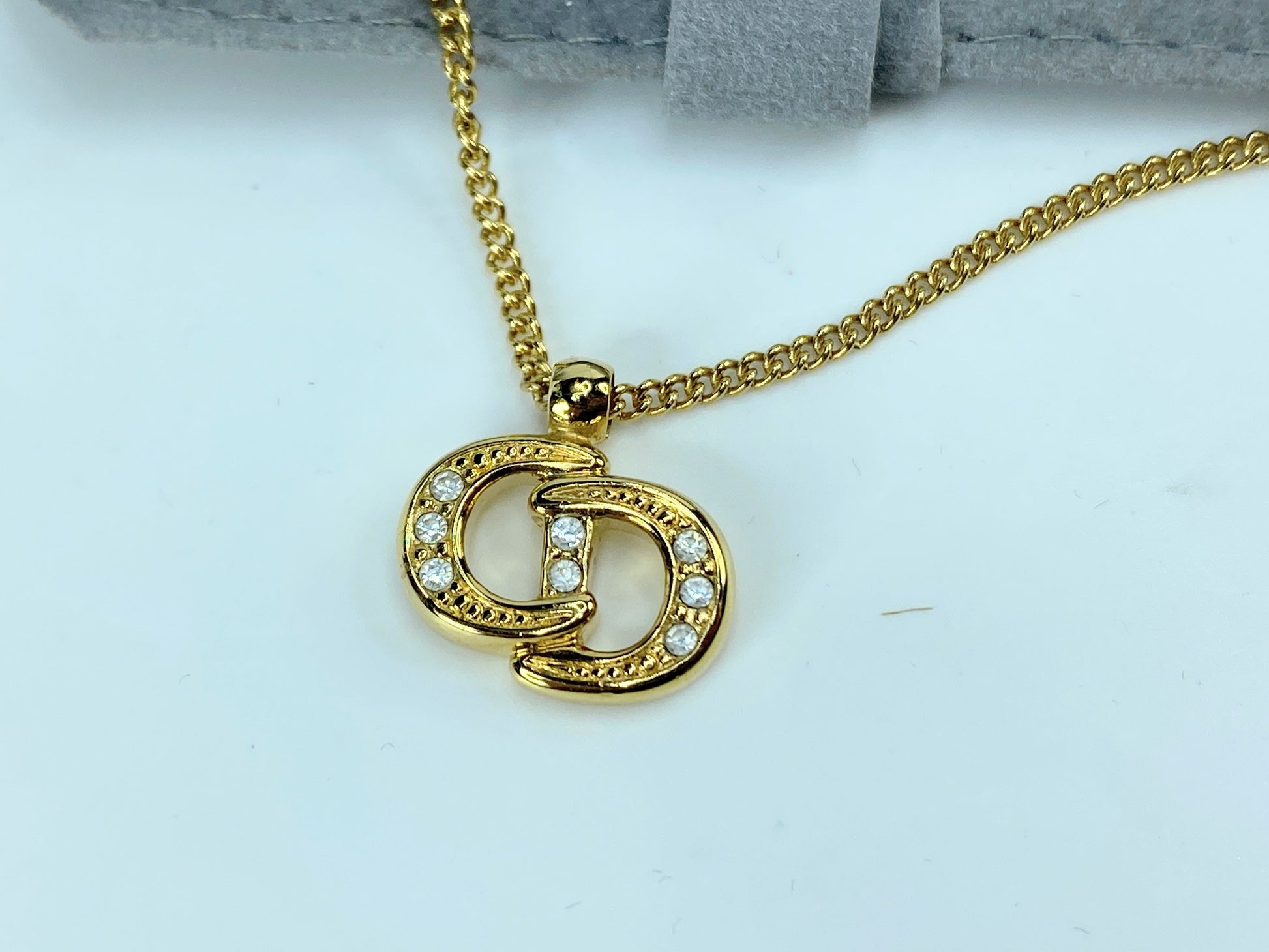 Christian Dior "CD" logo tie chain is in gold-tone metal with small rhinestones. Dangle with a "CD" charm, pave with rhinestones. New old stock, comes with original pouch