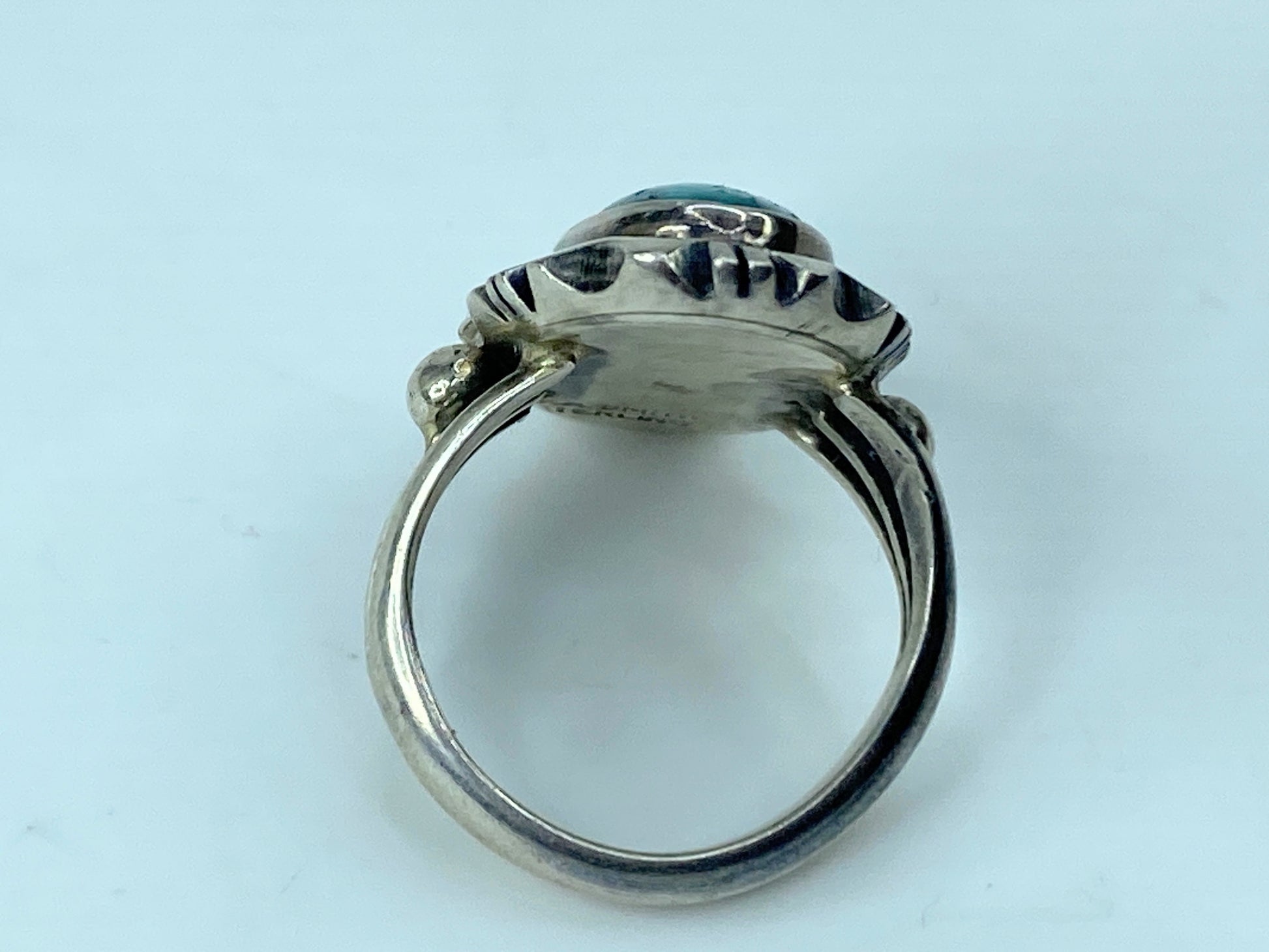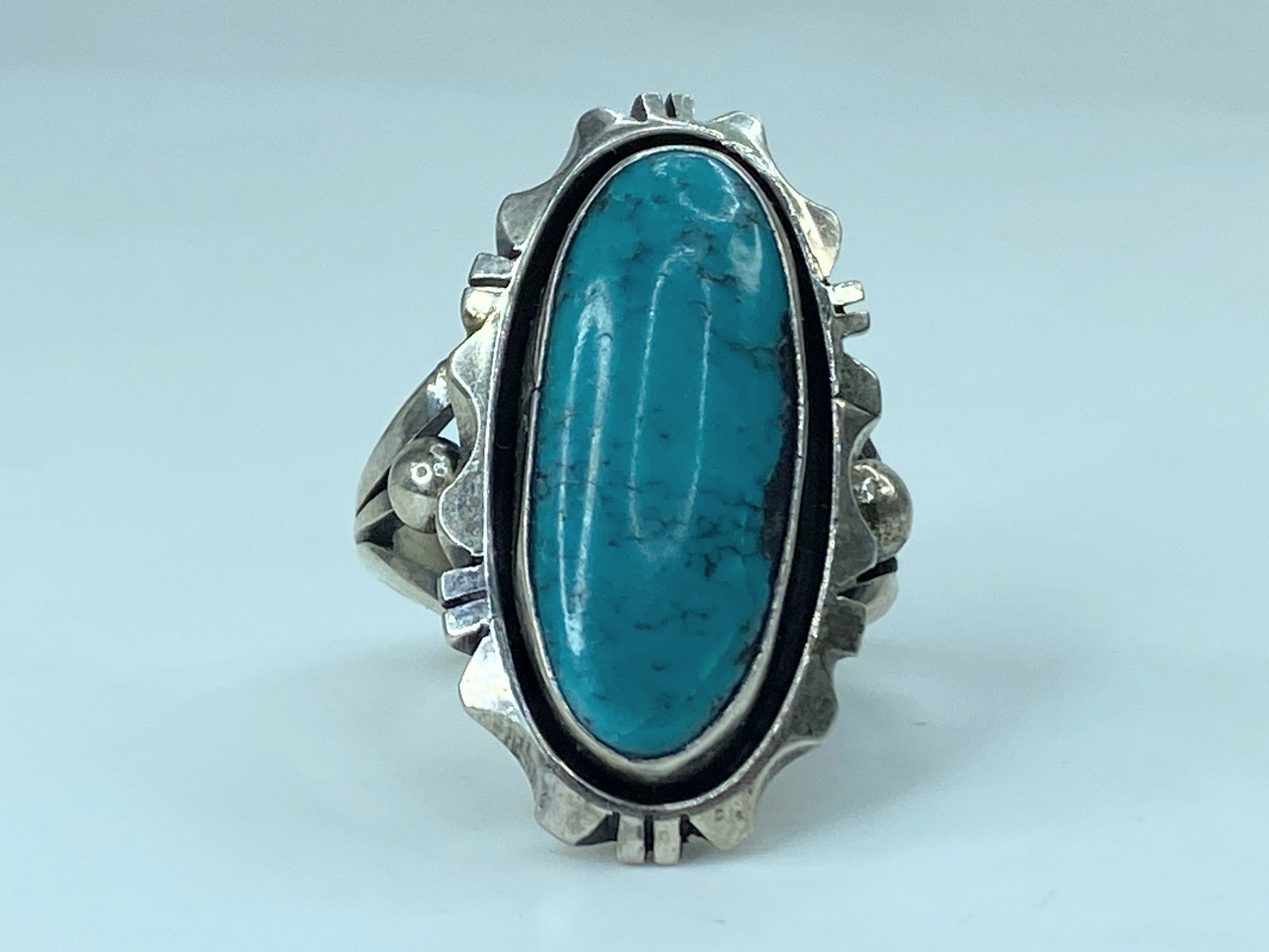 This stunning turquoise ring is set in pure sterling silver! It centers a large genuine turquoise, it measures 24mm x 10.4mm, with a solid silver floral border, triple split shanks, ring size 8.5, and a weight of 9.9 grams. The ring top is 1 1/4" across. Very nice ring. Signed by artist A. Smith.