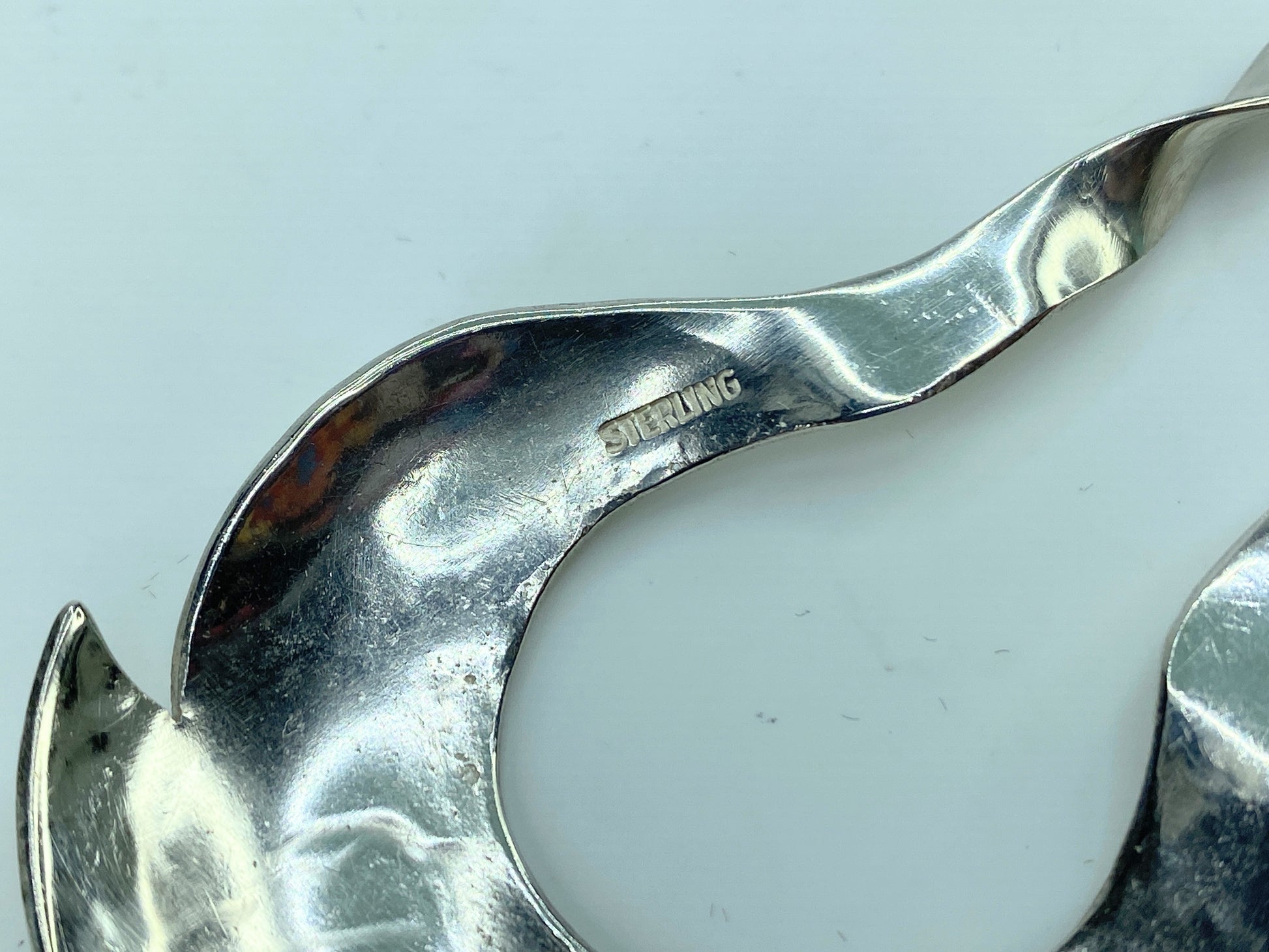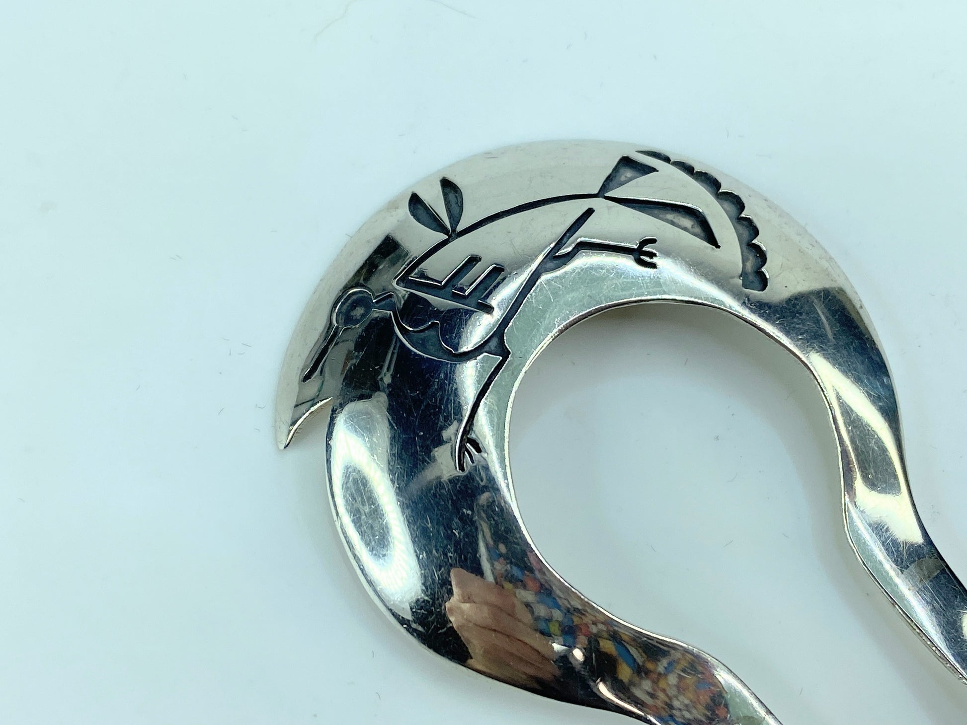 This beautiful hair comb-pick will accessorize your messy bun, your tidy updo, your ponytail, or braid. It is an elegant, standout conversation piece with a mid-century design. Hallmark sterling stamp, which is the standard for High Desert silver jewelry handmade during the first half of the twentieth century.