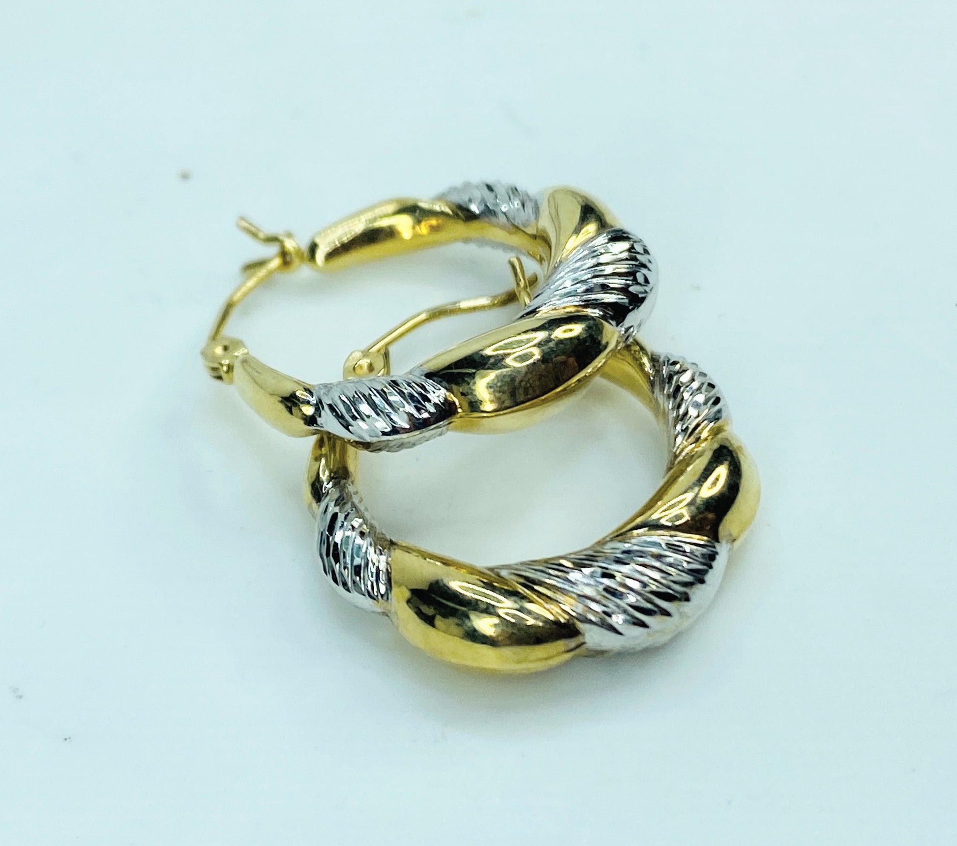 Ornate 10K two tone gold texture smooth dangle hoop earrings. 1.8g JR1005