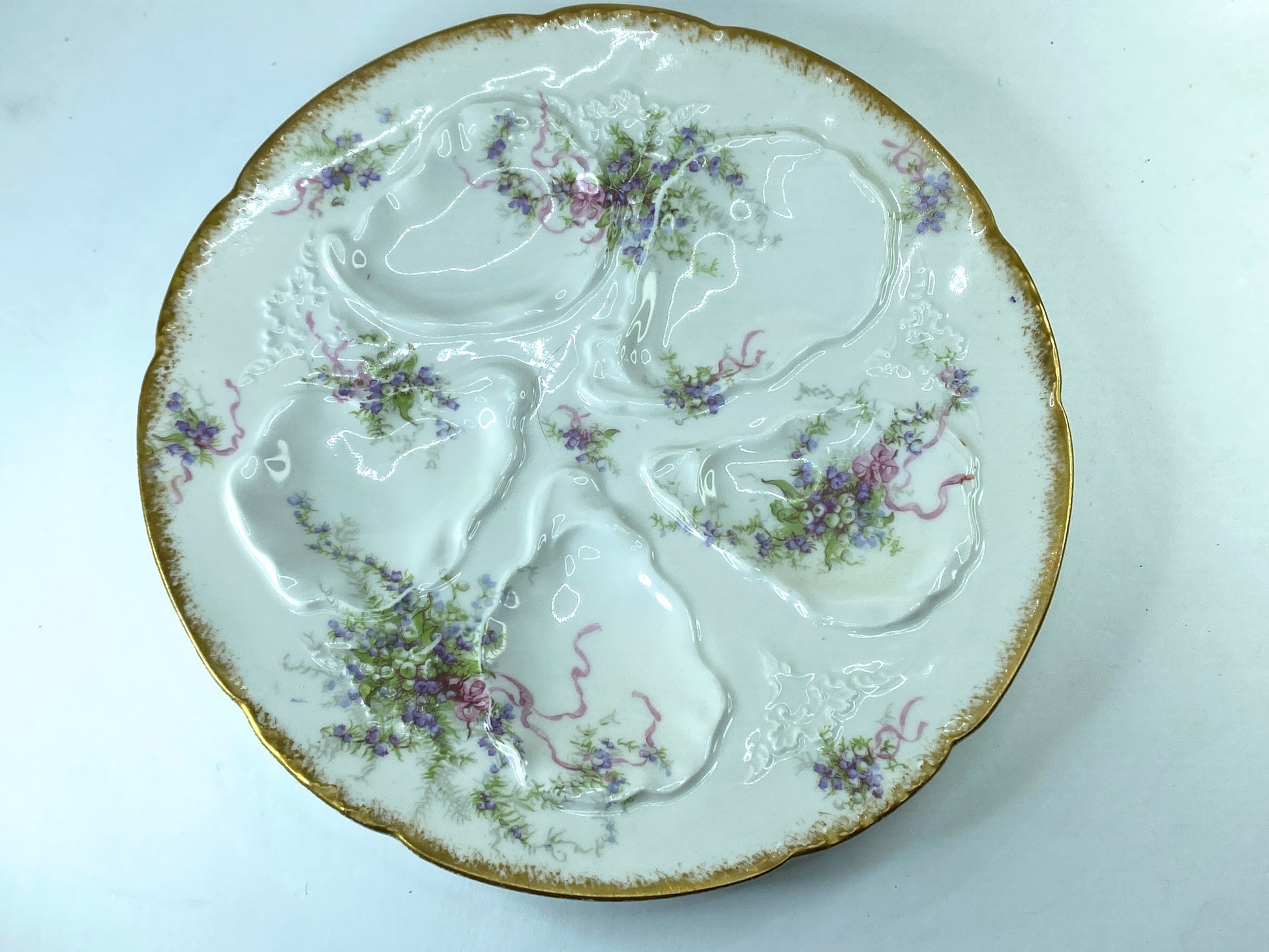 Add a touch of vintage elegance to your home decor with this exquisite GDA Limoges, France, collector plate. Featuring a beautiful pattern of LAVENDER roses and fish, this 8.75-inch round porcelain plate is handcrafted with intricate engraving details, making it a unique addition to any collection. The plate was produced in France during the Edwardian era (1901-1910) and features oyster recesses, adding to its historical value. This plate is perfect for display on special occasions.