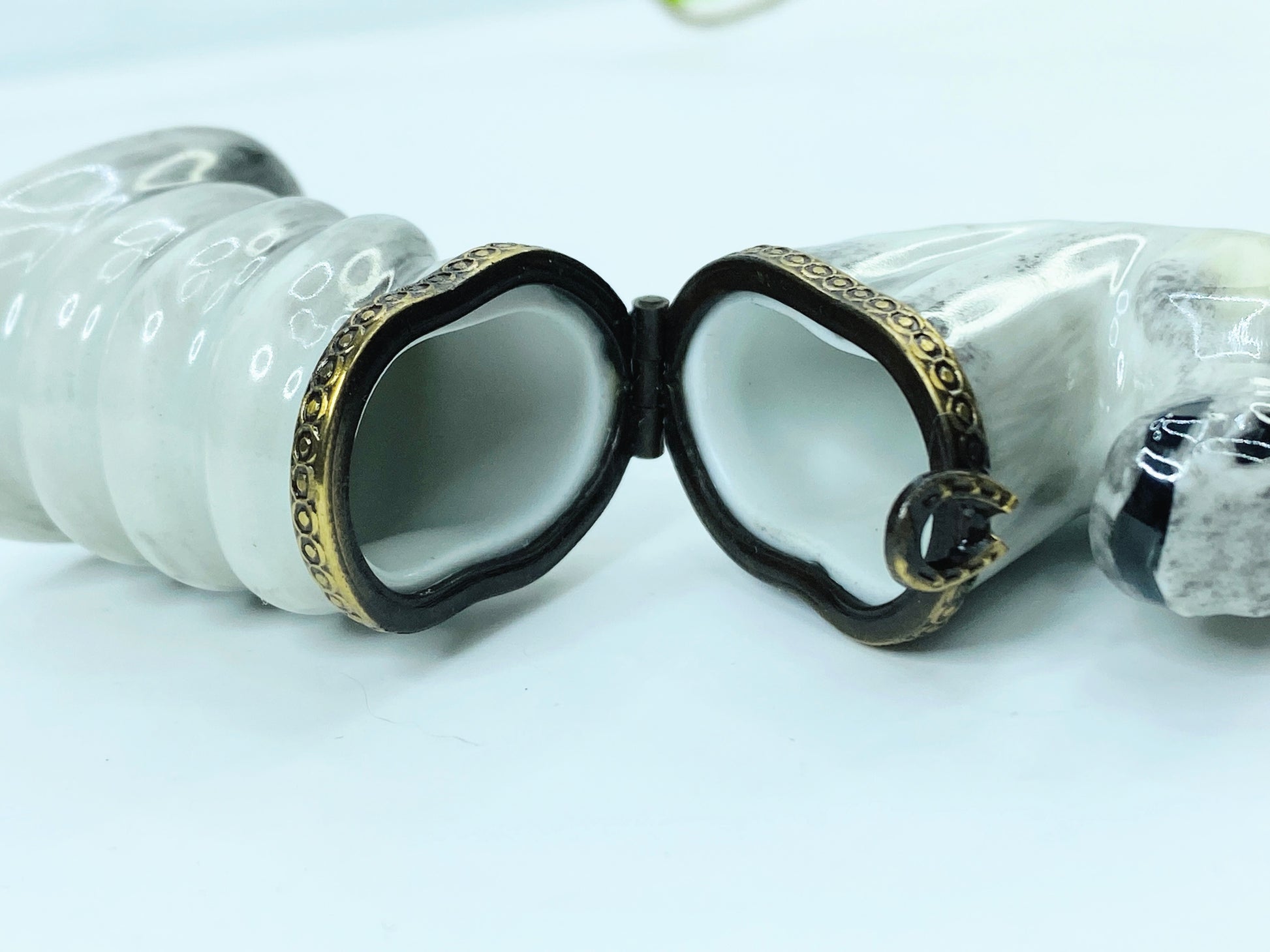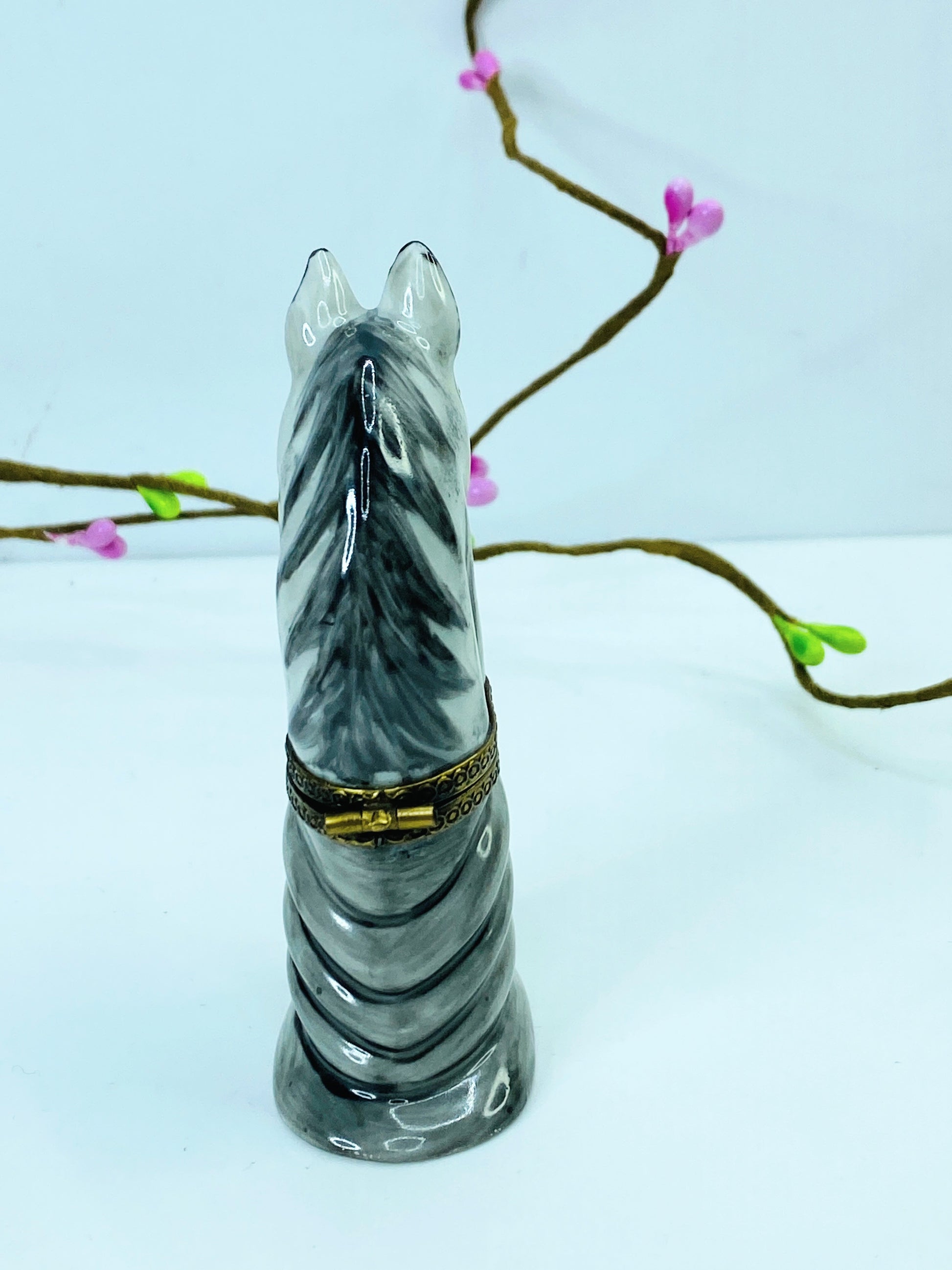 Rare decorative ceramic trinket box in the shape of a horse's head by Limoges. It is designed to look like a chess knight piece. The box is made of porcelain and features a gray-and-white marble-like finish with a gold-colored chain detail around the neck. The head is a lid that opens to reveal a small compartment inside. The clasp is a horseshoe. Hallmark on the base. 2 3/8 x 1 1/8 x 1 5/8", in excellent condition.