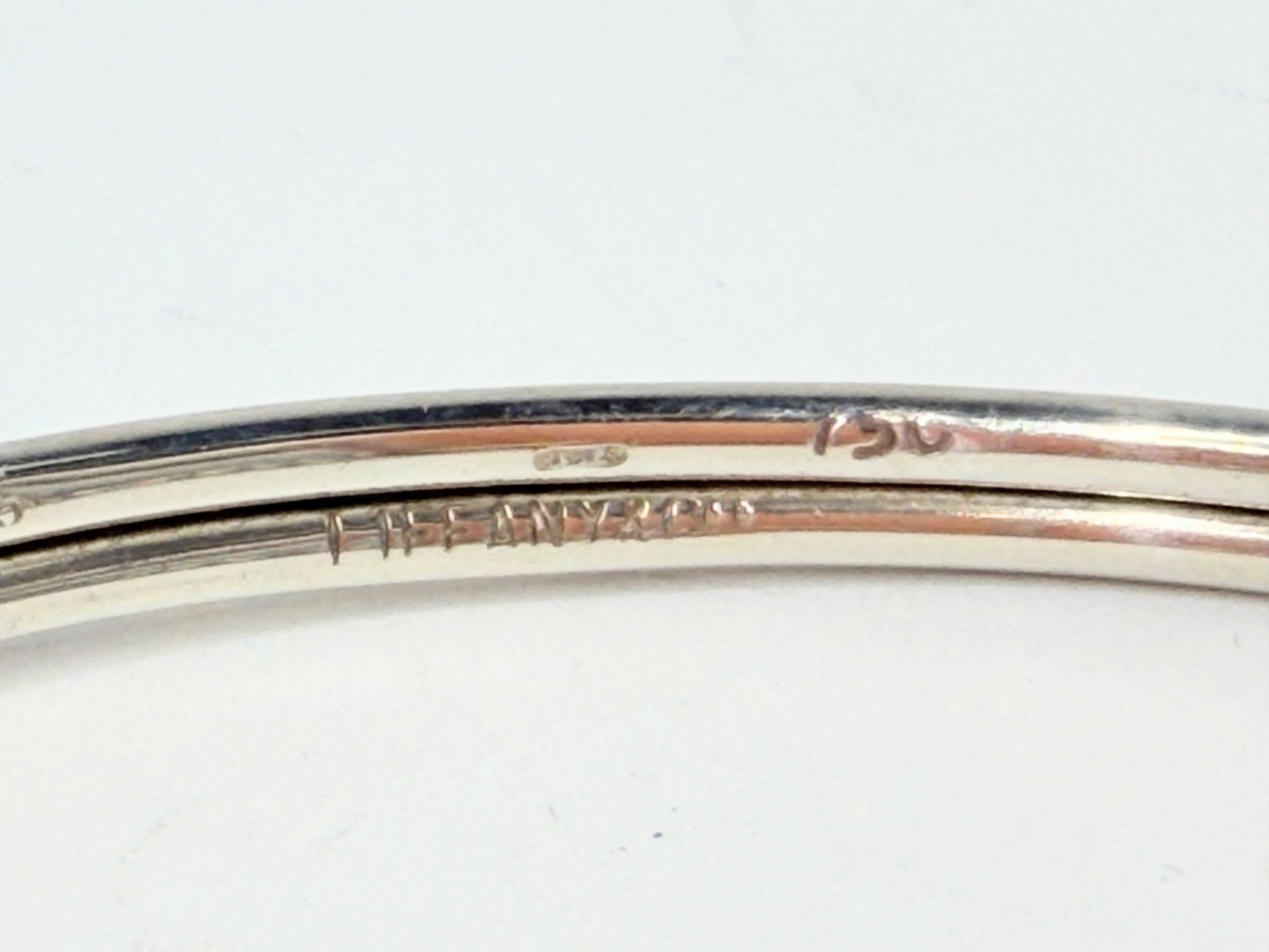 Vintage Tiffany & Co. bangle bracelet crafted in sterling silver with 18K gold bead accents, featuring the brand’s classic Double hook-and-eye closure. The double-wire construction and refined mixed-metal detailing create a balanced, architectural silhouette with enduring appeal. Hallmarked Tiffany & Co., 925, and 750. Multiple examples available, each within the stated size and weight range. It comes with a Tiffany original pouch
