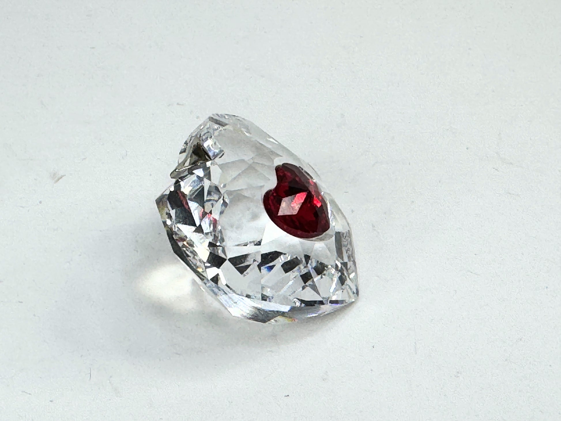 Made by Swarovski, this red and clear crystal Christmas or Valentine's heart-shaped hanging ornament comes in the original box. The intricately faceted three-dimensional ornament features a deep red heart at its center, surrounded by clear crystal. There is a silver-toned V-shaped bar across the top.