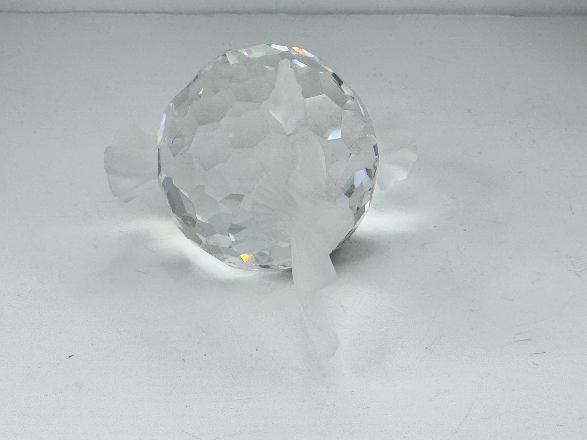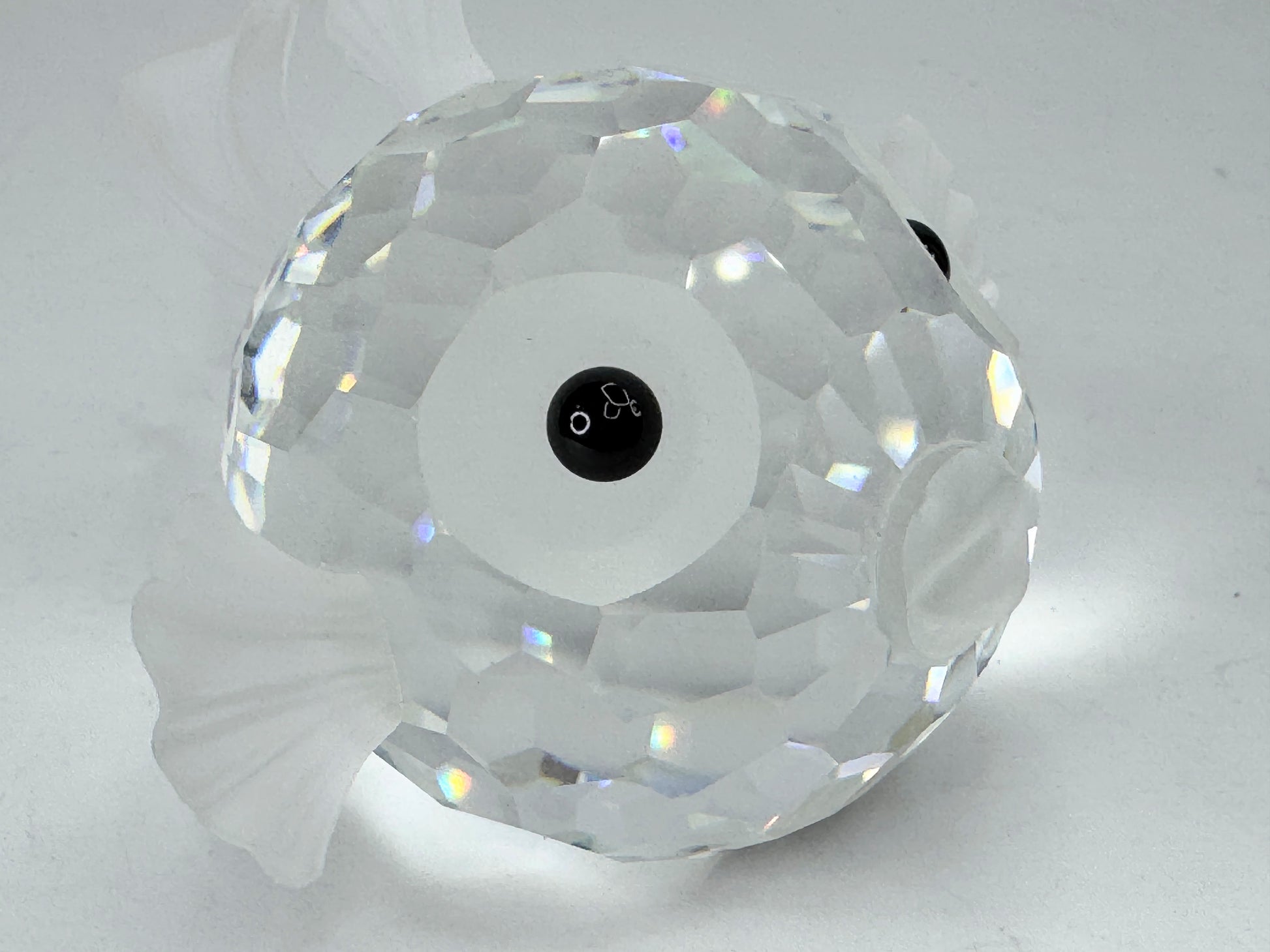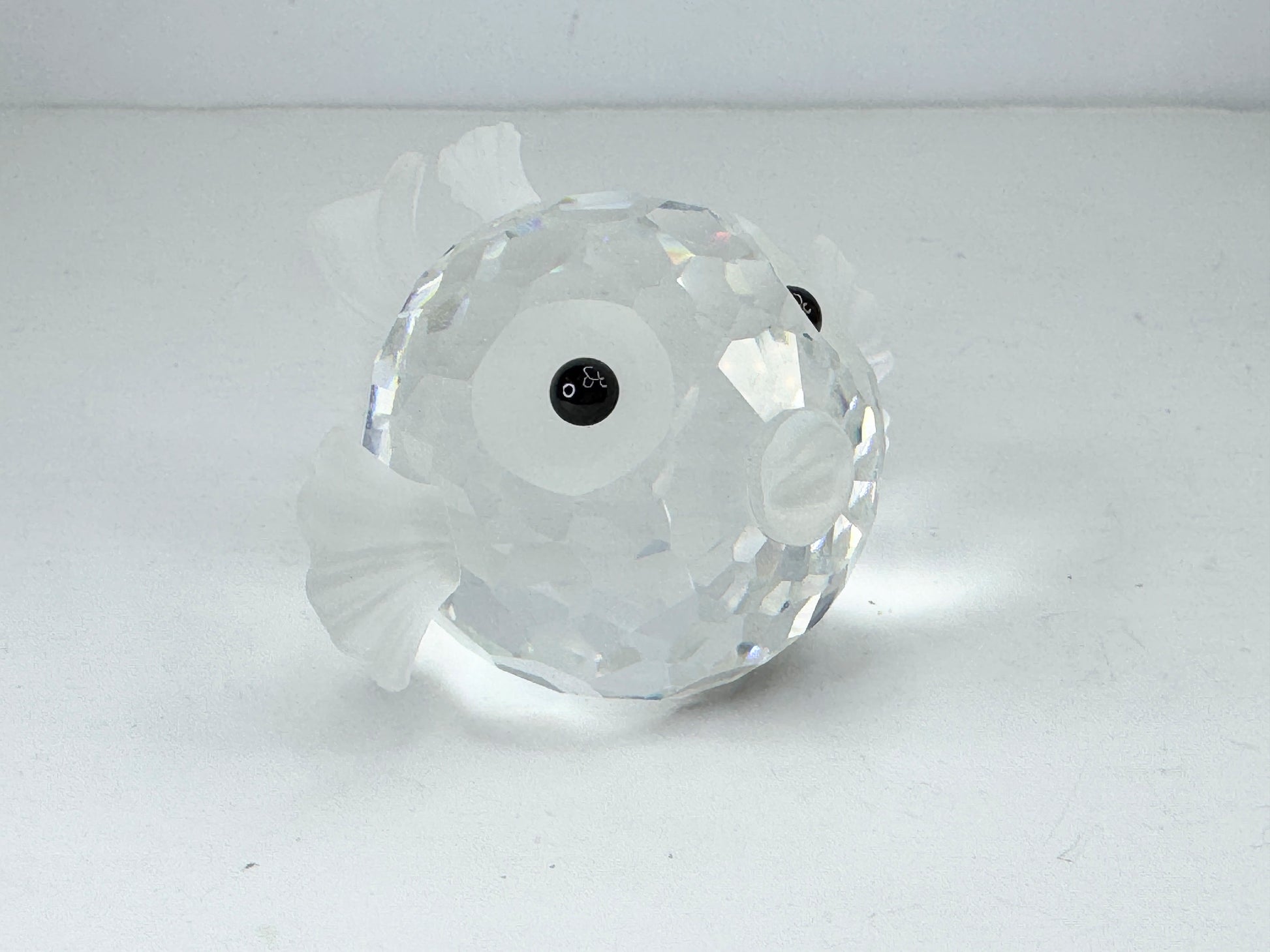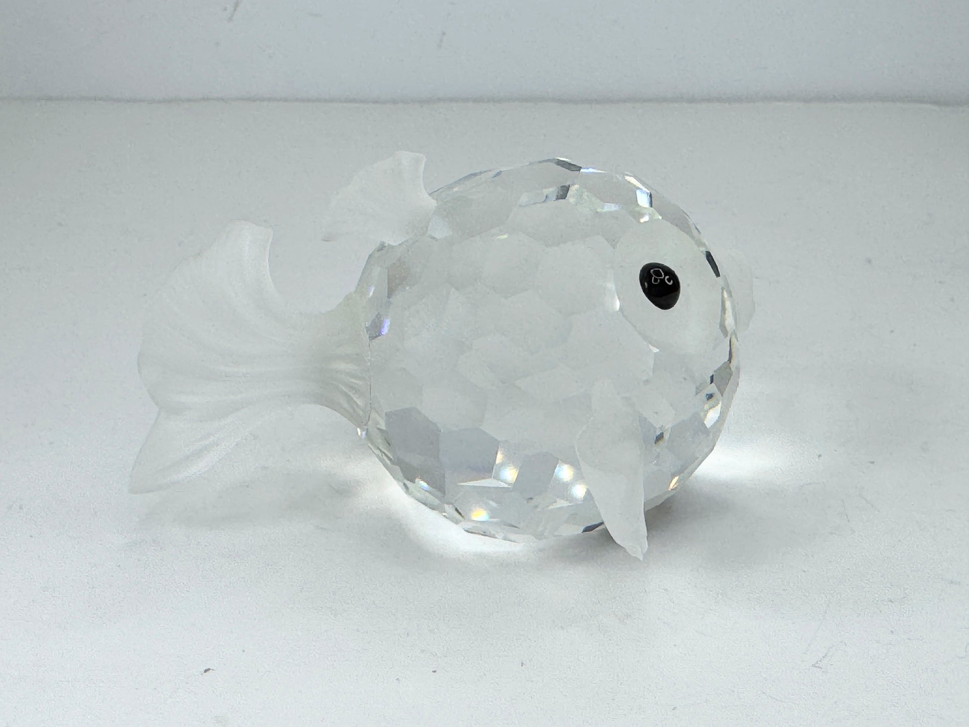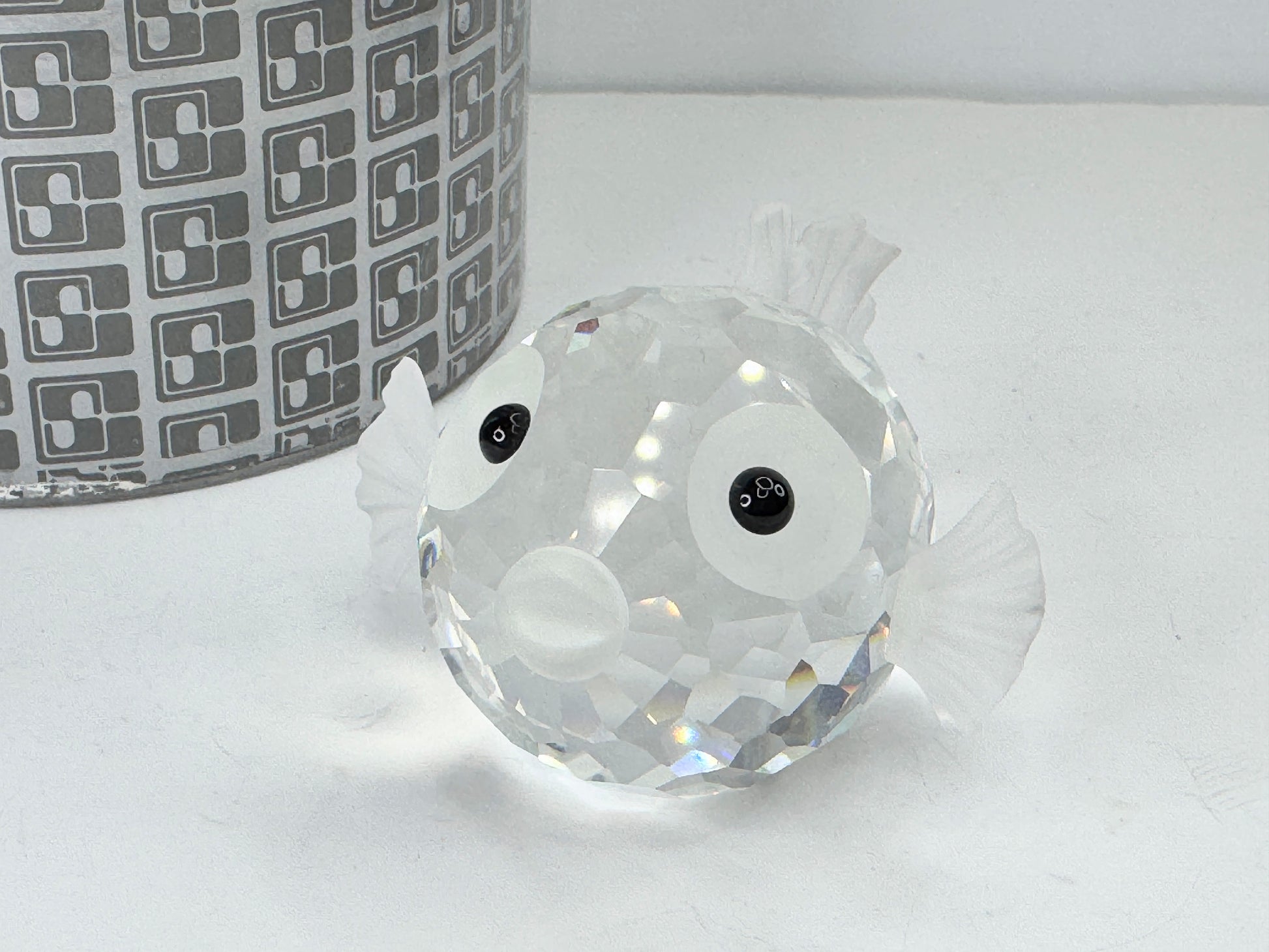 This is a vintage Swarovski crystal figurine of a blowfish, also known as a puffer fish. It was part of the "South Sea" series and was retired in 1991. The figurine is made of faceted clear crystal for the body, with frosted crystal used for the fins, tail, and mouth. It has black crystal eyes.