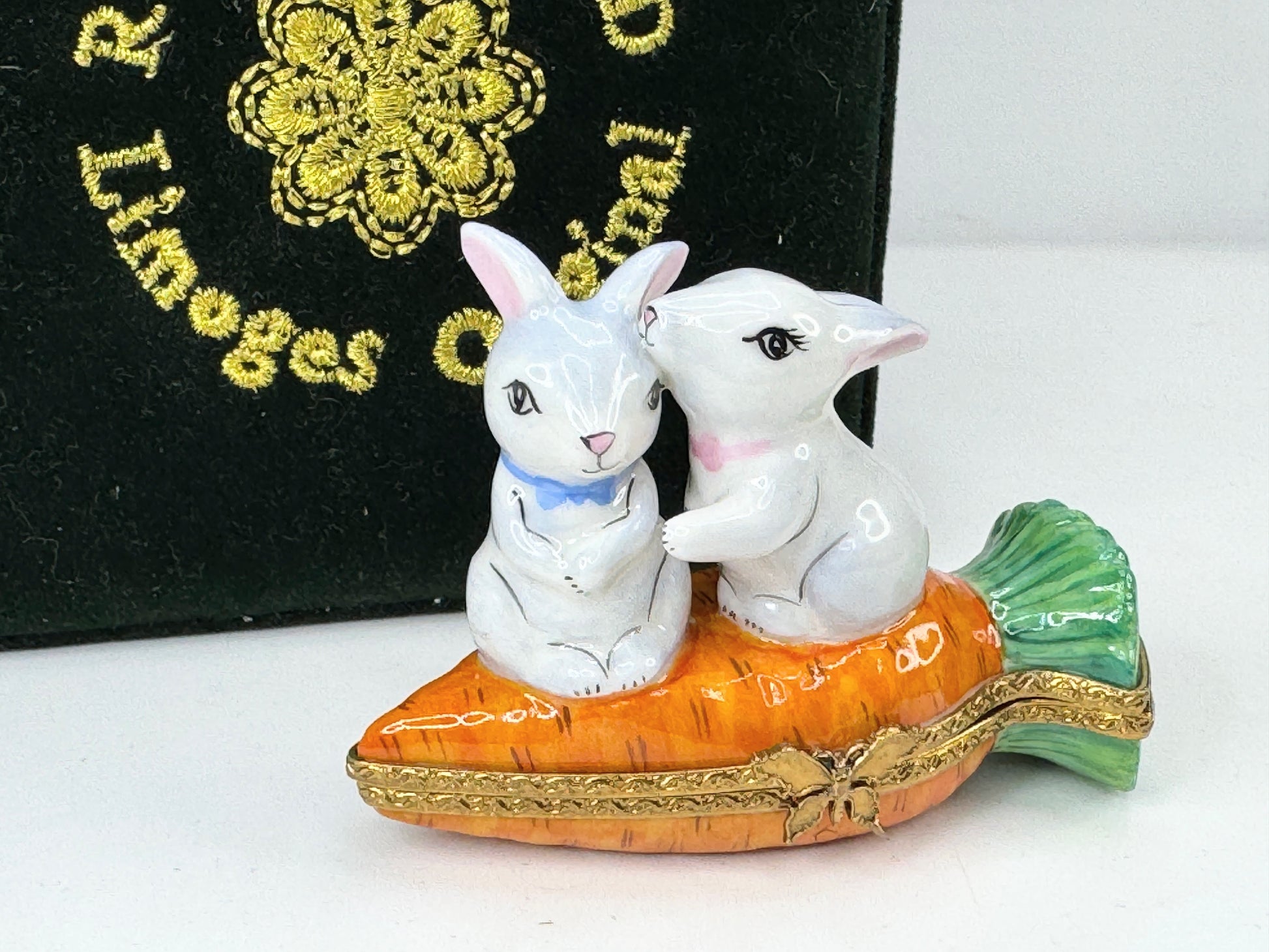 Rochard Limoges Loving Bunny rabbit atop a Carrot Trinket in original box A520