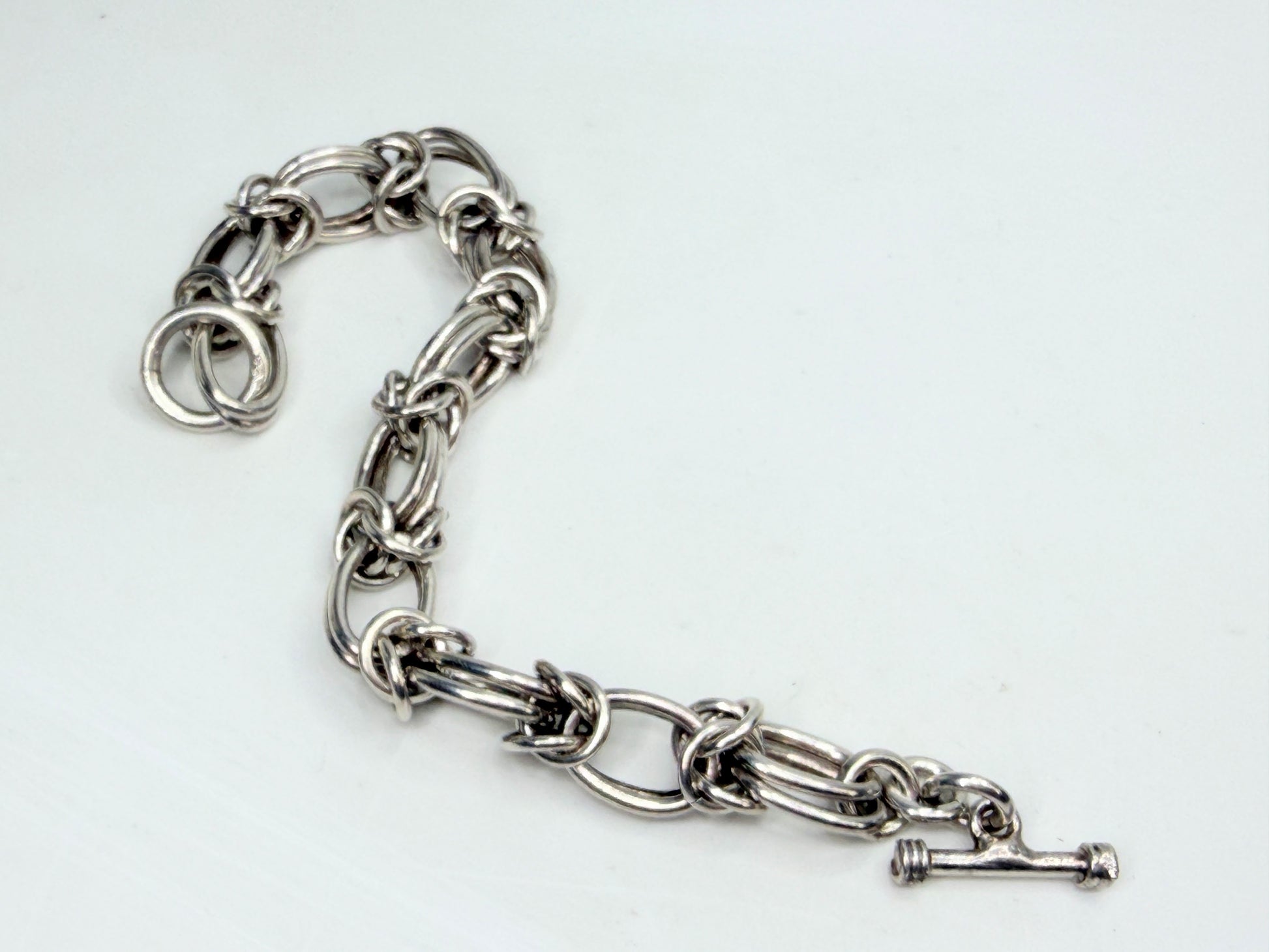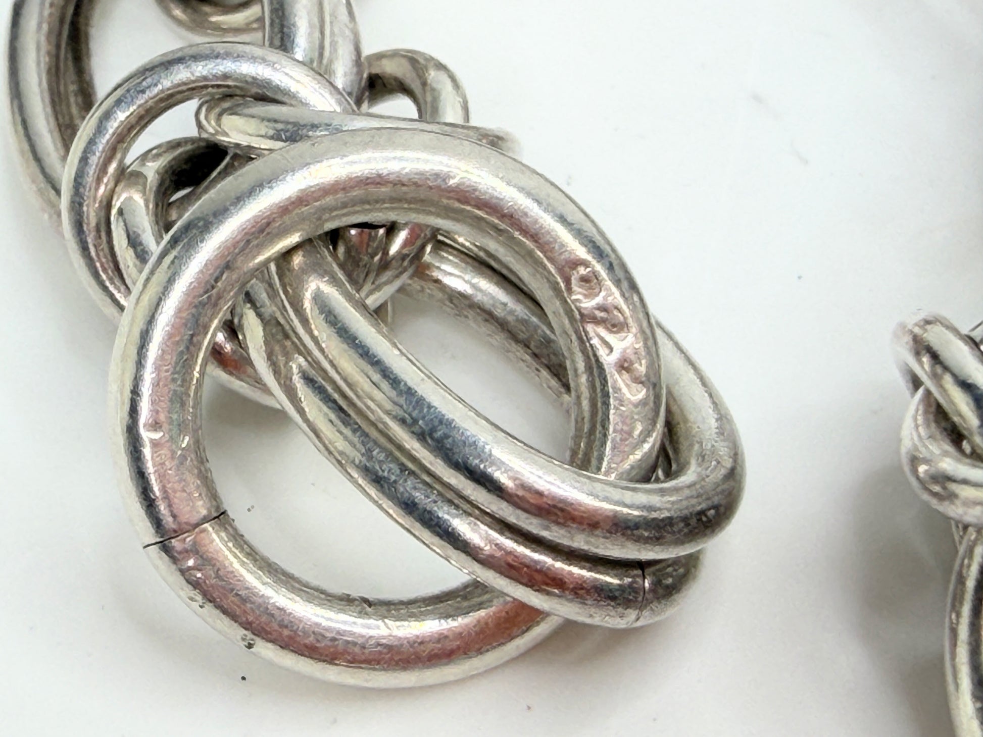 This solid sterling silver bracelet is constructed with substantial interlocking oval links and sculptural wrapped connectors, giving the piece strong visual weight and a balanced, architectural presence on the wrist. The polished silver surface emphasizes the dimensional link work and classic bar toggle closure, reflecting late 20th to early 21st century silver design focused on mass, durability, and form rather than surface decoration.
