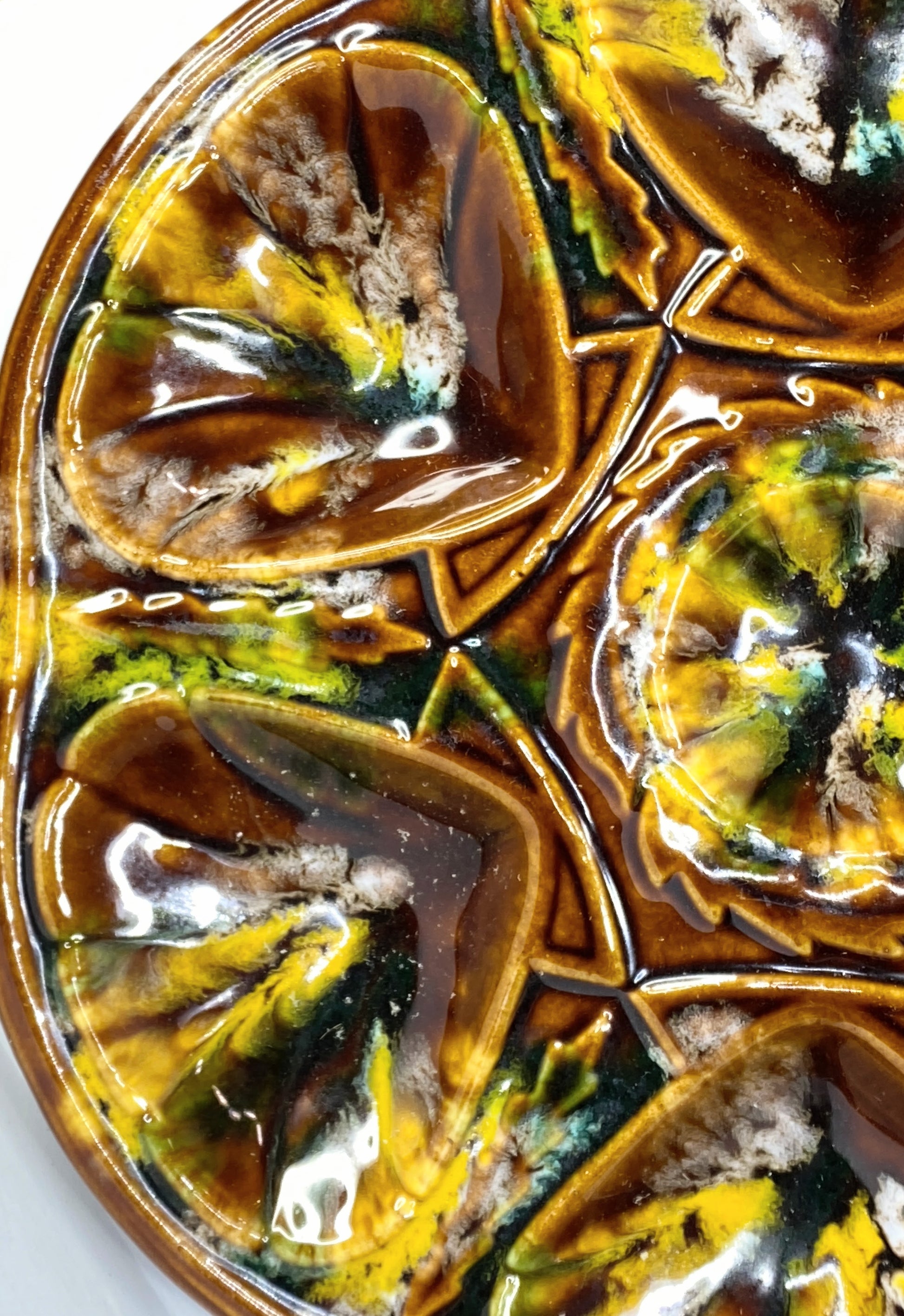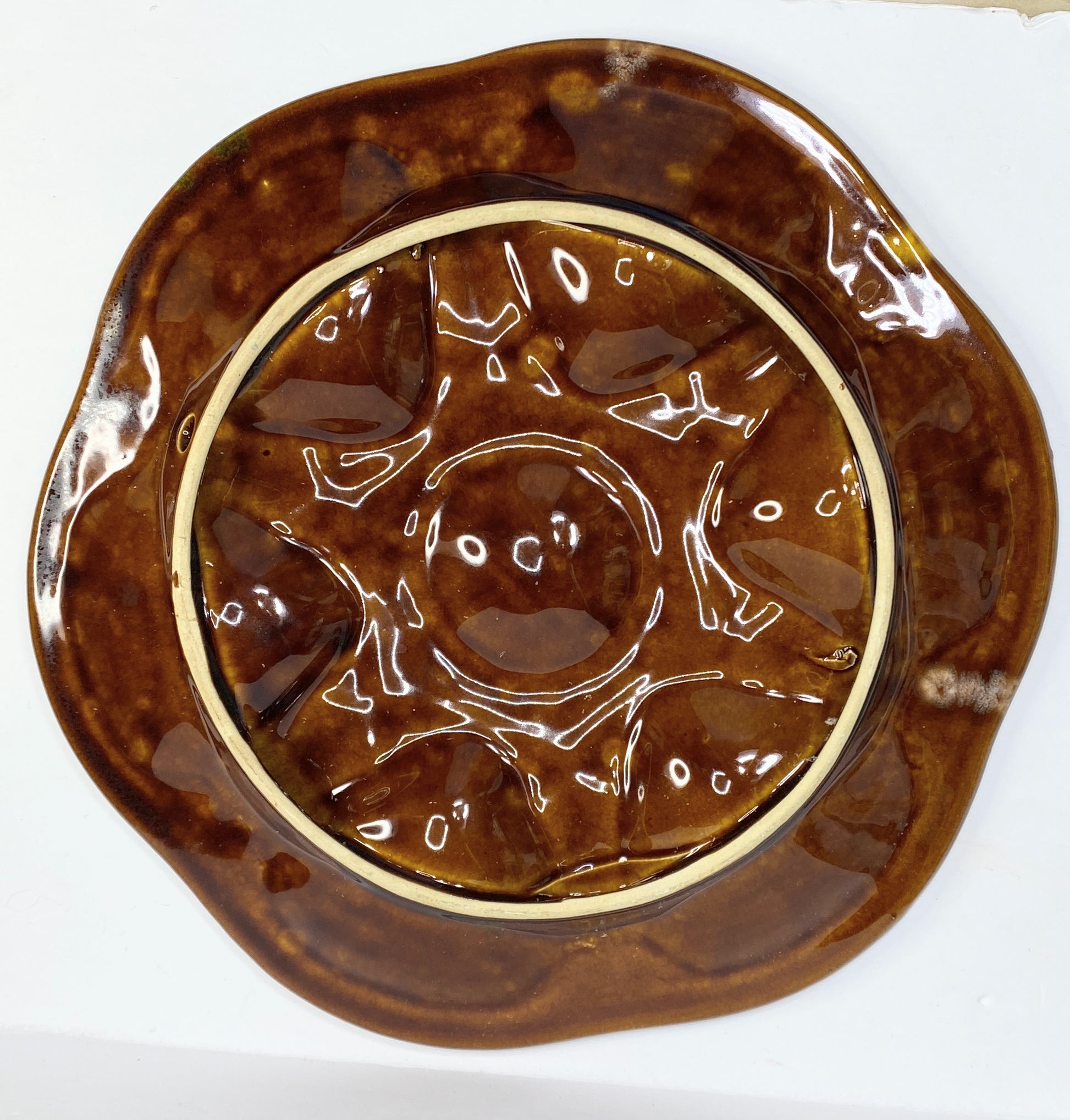 French hand-painted oyster plate made by Saint-Jean-de-Bretagne near Quimper during the 1960s. It's shaped with 6 shell compartments and one for the lemon or the butter. It has great colors of enamel on a brown background. 10 1/4" (26cm) diameter. Perfect condition with an anole for hanging, as shown by the following pictures: . Perfect condition.