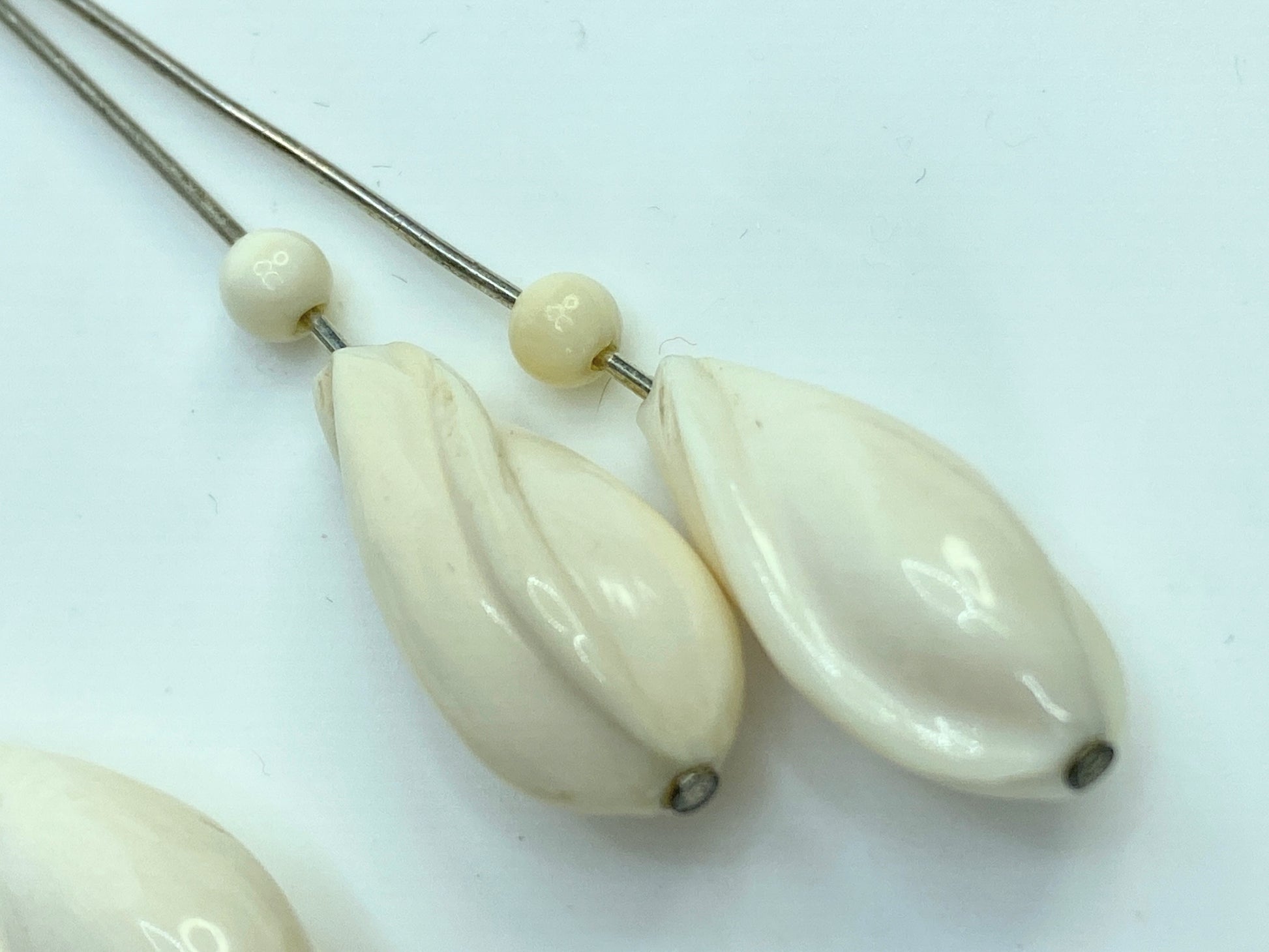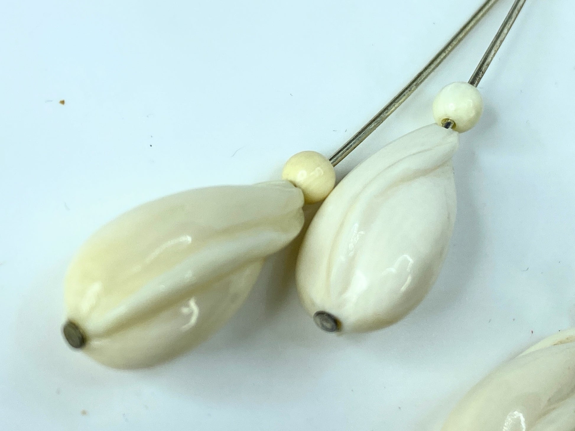 Pretty vintage sterling silver dangling earring. Featuring two dangle Tulip flowers that dangle from a fishhook earring back. The Tulip is a 20.2 x 8.37mm resin or bakelite carving. 7.1 grams, 2 3/4" long, hanging. checked for sterling.