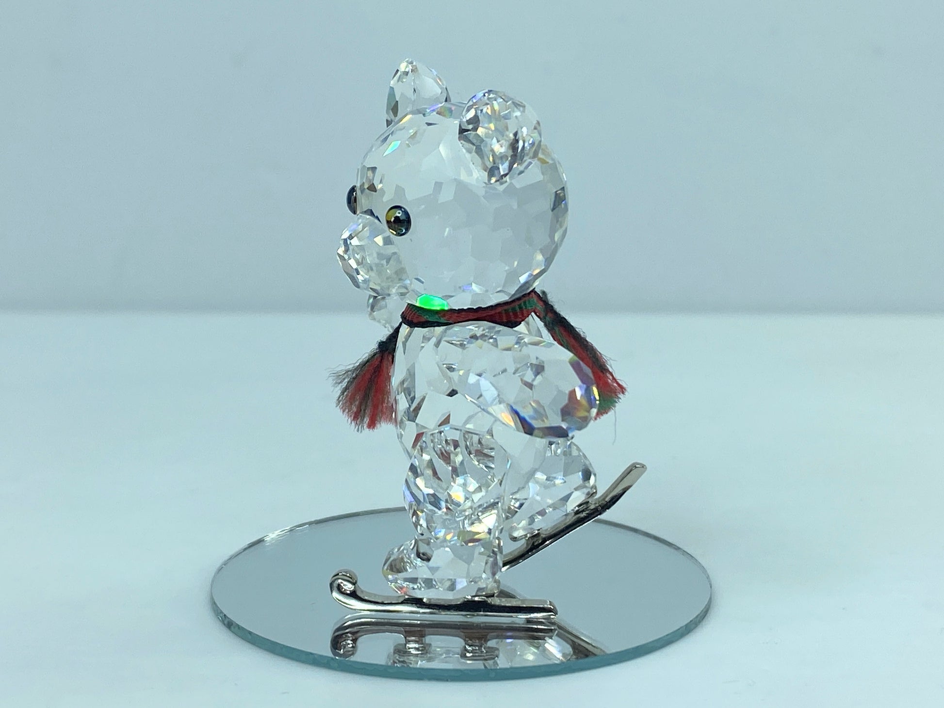 Swarovski Kris Bear crystal figurine featuring an ice-skating pose, adorned with a charming red scarf and intricate crystal detailing. Measuring 2"H, this collectible showcases the brilliance of Swarovski craftsmanship. A delightful addition to any Swarovski collection or a perfect gift for crystal enthusiasts.
