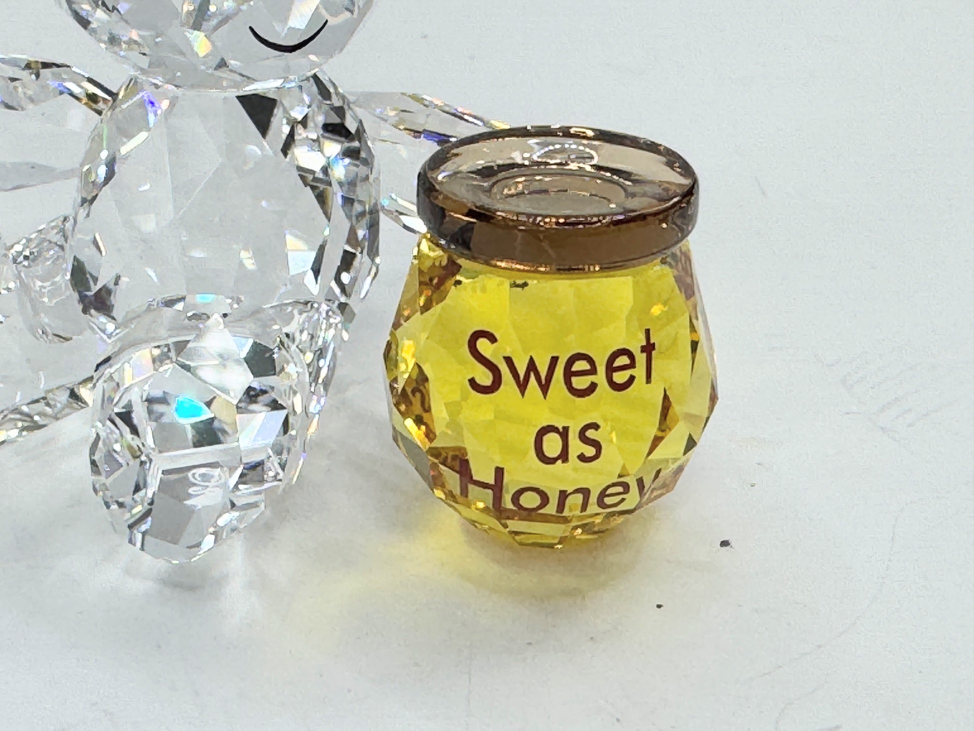 Swarovski's Kris Bears are loved by collectors worldwide. Exquisitely crafted with 449 facets, this cheerful new edition shines in clear crystal and holds a honey pot that reads 'Sweet as Honey'. A cute gift for someone special or a perfect addition to your own Kris Bear collection. Decoration object. Not a toy. Not suitable for children under 15.