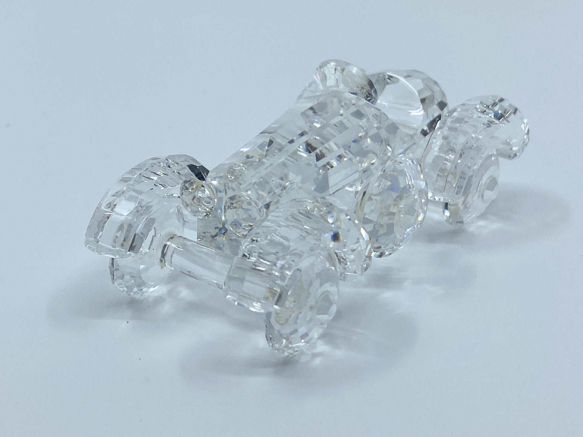 A stunning, clear crystal vehicle made to resemble 20th-century cars that features rounded wheel edges and a sleek single seat. Swarovski backstamp. This item has its original box. Dimensions of the box: 5"H x 3.25" dia. Excellent condition without damage.