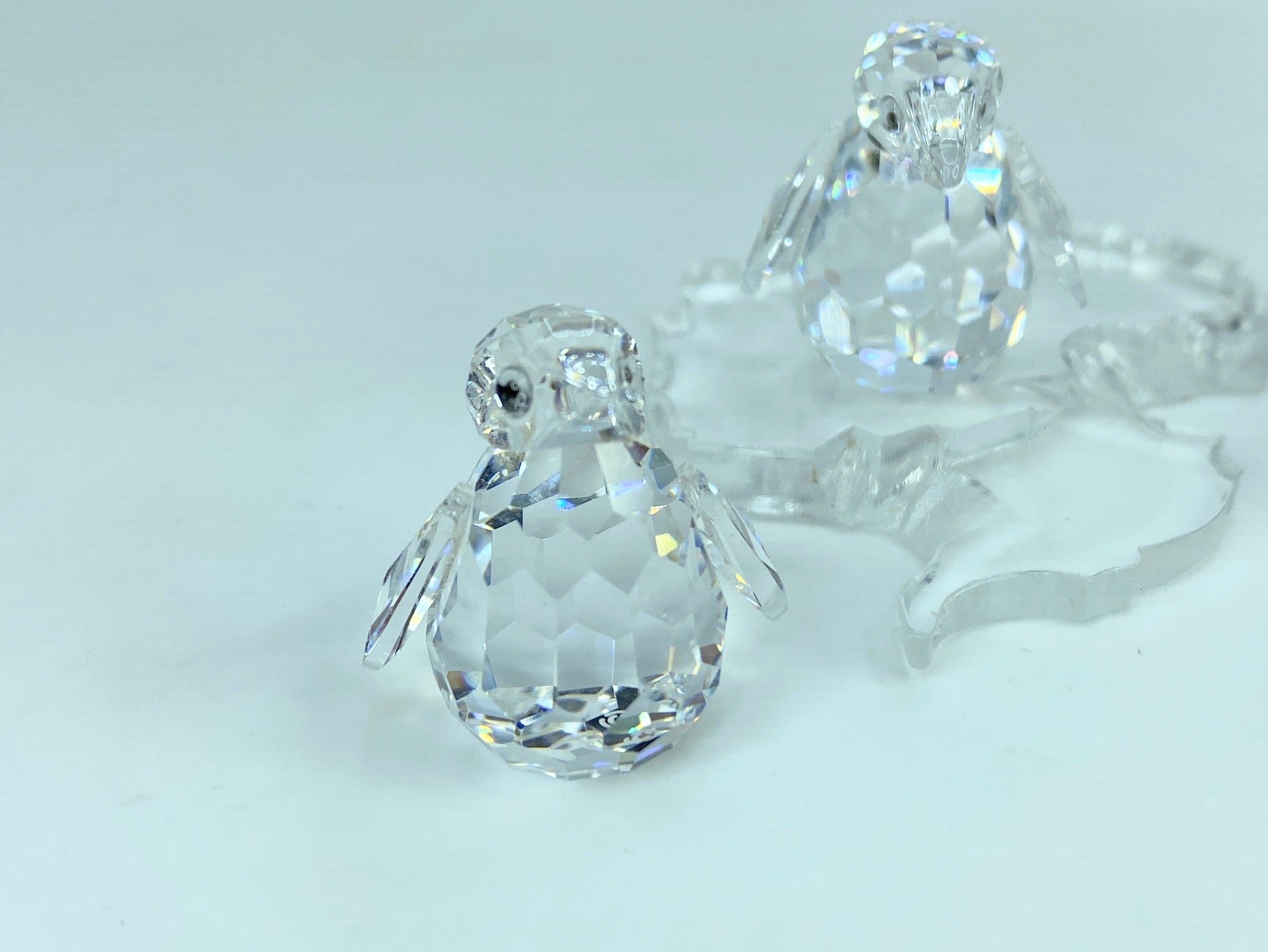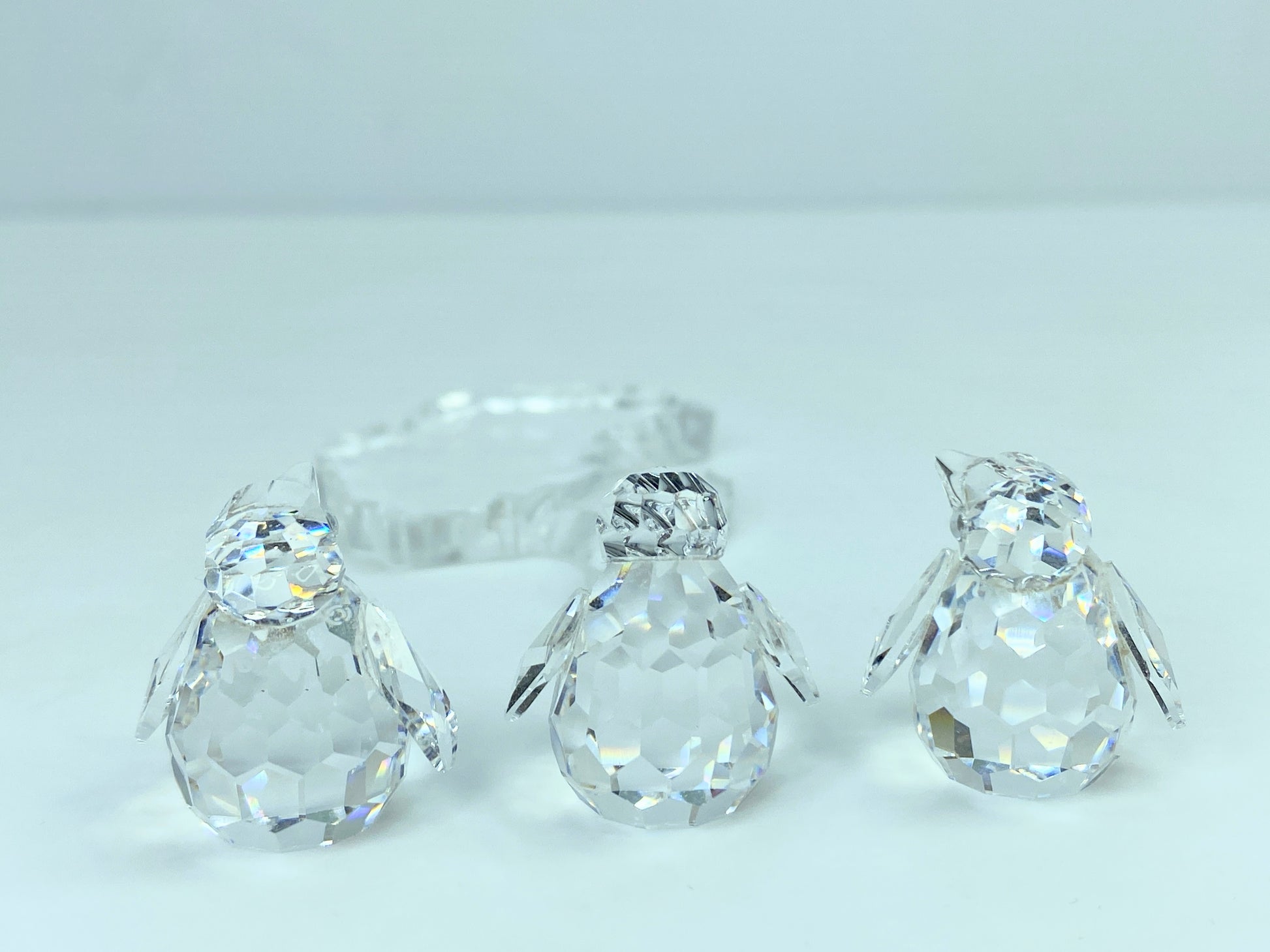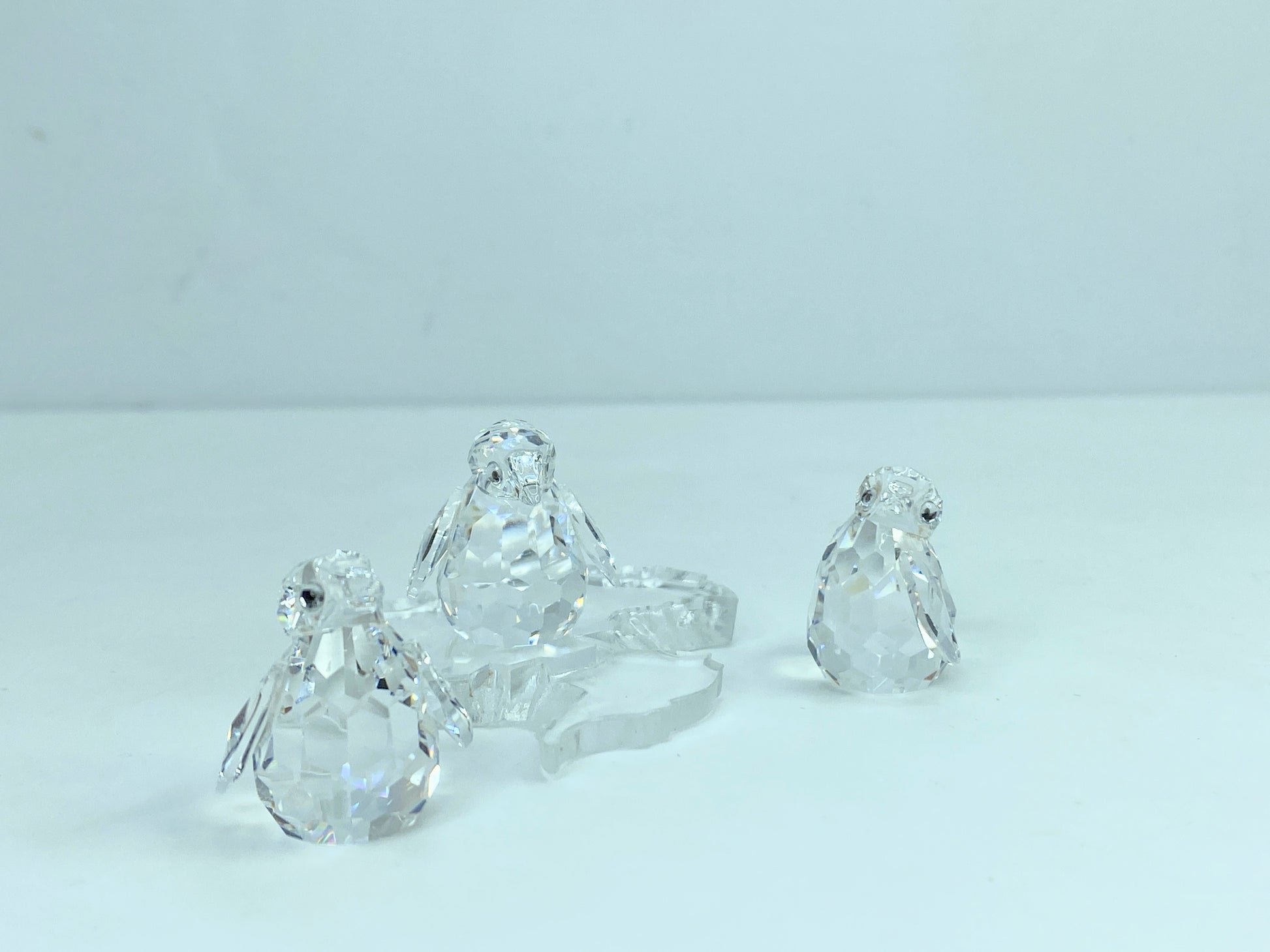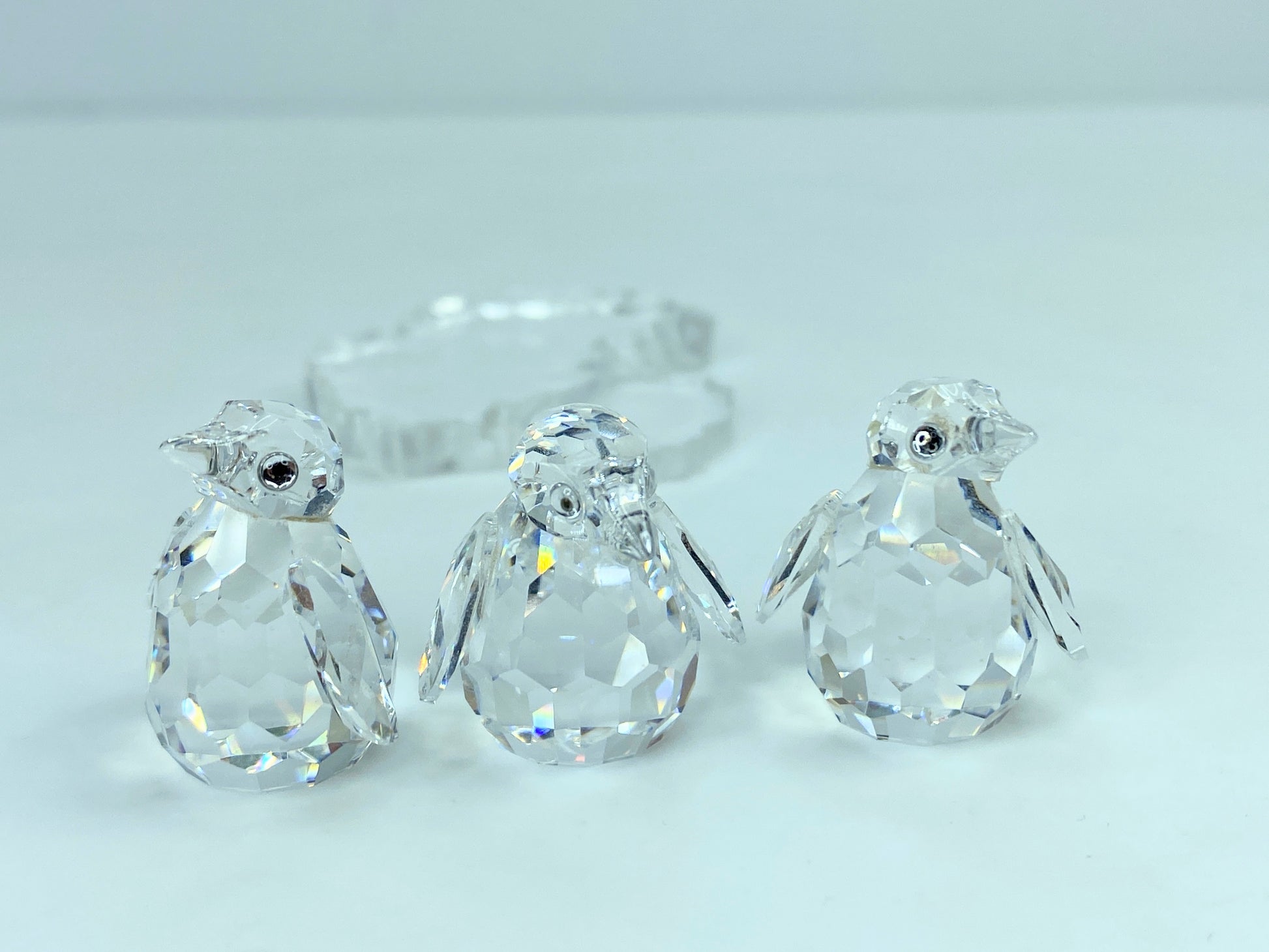 The set of three baby penguins that waddle around on the South Pole is made of clear faceted crystal with Jet crystal eyes. They come with a plastic base shaped like the Antarctic continent.