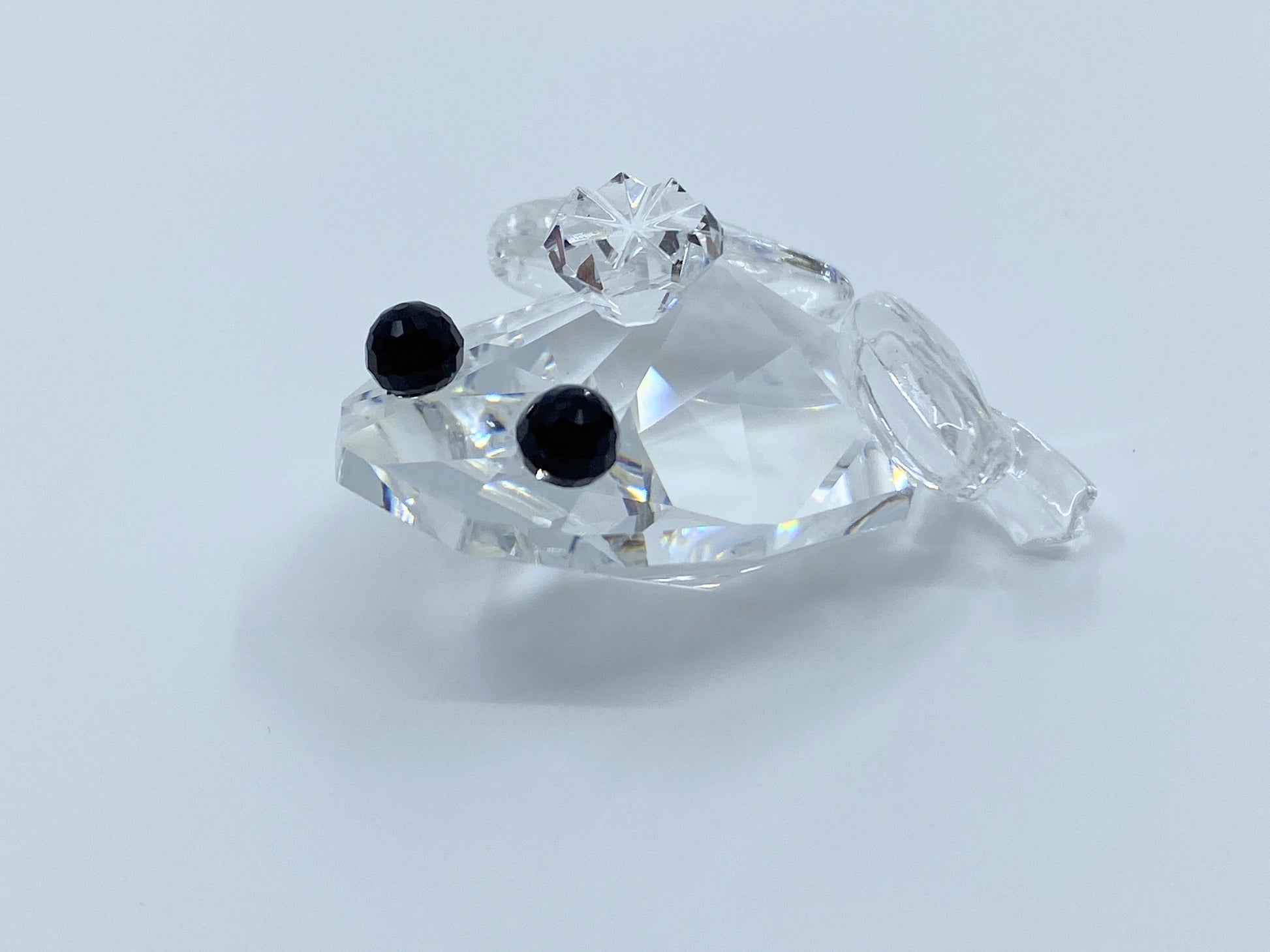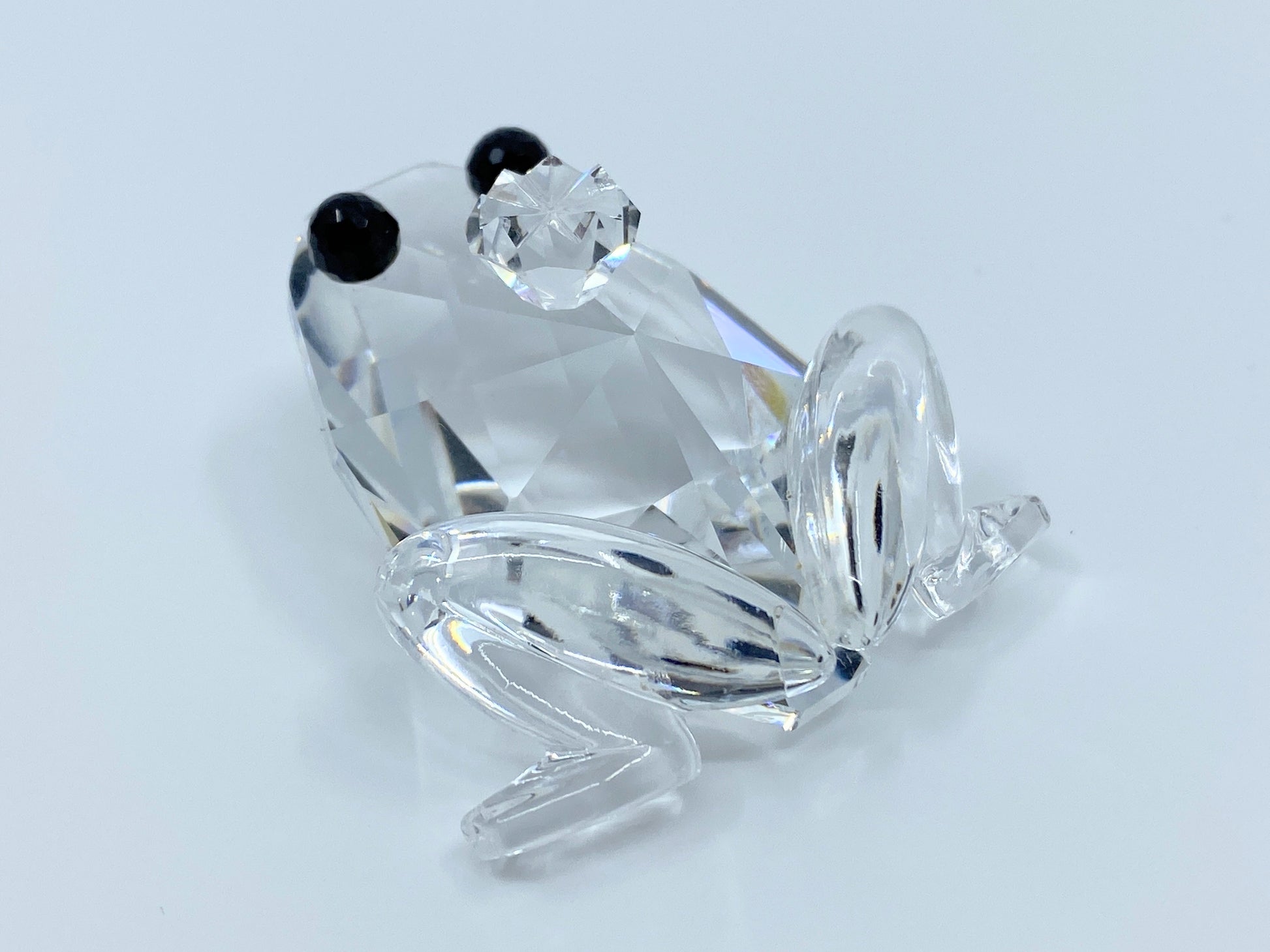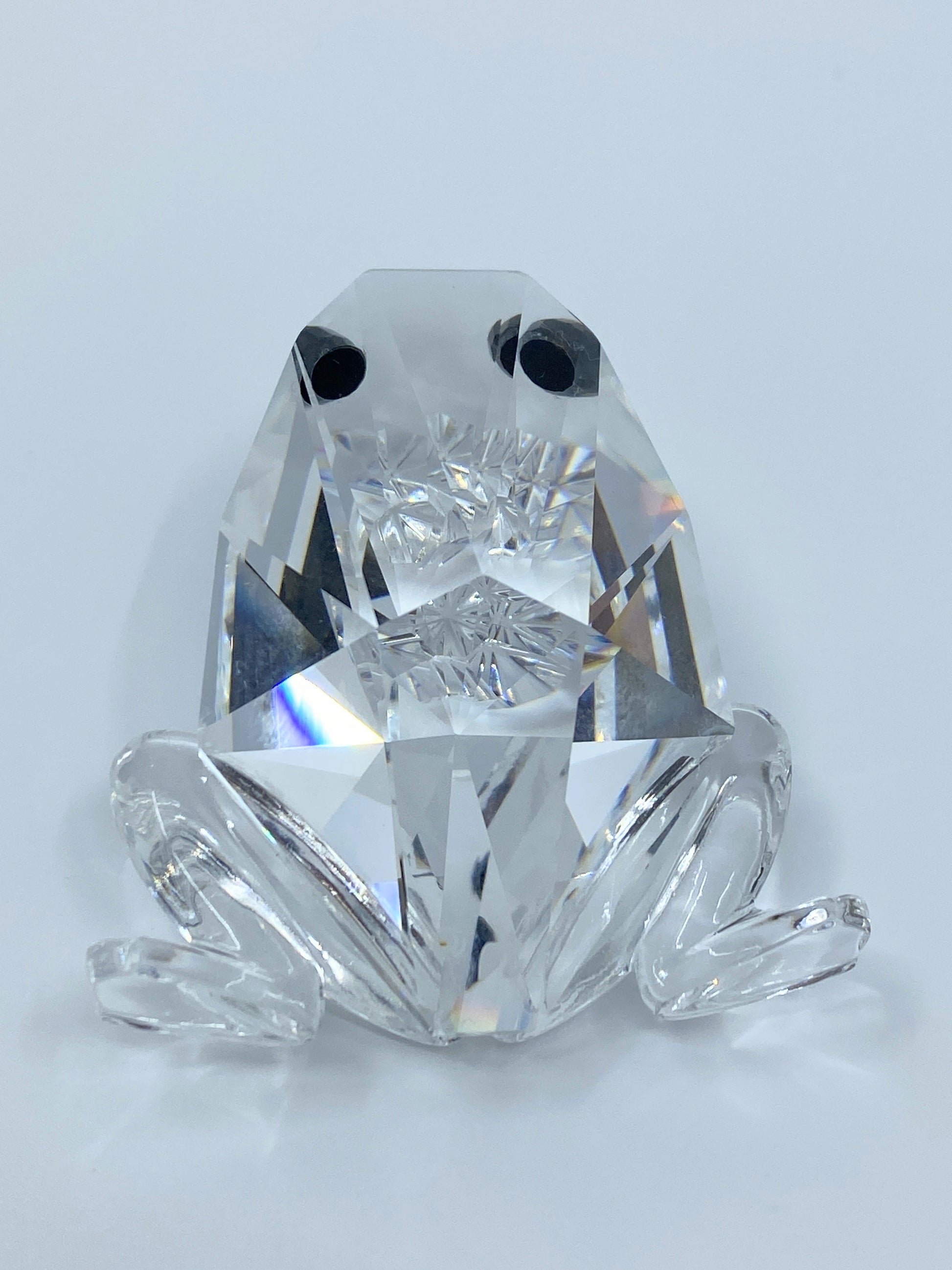 This Swarovski crystal Prince Frog with black eyes was a member of the “Beauties of the Lake” collection. Variation 2 of the Prince Frog was introduced in 1985 as a design change. The only difference is the later variation has black eyes rather than clear. This Prince Frog can have either the block SC mark or the swan logo as it did not retire until 1991.