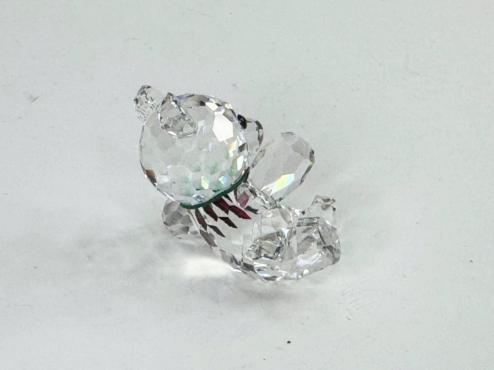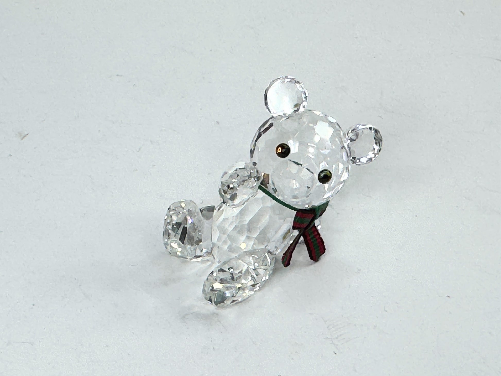 This retired Swarovski Crystal Kris Bear was part of the "When We Were Young" theme. Kris is wearing a ribbon of green and red fabric around his neck, and was the first time Swarovski had used fabric on one of their designs.