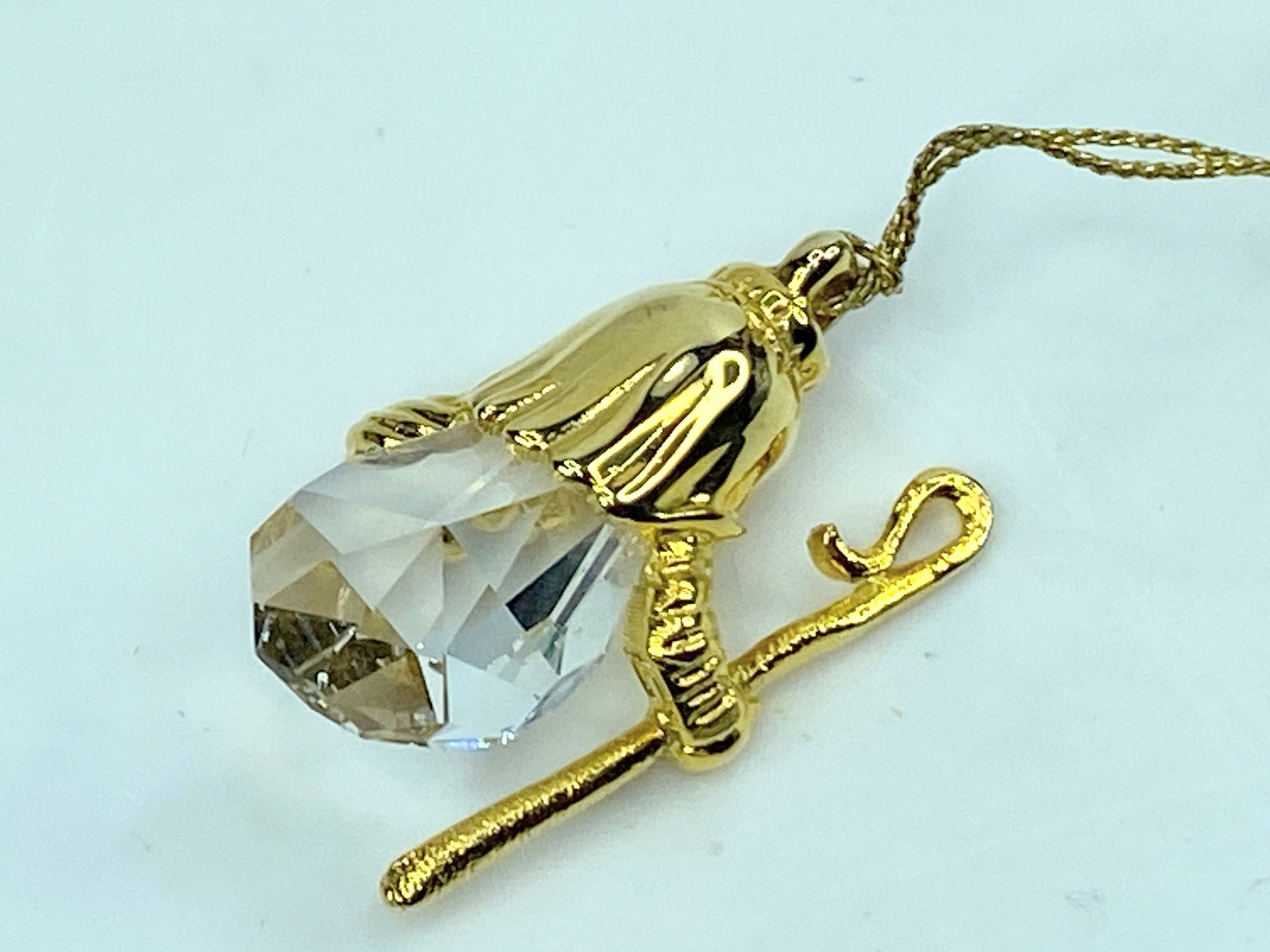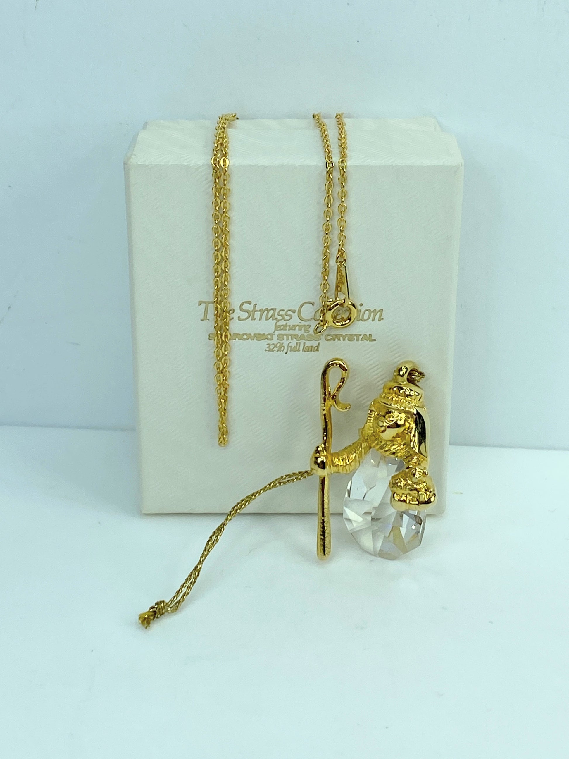 Rare Find. The Strauss Collection. This is a sparkling tree ornament that can be worn as a necklace, an 18-inch Goldstone chain included. This Swarovski Strauss is 32% full lead crystal and finished in 24 kt gold. Can be used as a tree ornament or a festive pendant (No Chain Included). Measures approximately 3/4" Wide x 1 1/2 Long. No chips or cracks. Please see all pictures, for they are part of the description. It comes with the original box.