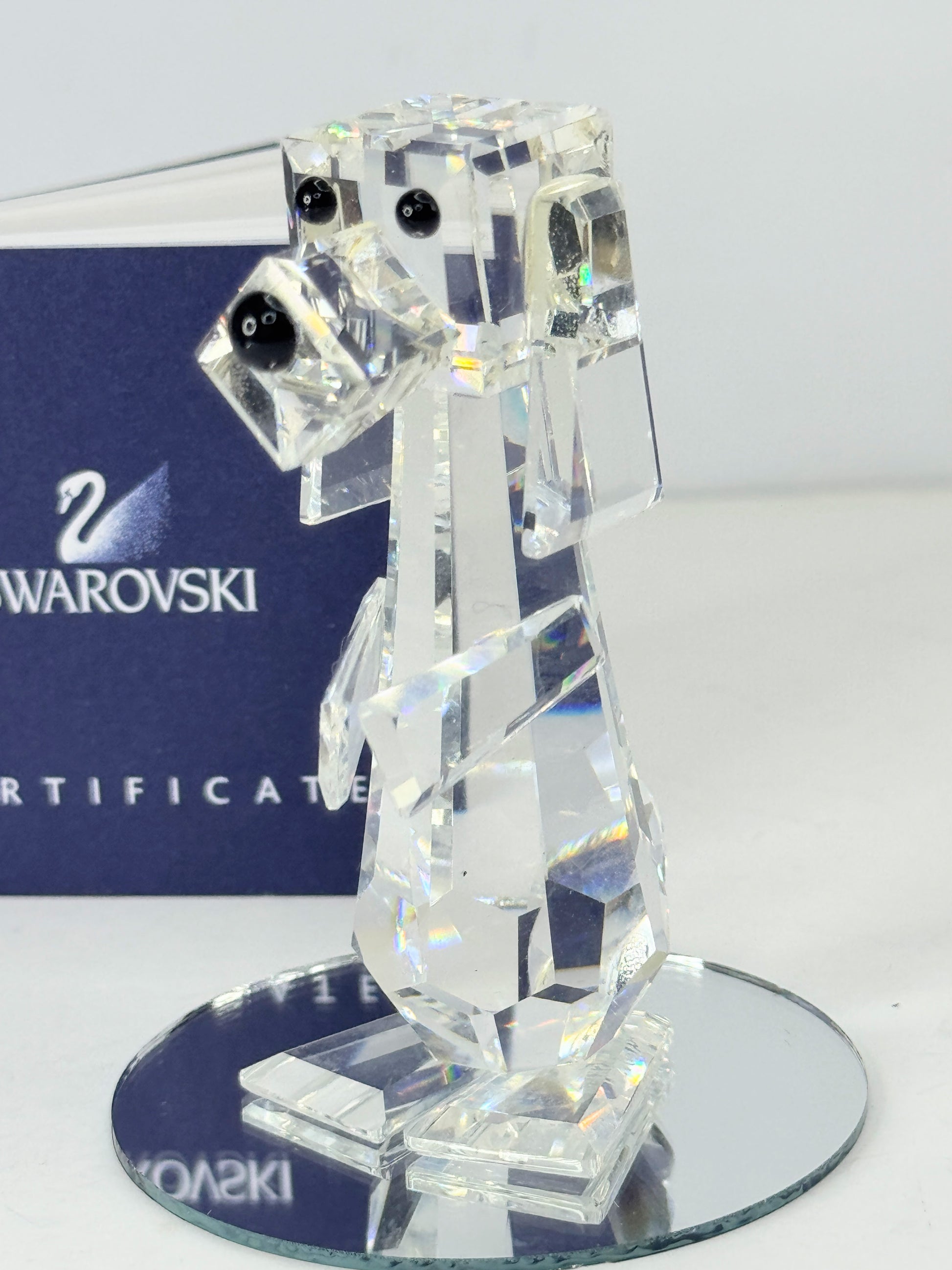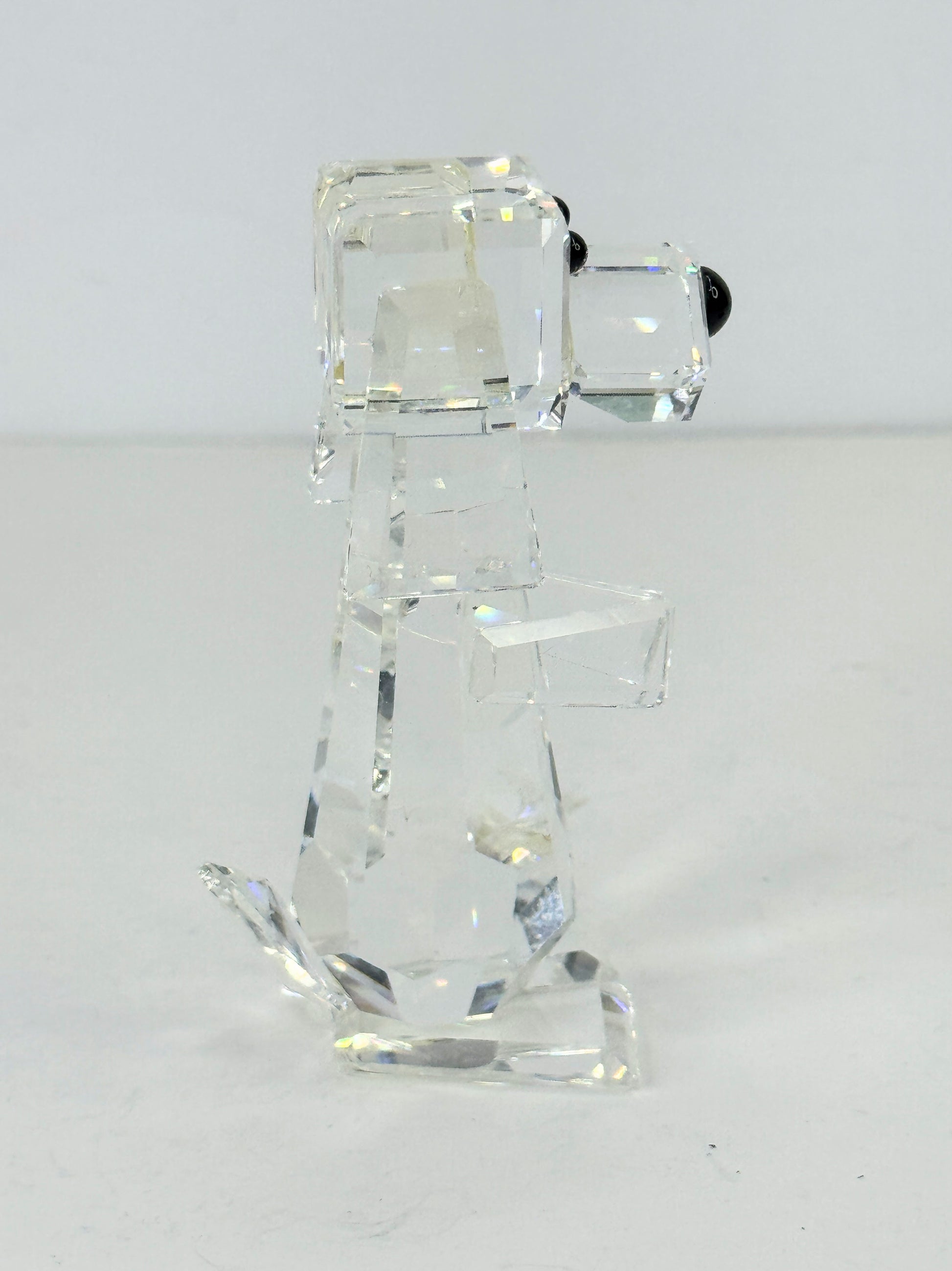 This retired Swarovski crystal tall dog is often called 'Pluto'. He has a clear crystal body, with black crystal eyes and a nose. Comes in original box.