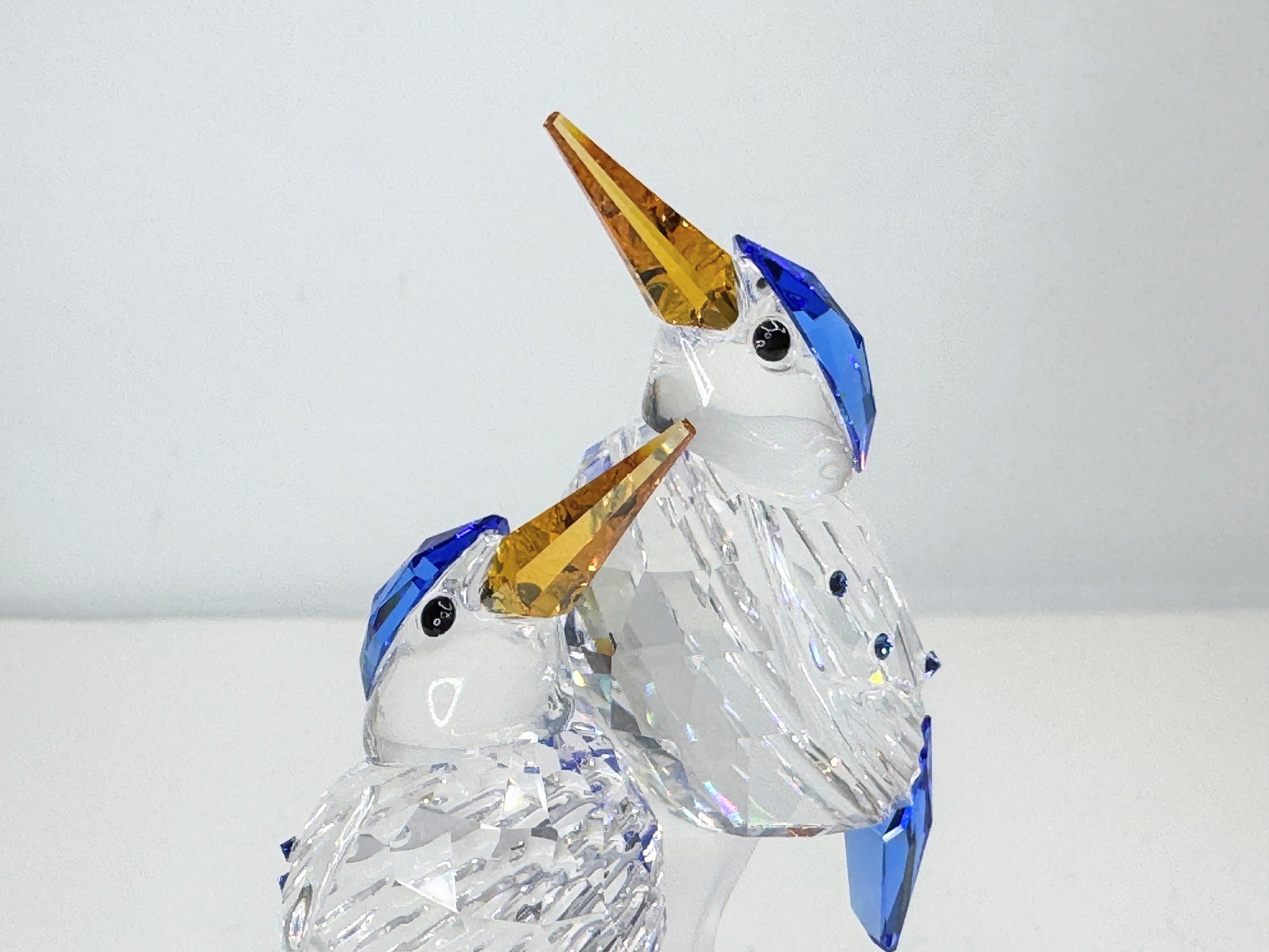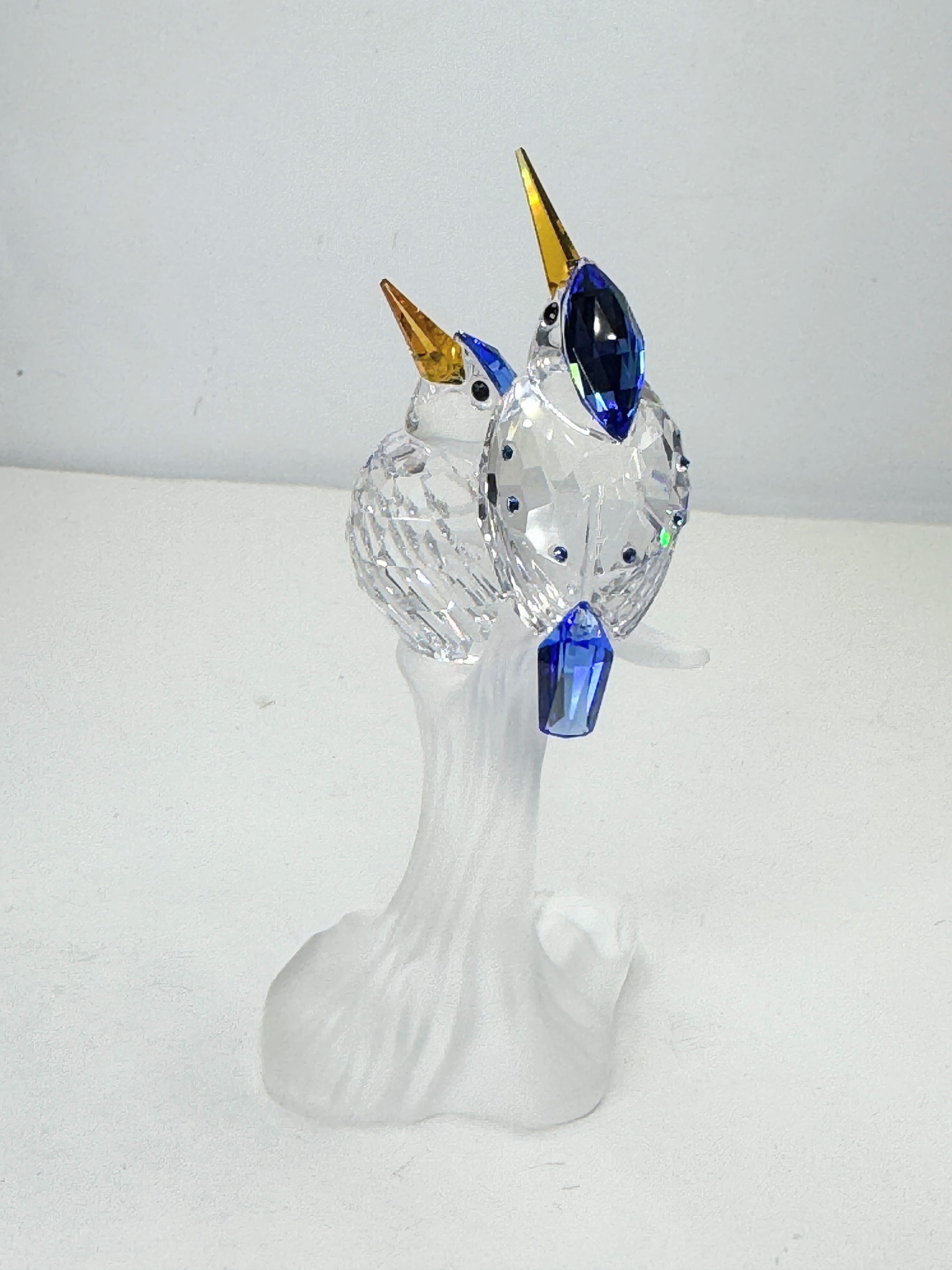 Produced in Austria in 2003 and retired in 2012, it measures 3 5/8 in high and features a pair of Kingfishers in clear faceted crystal bodies, black eyes, sapphire blue hoods, tails, back accents, and Topaz crystal beaks. The two are perched on a matte crystal branch. A Swarovski swan logo is on the base.
