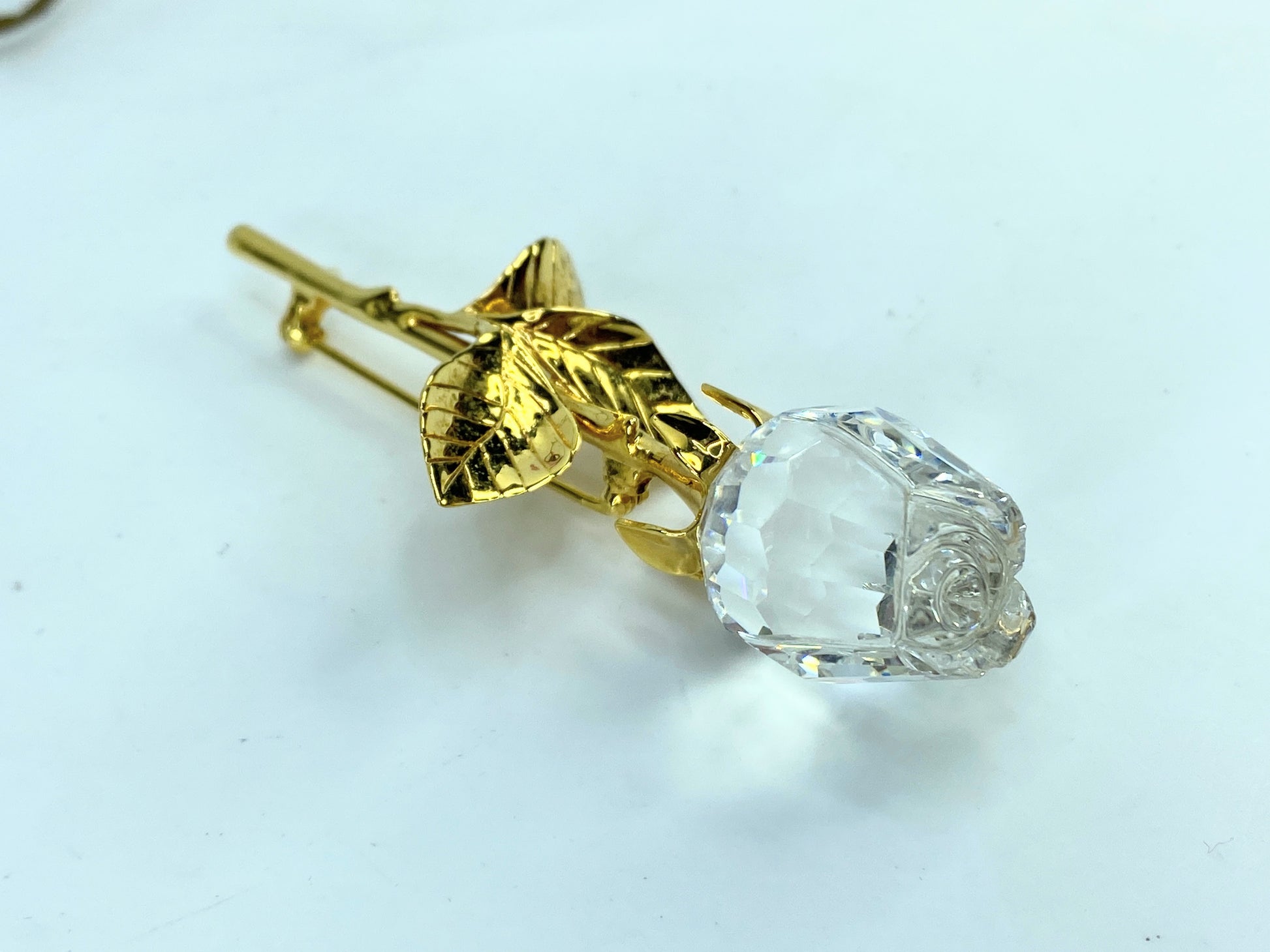Gorgeous Swarovski Crystal gold tone rose stem with Crystal Glass Rose Flower pin measures 3 3/8 inches by 1 3/4 inches. What detail in glass is the rose site at the top of the gold-tone stem, a perfect pin to accent many an outfit. Swarovski crystal is the best in the world, and this is a wonderful piece.