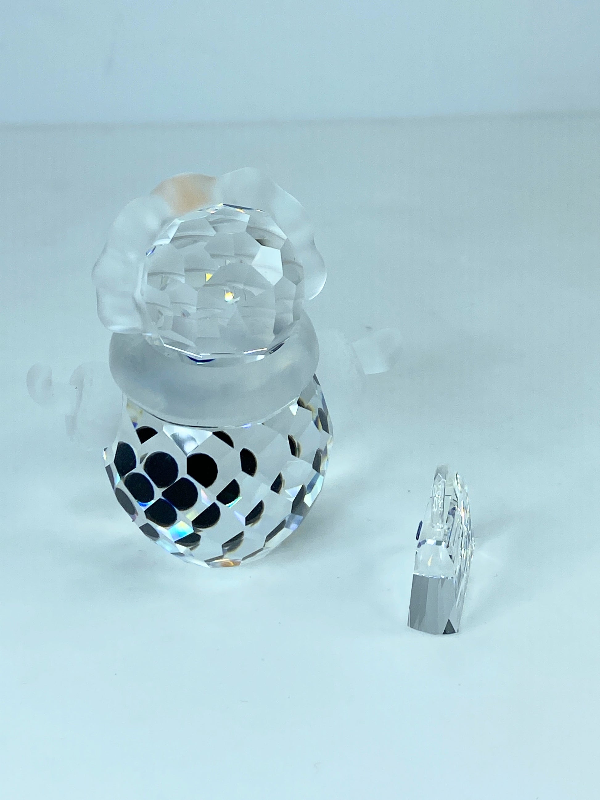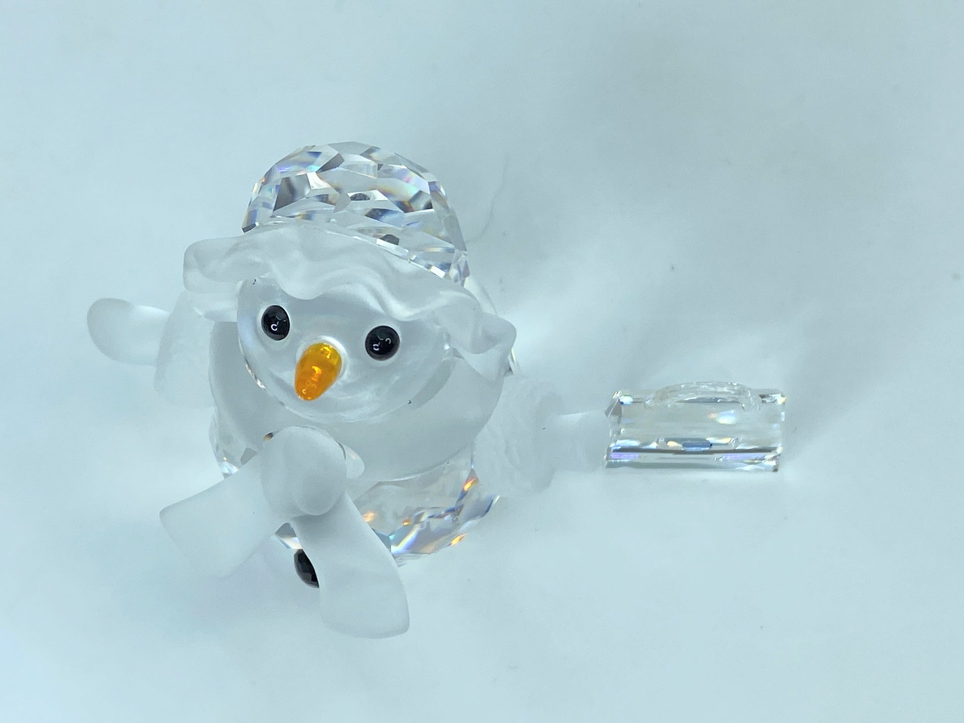The figurine is made out of clear facetted crystal with jet black eyes and buttons It has a frosted crystal scarf and an orange crystal carrot nose. It is about 53mm tall (2.1 inches)