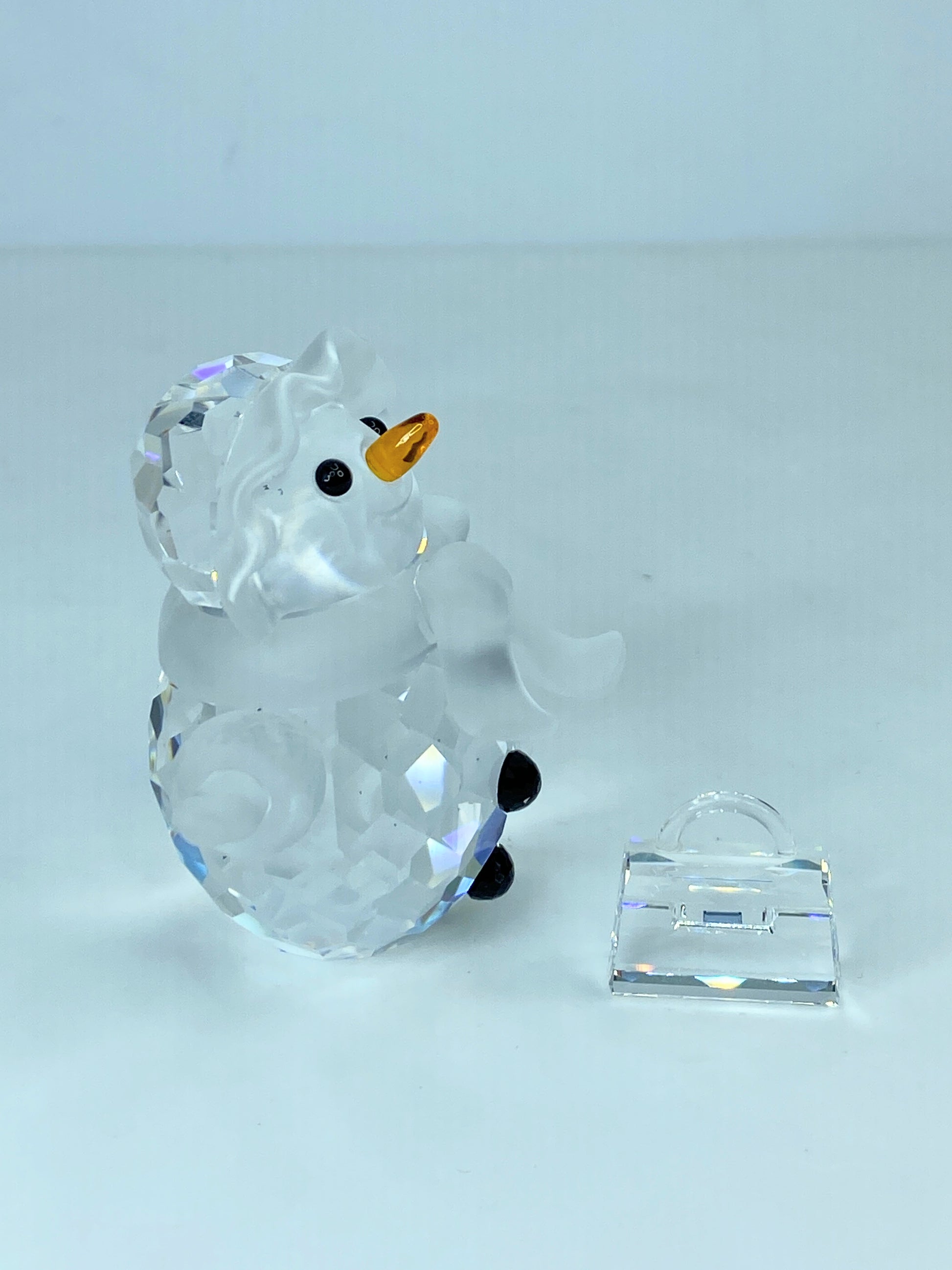The Snowman comes with labeled Swarovski box and with certificate. The lady figurine is more rare than the snowman and comes with her own little purse