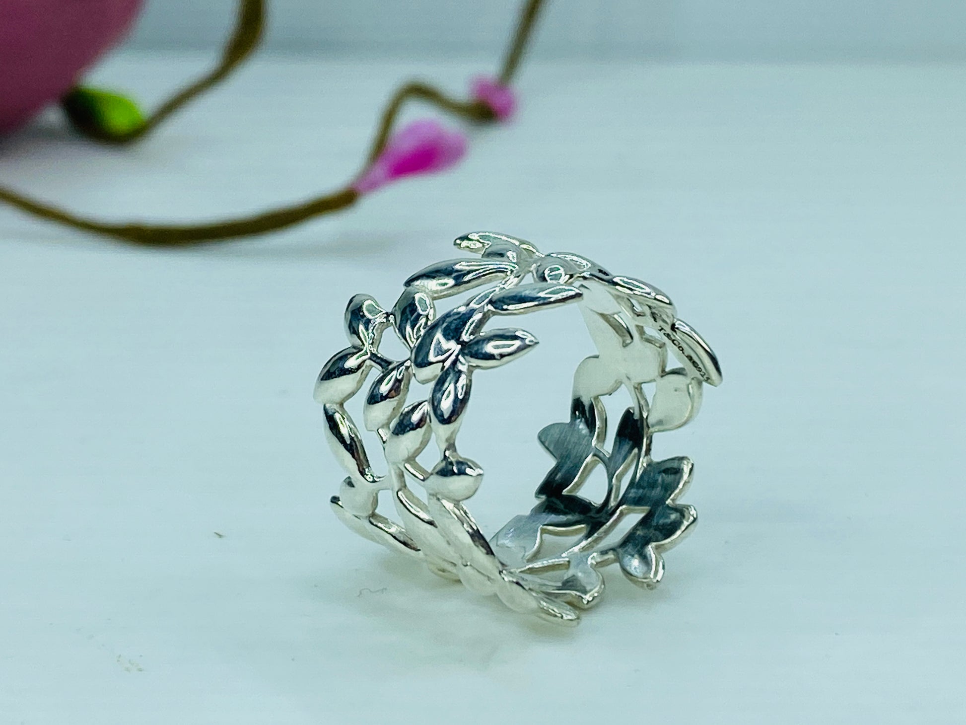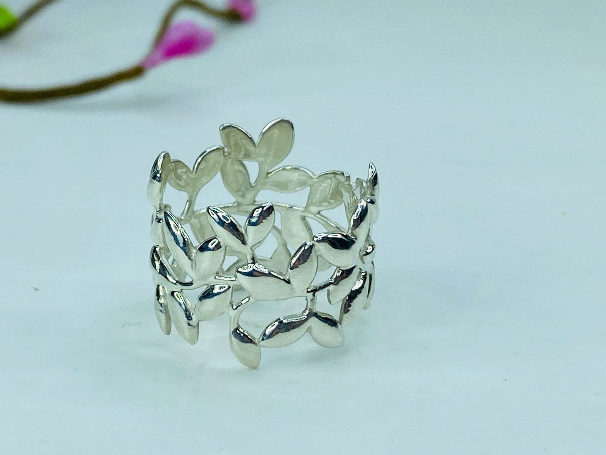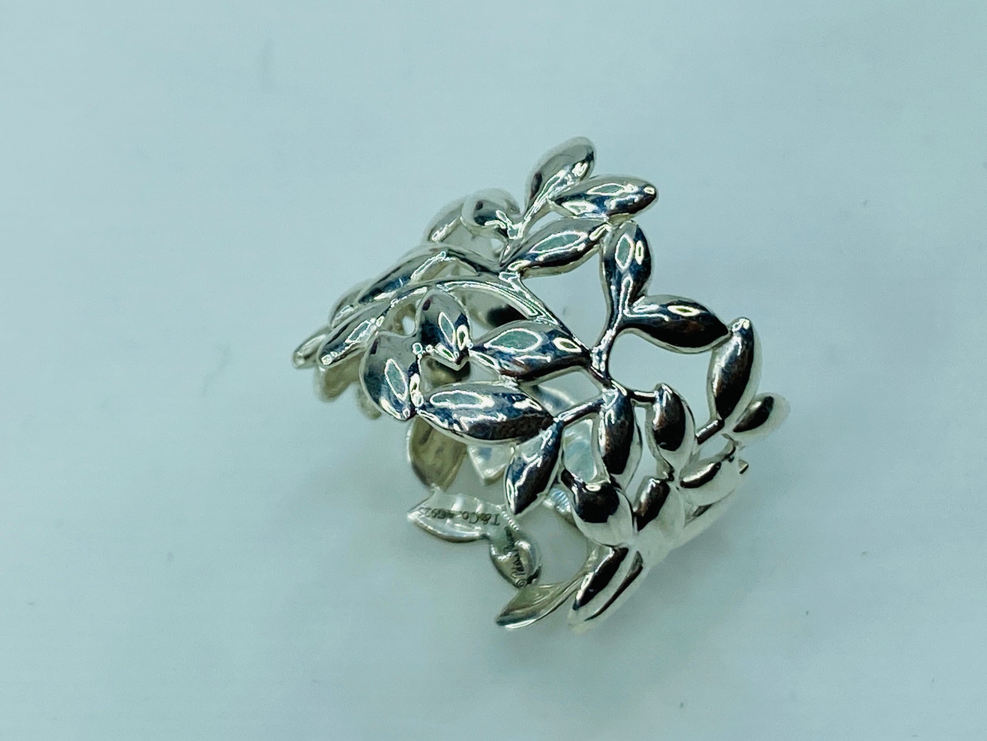 Tiffany & Co. Paloma Picasso Olive Leaf Ring in Sterling Silver. With beautifully sculpted leaves in sterling silver, Paloma honours the olive branch, a symbol of peace and abundance. Band ring in sterling silver. Original designs copyrighted by Paloma Picasso.