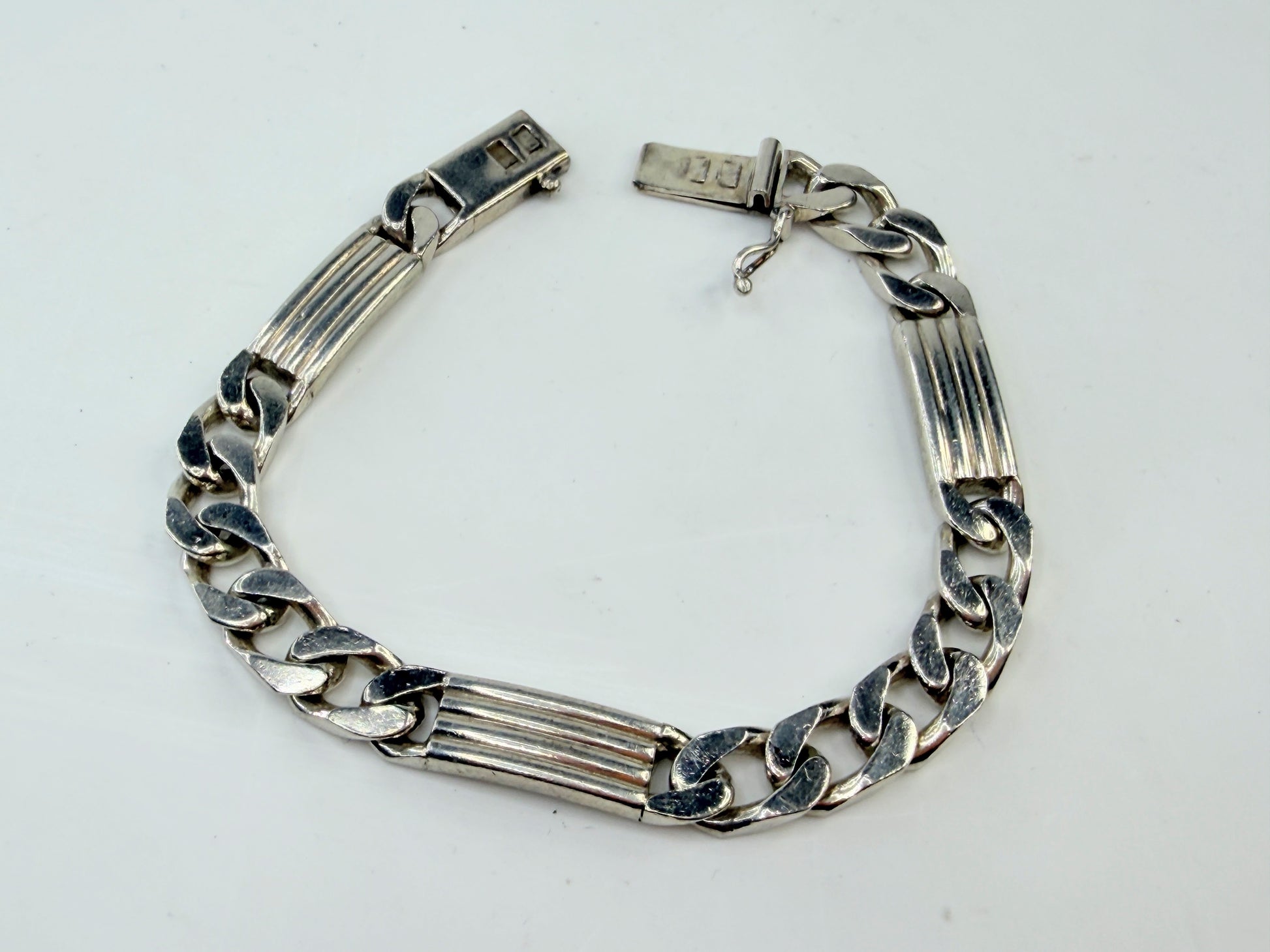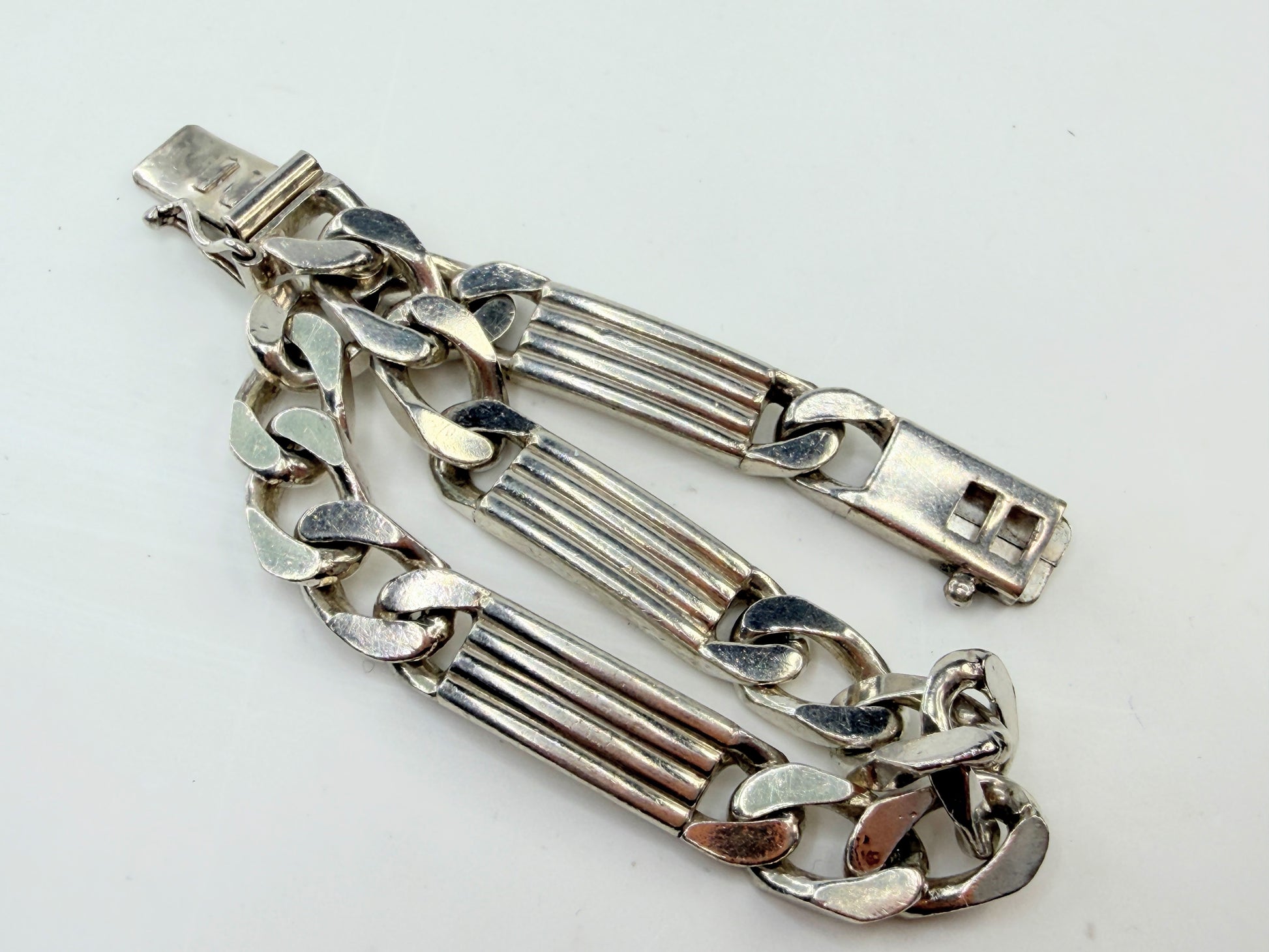 This vintage Tiffany & Co. bracelet features a sculptural ribbed bar motif integrated into curved link construction, creating a balanced interplay of structure and fluid movement. The sterling silver surfaces show the soft reflective character associated with aged Tiffany silver, while the dimensional ribbed elements add architectural presence and visual depth on wrist. The design reflects late 20th century Tiffany modernist styling, emphasizing weight, clean line geometry, and everyday luxury wearability rather than ornamentation.