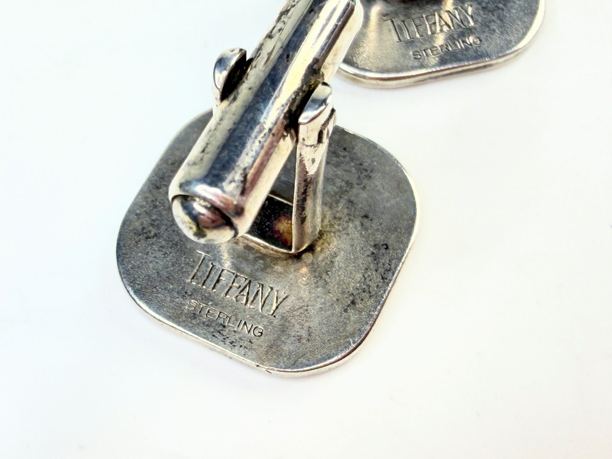 An authentic pair of Tiffany sterling silver cufflinks executed in a squared cushion profile with engraved geometric line detailing characteristic of Art Deco influence. The recessed rectangular center panel is framed by linear borders, offering subtle dimensional contrast. Reverse hallmarks read TIFFANY STERLING. The pair shows visible patina and surface wear consistent with age, while hinges and toggles remain functional. Includes Tiffany pouch.