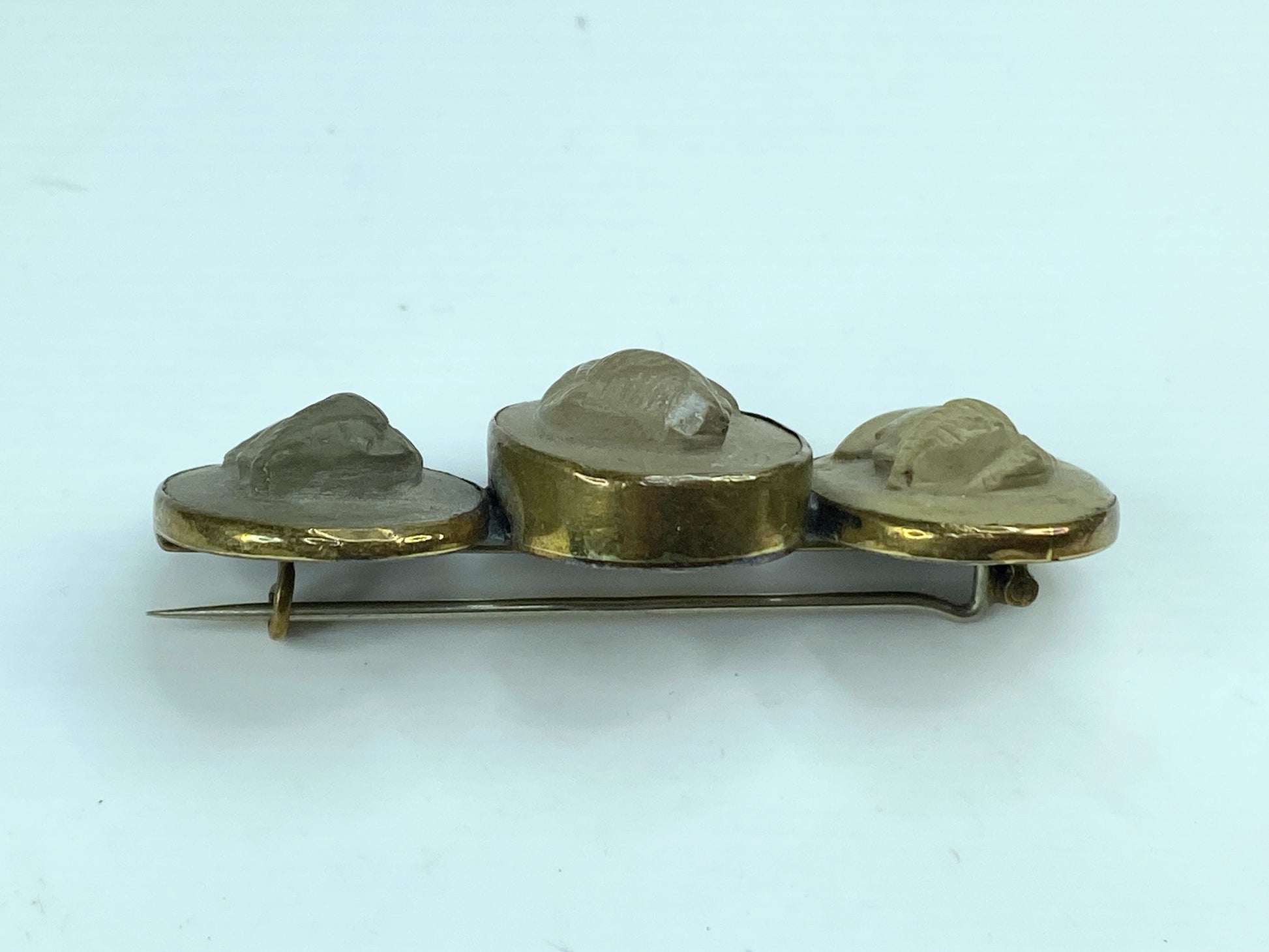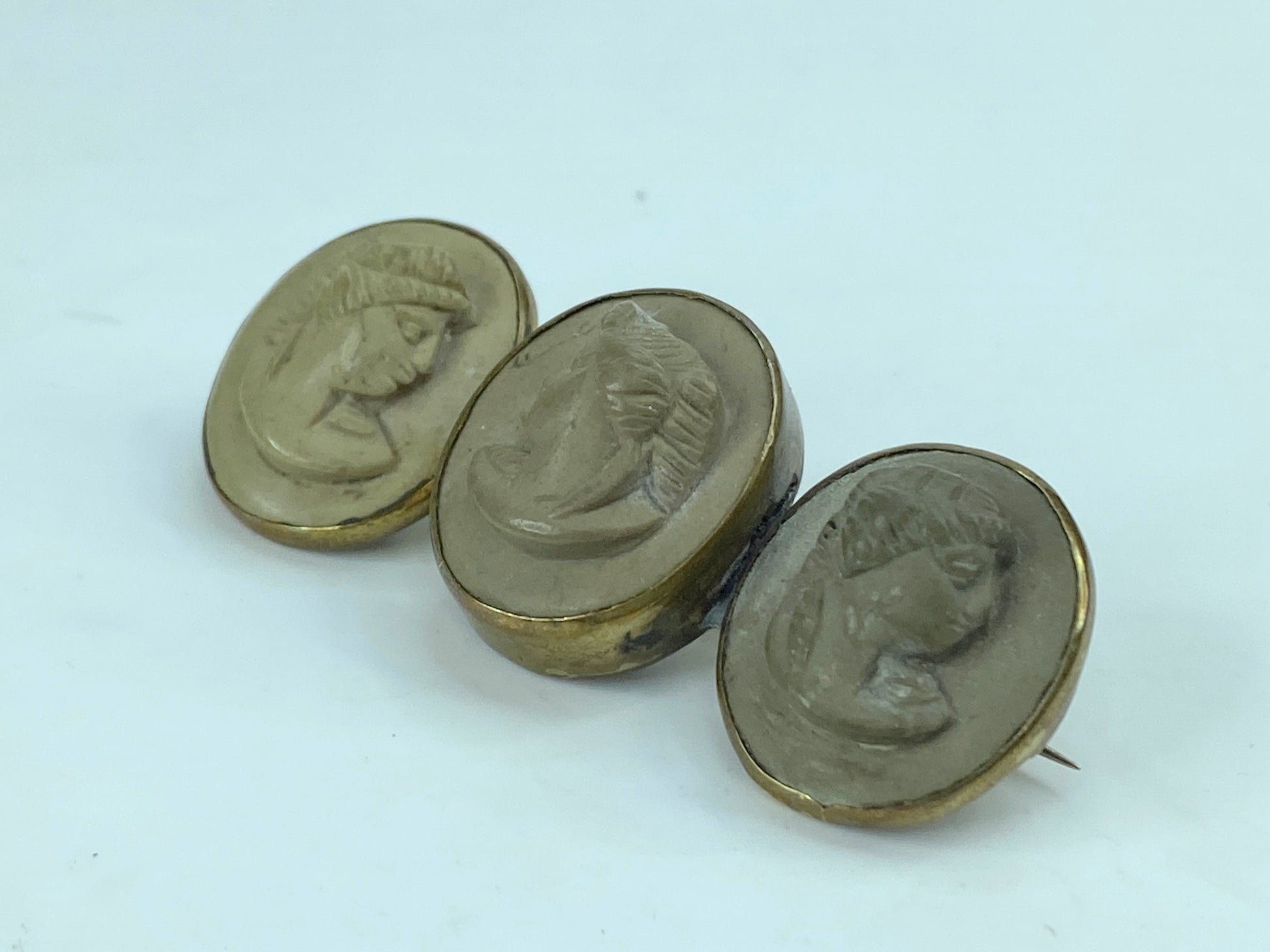 Beautiful mid-1800s Victorian lava cameo brooch. Set in gilt metal. Unmarked. Made in Italy.
