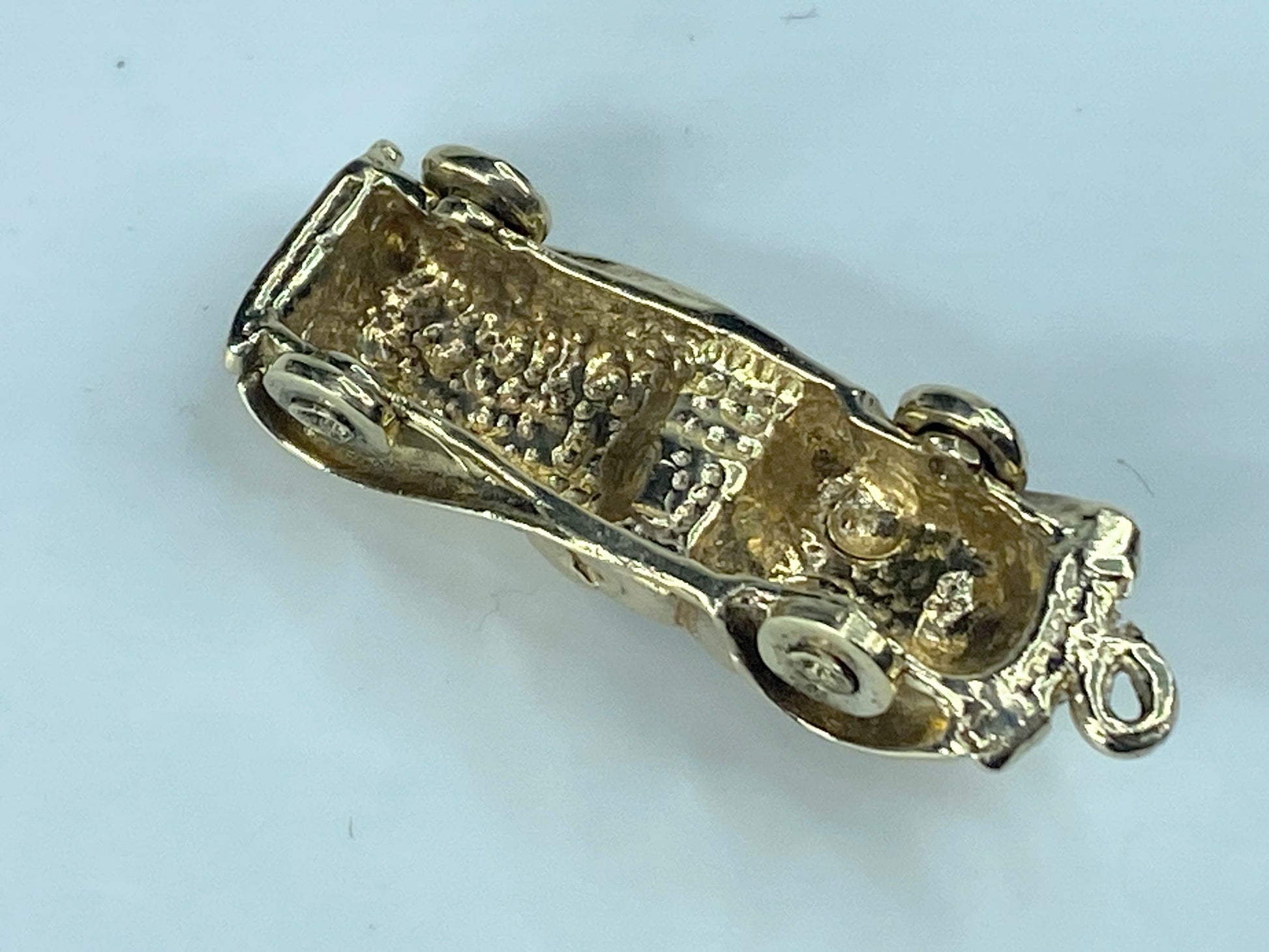 Rare Vintage 14KT Gold Roadster Deusenberg Automobile Charm. Exquisite, Well-Benched Workmanship that is ensconced in the details that comprise this Amazing Old-School Piece of Bling. This Vintage beauty comes replete with Ruby cabochon headlights, headrests, and spare tires. This is a true collector's Item that Hales from the 1940s or 50s—this stunner measures approximately 1.25" in Length and 0.25" in Height. Weight 5.6 grams, no hallmark, tested for 14K