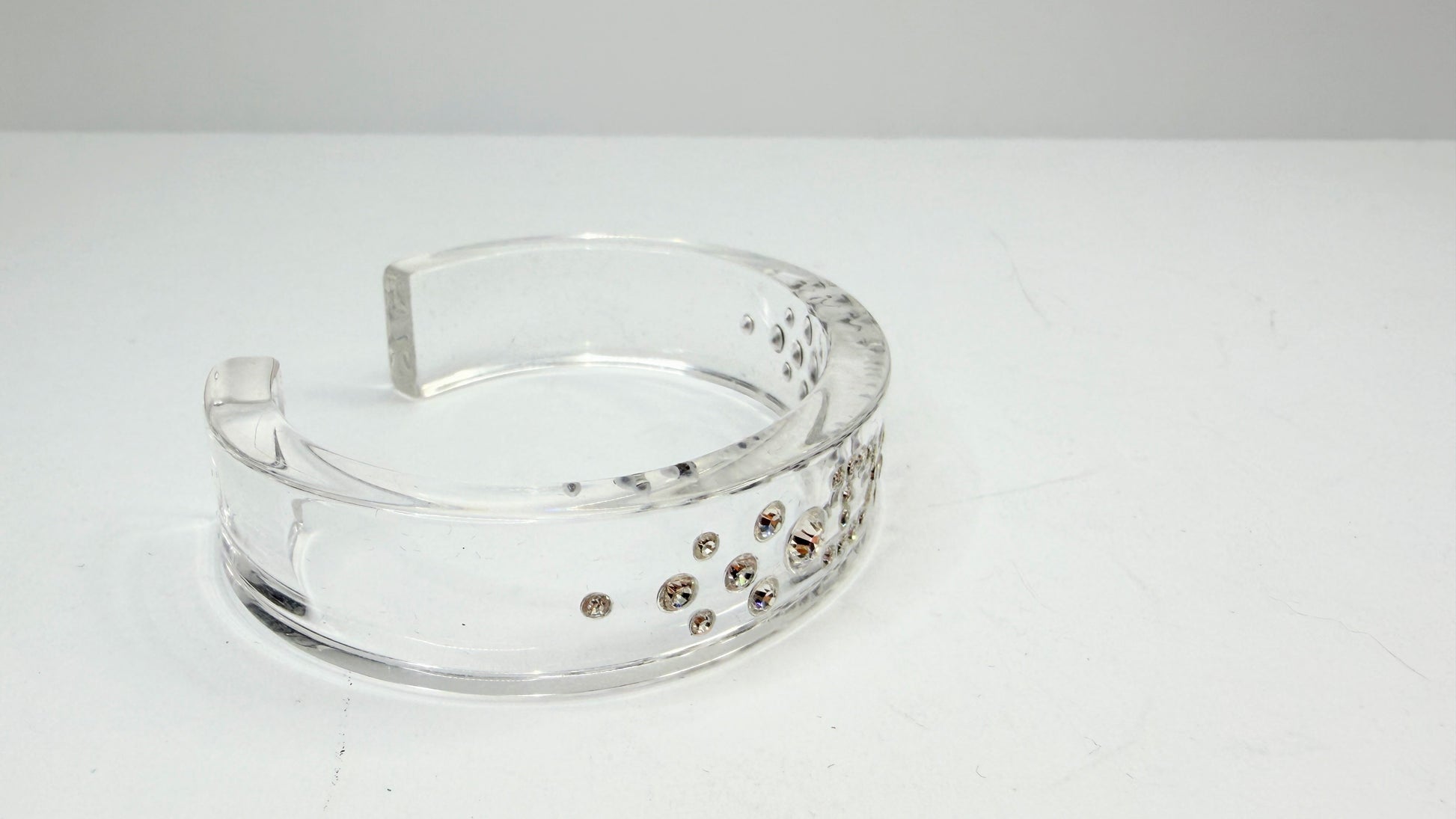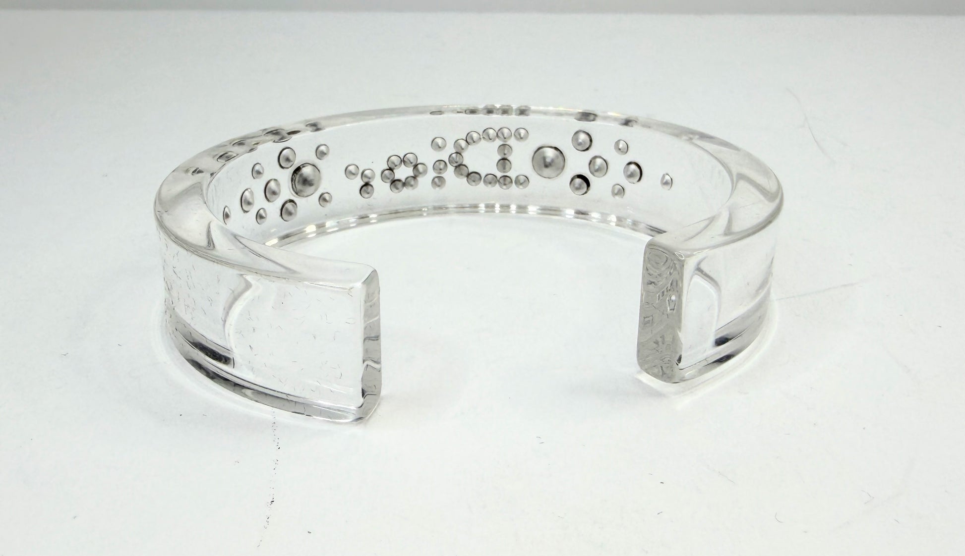 Vintage Christian Dior clear lucite cuff bracelet from the John Galliano era, featuring a crystal-set Dior logo embedded within a transparent rigid cuff form. The open cuff construction allows easy wear, while the faceted crystals add light-catching detail against the minimalist clear body. A sculptural Bijoux piece representative of the Galliano-era Dior accessories. Includes original Bijoux Christian Dior box.