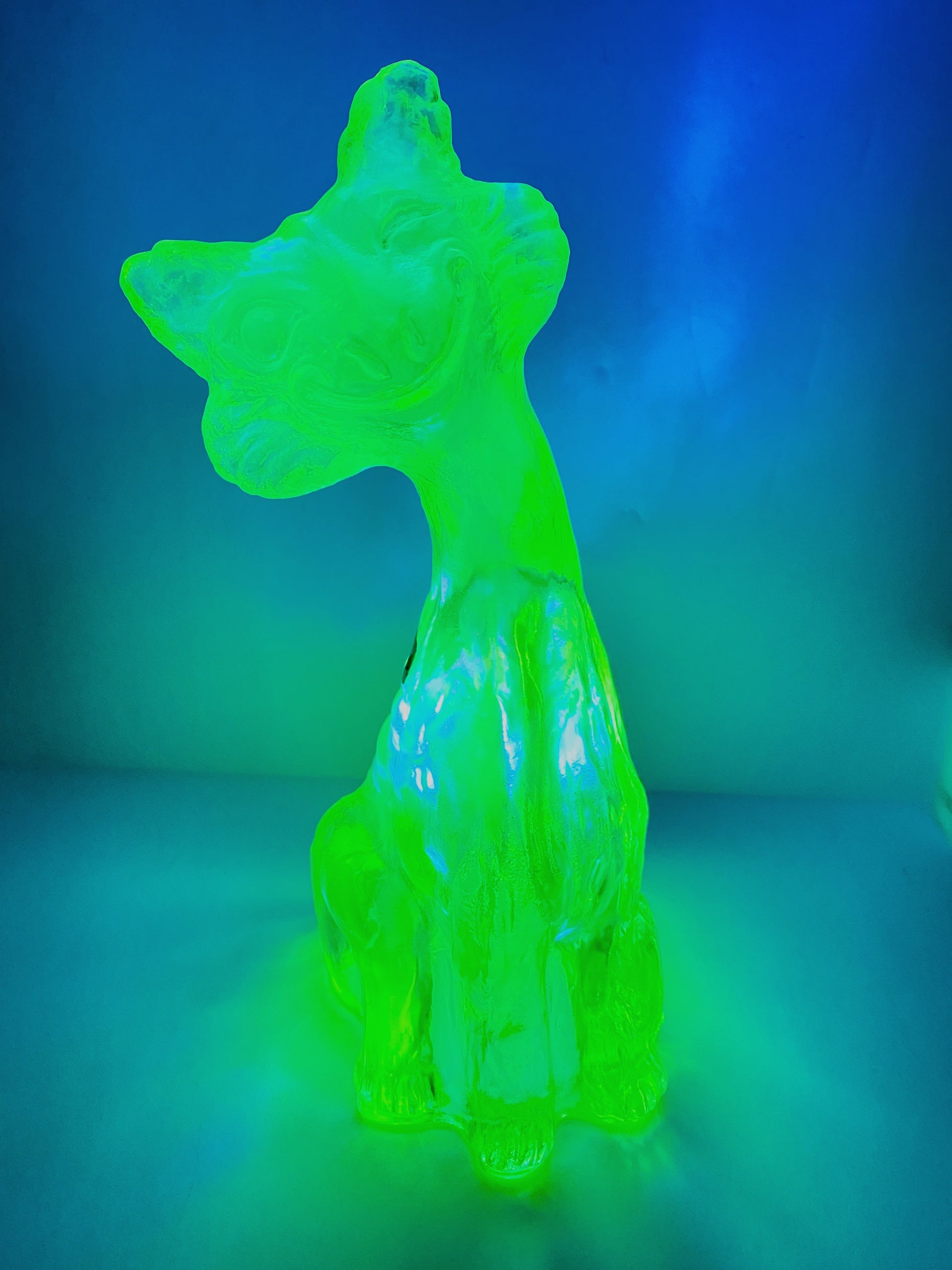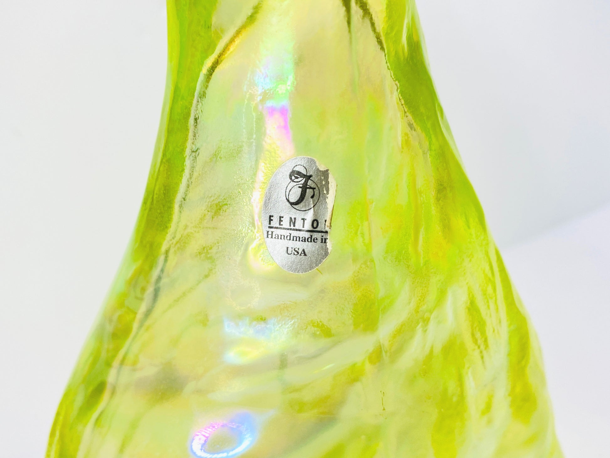 Marked with the original Fenton label. A great piece for glass collectors, collectors of uranium glass, or as a display centerpiece with glowing character under UV light.