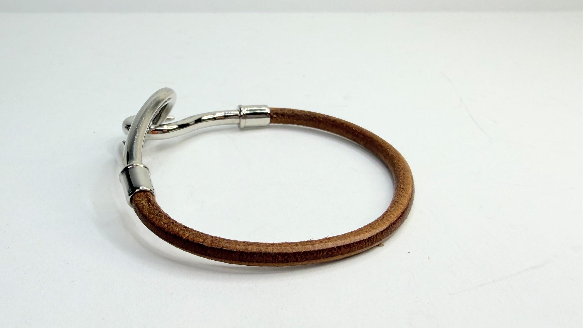 Vintage Hermès jumbo bracelet crafted in rich brown leather with the brand’s iconic oversized hook clasp in polished silver-tone metal. The minimalist cord design highlights the sculptural form of the clasp, creating a refined yet statement-making piece. A timeless Hermès accessory that balances understated luxury with bold design. No original box or accessories included.