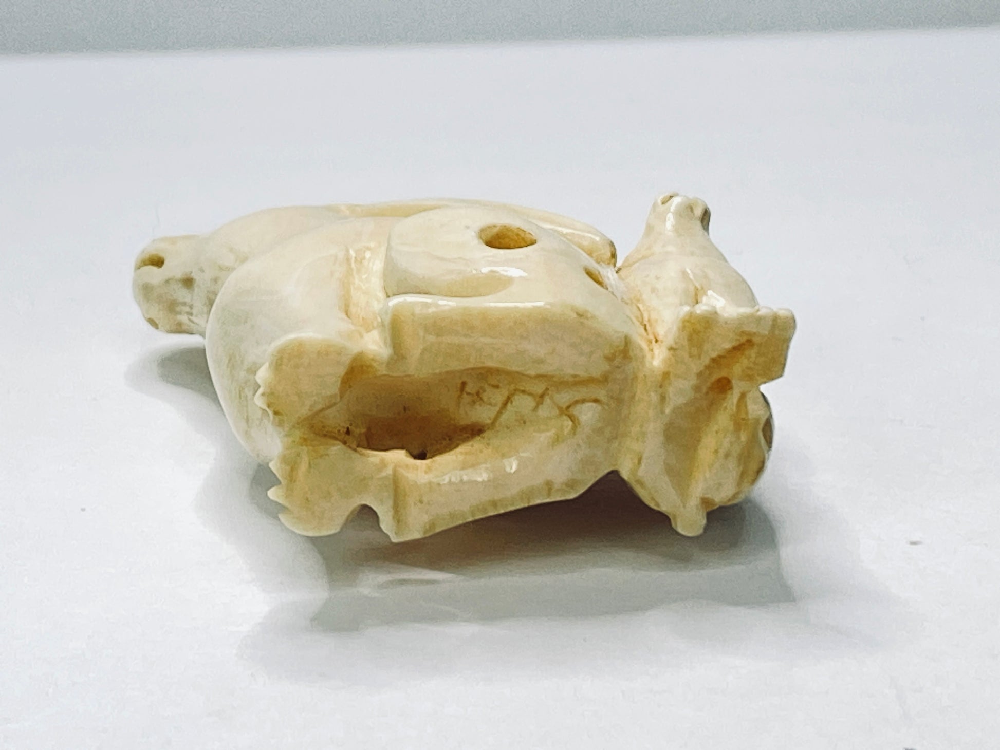 Estimated 1950–60s, artist-signed in Japanese, with two cord holes on the side of the larger rabbit for practical use as a netsuke. Measures approx. 1 5/8" tall x 1 1/4" long x 3/4" wide. Gentle age wear only. A sweet addition for netsuke or miniature animal art collectors.