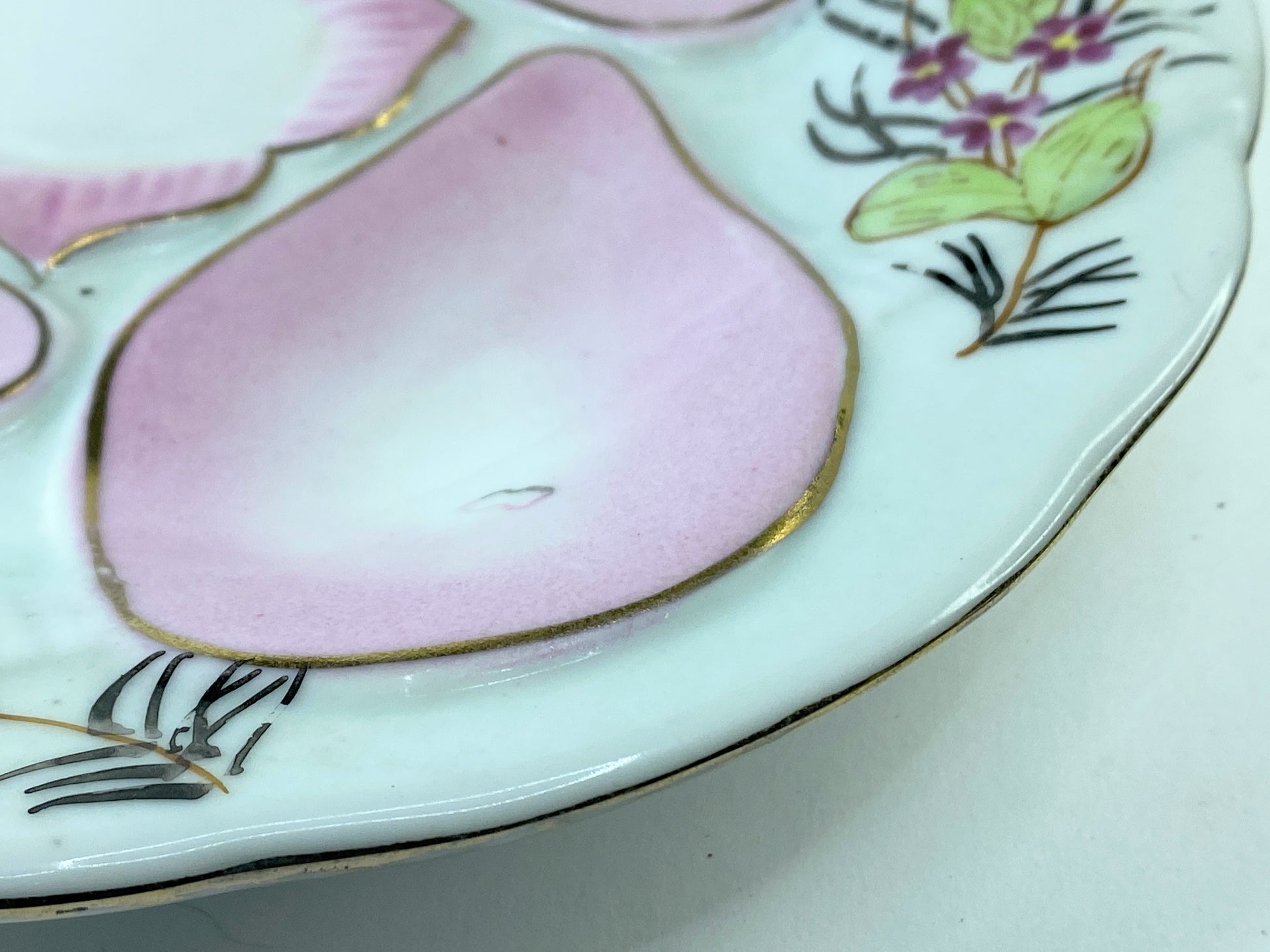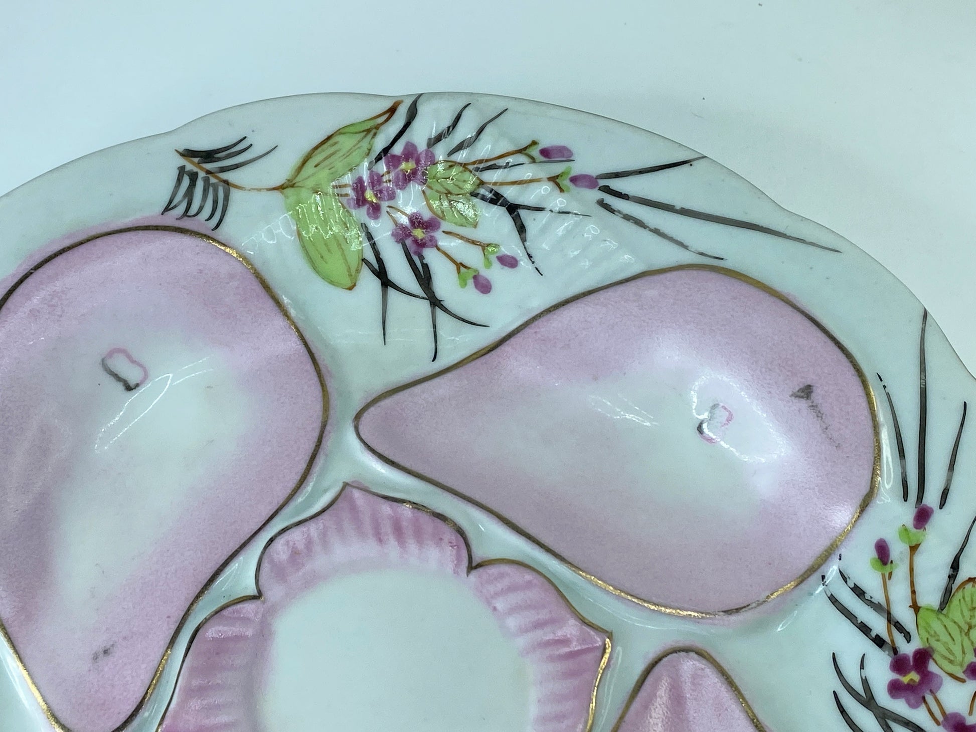 Vintage Nippon Oyster plate, hand-painted, roses, dogwood, pink, in good antique condition, Normal wear, no chips, no damage. It’s 9.0" across, 1” thick. Weighs 1.1 pounds.