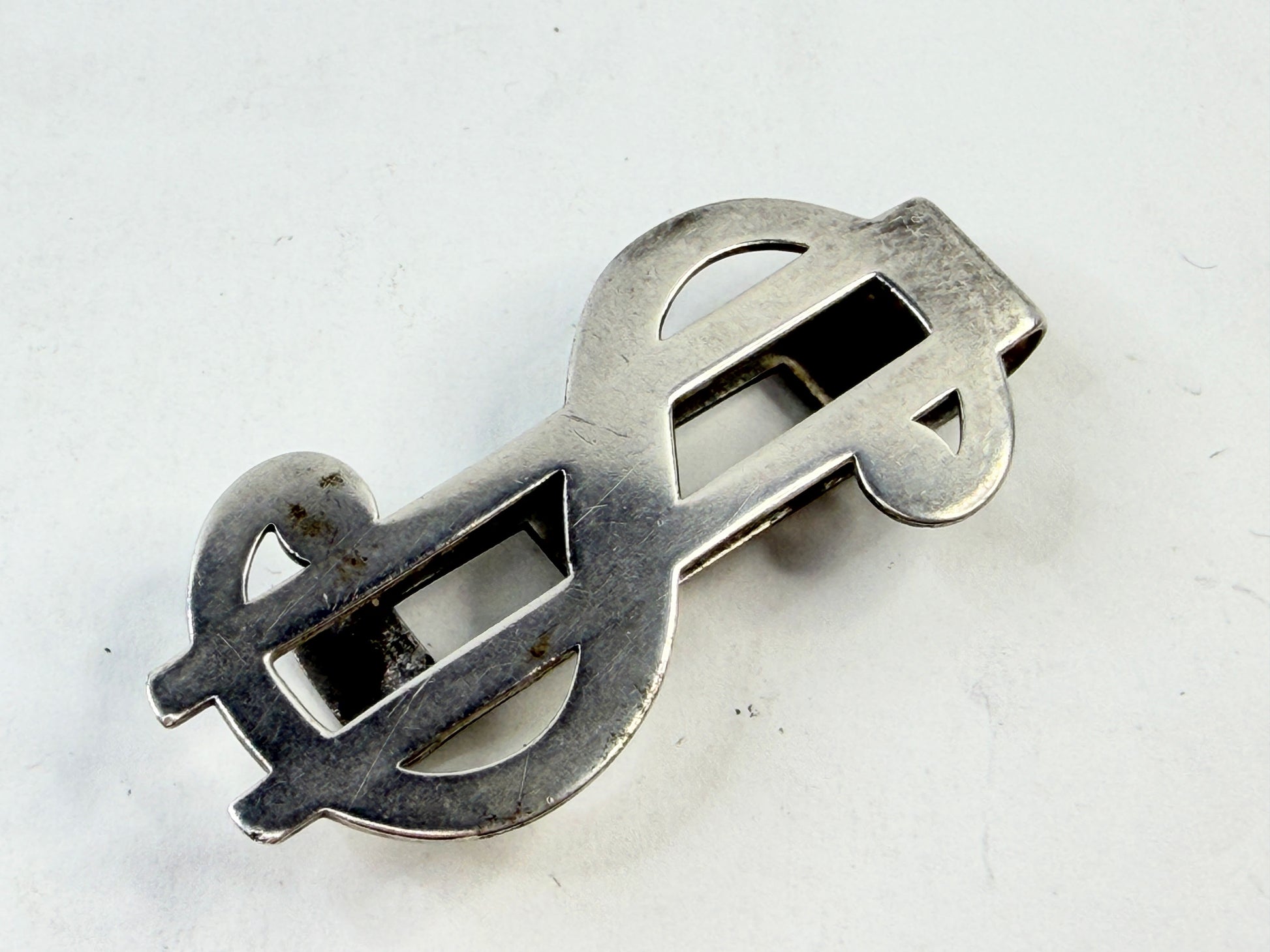 A vintage sterling silver money clip executed as a stylized dollar sign, combining graphic openwork design with practical form. The elongated curves and strong linear cutouts create a striking sculptural silhouette while maintaining firm spring tension for secure currency hold. Marked A 925 and weighing 11.7 grams. Measures approximately 2 3/8 inches by 1 inch. Surface exhibits natural patina and light wear consistent with age.