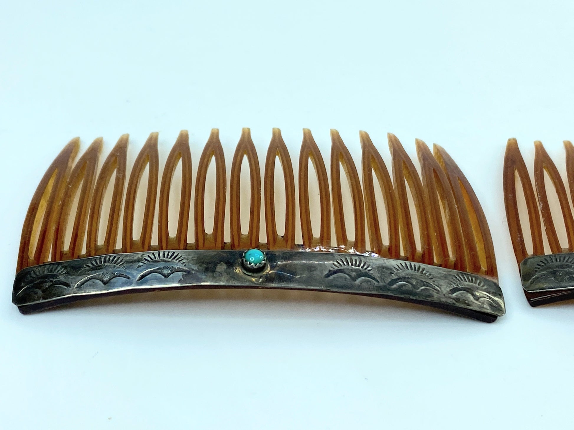 Vintage matched pair of hair combs with sterling silver tops accented by small turquoise cabochons and warm brown celluloid teeth. The silver shows hand-worked detailing with natural patina, while the turquoise adds a subtle pop of color. Designed as a pair for balanced wear, suitable for styling, display, or collection.