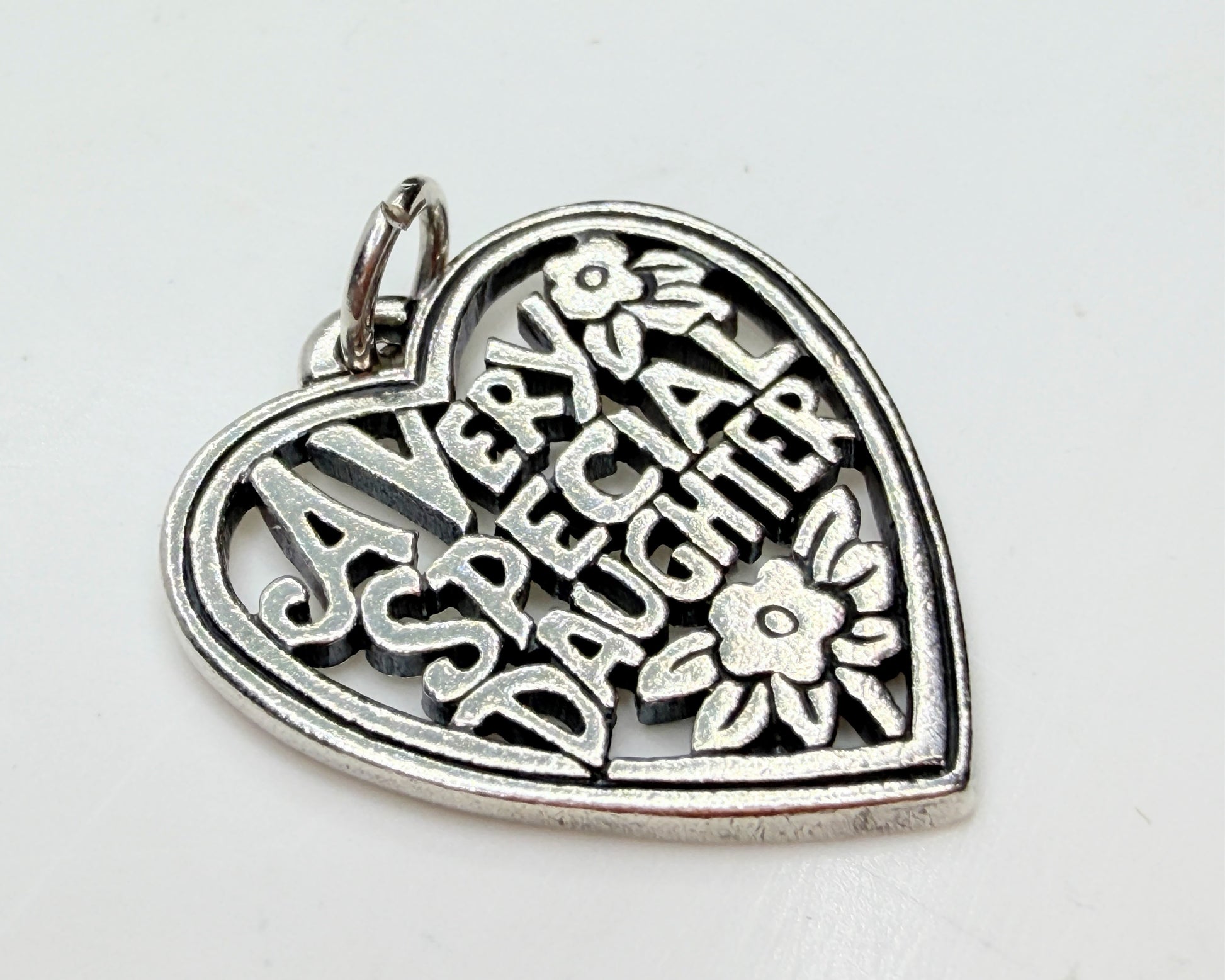 Vintage heart-form pendant rendered in openwork sterling silver, featuring raised lettering reading “A Very Special Daughter” framed by a softly contoured heart outline and floral accents. The design balances sentimental wording with sculptural depth, giving the piece visual clarity and charm without excess weight. The reverse shows clean cutwork and a fixed bail suitable for chain wear. Hallmark on the reverse reads “JA © STER,” confirming sterling silver manufacture.