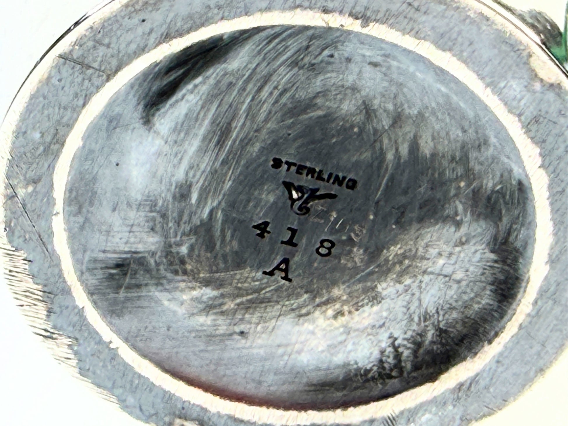 Sterling silver cachepot with ornate repoussé floral and scrolling decoration encircling the upper band. Interior rim carries matching raised floral work. Tapered form with solid base. Fully marked Sterling with maker’s mark and pattern number 418 A. Decorative late vintage example suitable for display or small plant use.