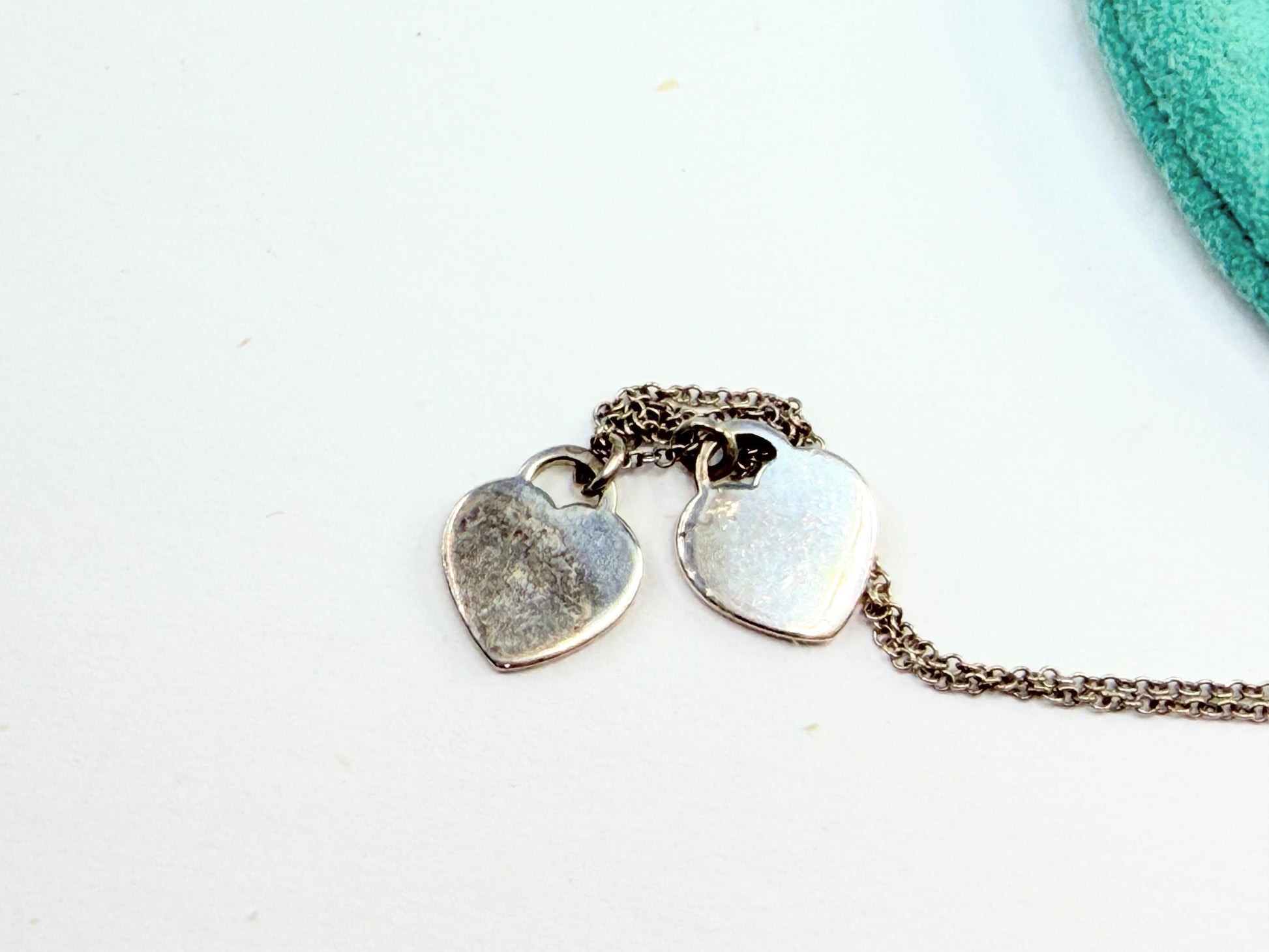 Vintage Tiffany & Co sterling silver double heart necklace featuring the iconic “Please Return to Tiffany & Co” tag paired with a red enamel heart charm. The classic heart tag is set with a small bezel diamond at center. Crafted in 925 sterling silver with fine link chain, 18 inches in length. A recognizable Tiffany motif with vivid enamel contrast and delicate diamond accent.
