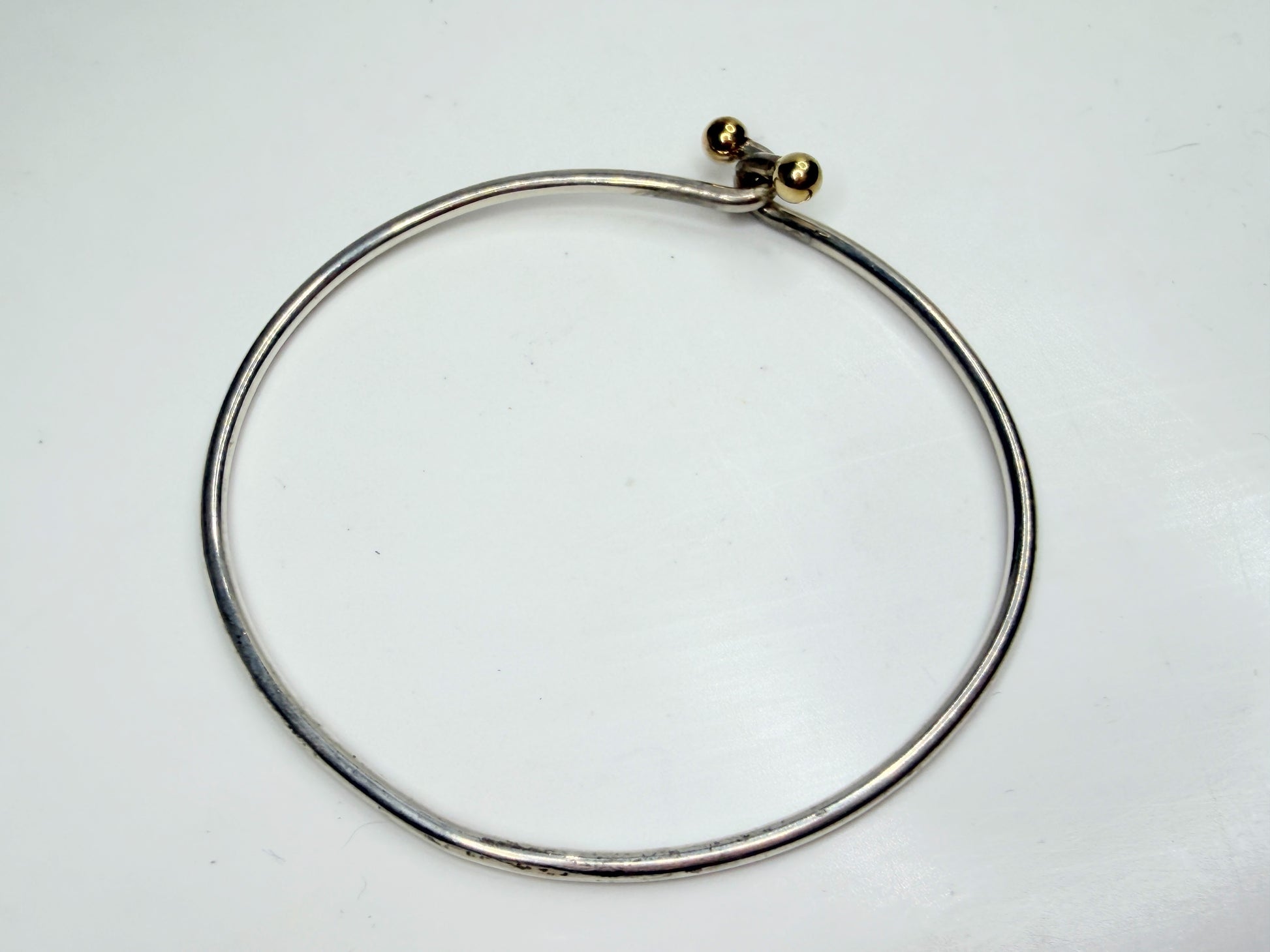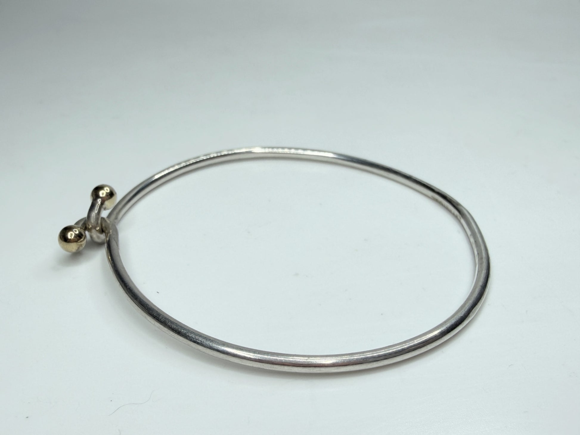 Elegant Tiffany & Co bangle bracelet crafted in sterling silver, finished with signature 18k gold bead terminals. The clean circular profile and refined mixed-metal contrast reflect Tiffany’s minimalist design language, making this a timeless everyday piece with subtle luxury presence. It comes with origina Tiffany pouch or box