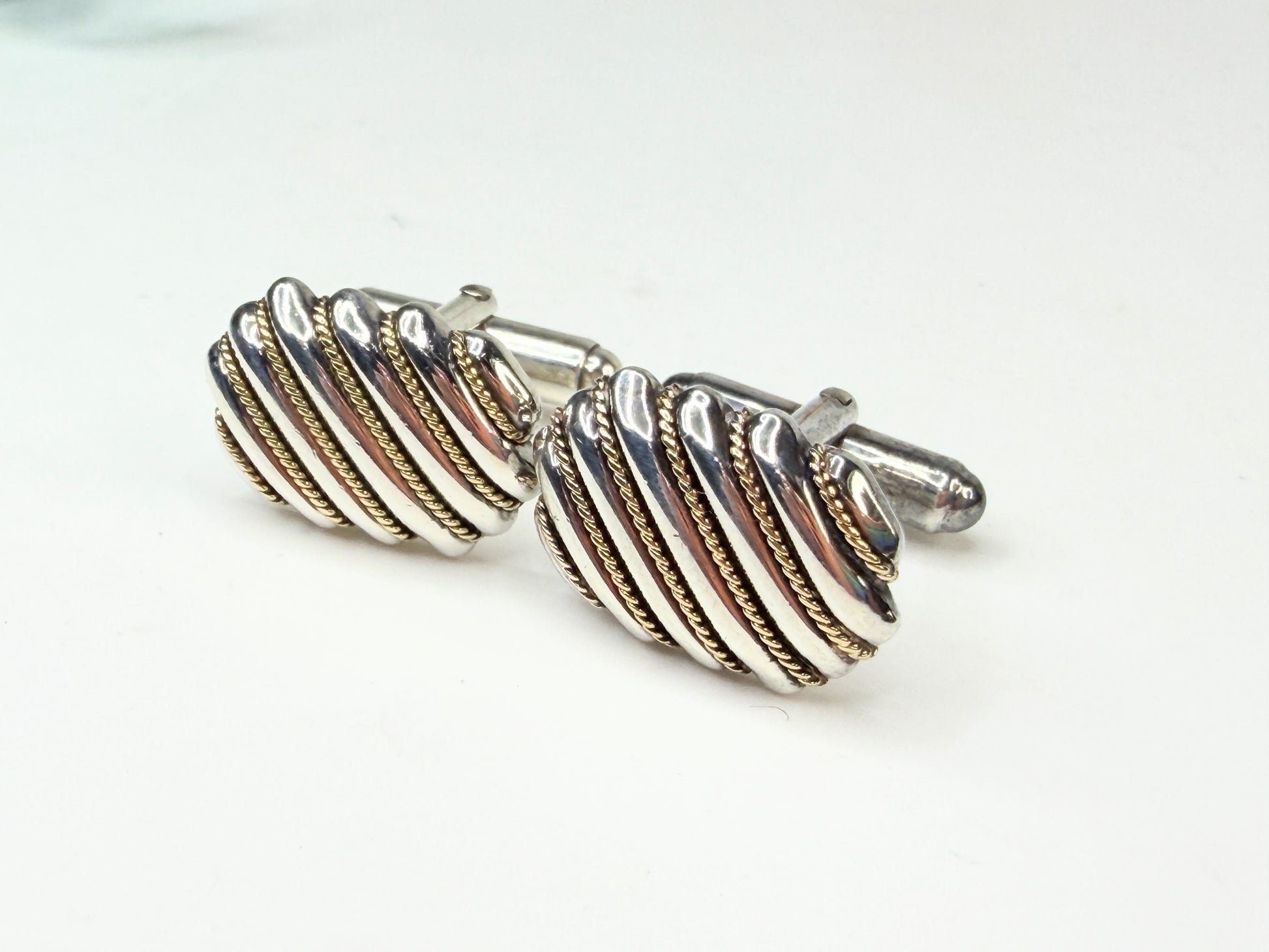 Vintage Tiffany & Co cufflinks crafted in sterling silver with 18K yellow gold rope accents. The oval domed fronts are structured with diagonal fluted silver ridges divided by twisted gold rope bands, creating dimension and refined contrast. The backs are stamped TIFFANY & CO 925 750 verifying sterling silver and 18K gold composition. A strong, sculptural late twentieth century Tiffany design with substantial feel and balanced proportion. Light surface wear appropriate to age; gold rope remains crisp and secure. I comes with a Tiffany boue pouch.