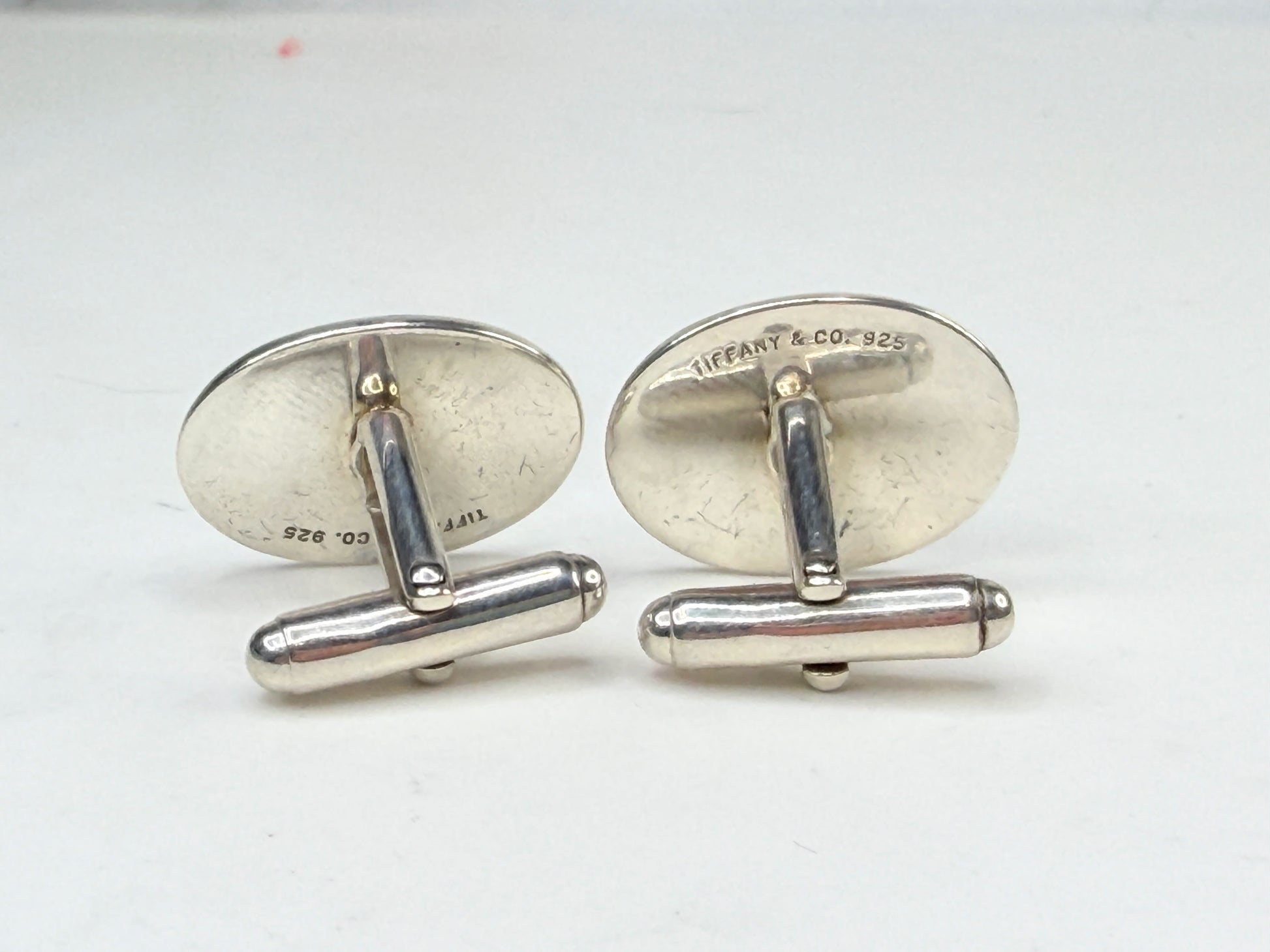 Vintage Tiffany & Co oval cufflinks in sterling silver featuring a rich cobalt blue enamel border surrounding a polished silver center panel. The design is restrained and refined, emphasizing proportion and contrast rather than ornament. The reverse is stamped TIFFANY & CO. 925 verifying sterling silver construction. A classic late twentieth century Tiffany accessory with clean modern presence. Light surface wear on reverse appropriate to age; enamel remains intact with strong color. It comes with an original blue pouch.