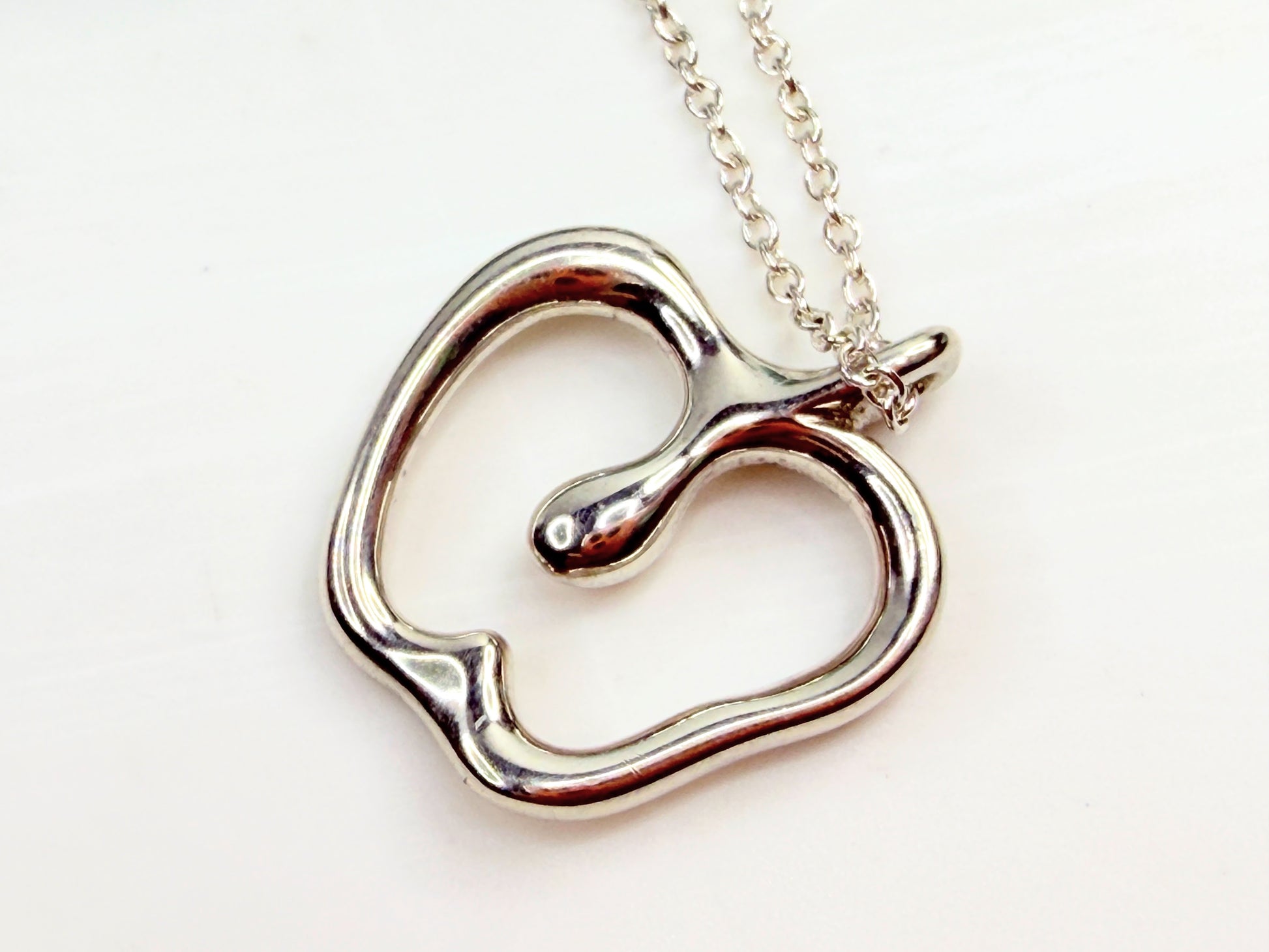 Designed by Elsa Peretti for Tiffany & Co., this sterling silver apple pendant embodies her celebrated organic minimalism. The softly rounded open apple silhouette features an integrated stem and fluid interior curve, creating a graceful sculptural presence on a fine 16" chain. Hallmarked TIFFANY & CO. © PERETTI 925, with PERETTI tag at clasp, confirming designer and metal purity. A collectible Peretti icon, elegant and timeless. Includes Tiffany pouch.
