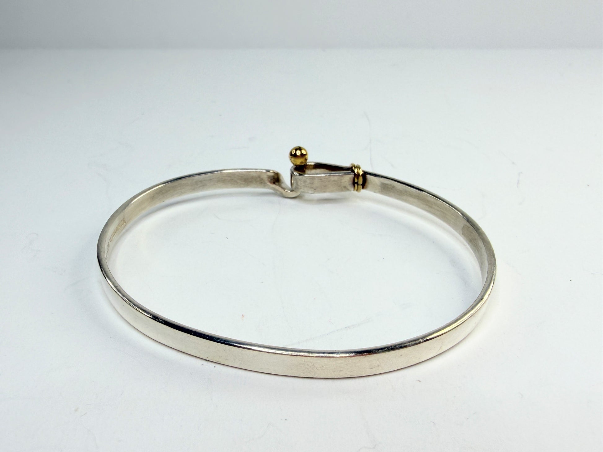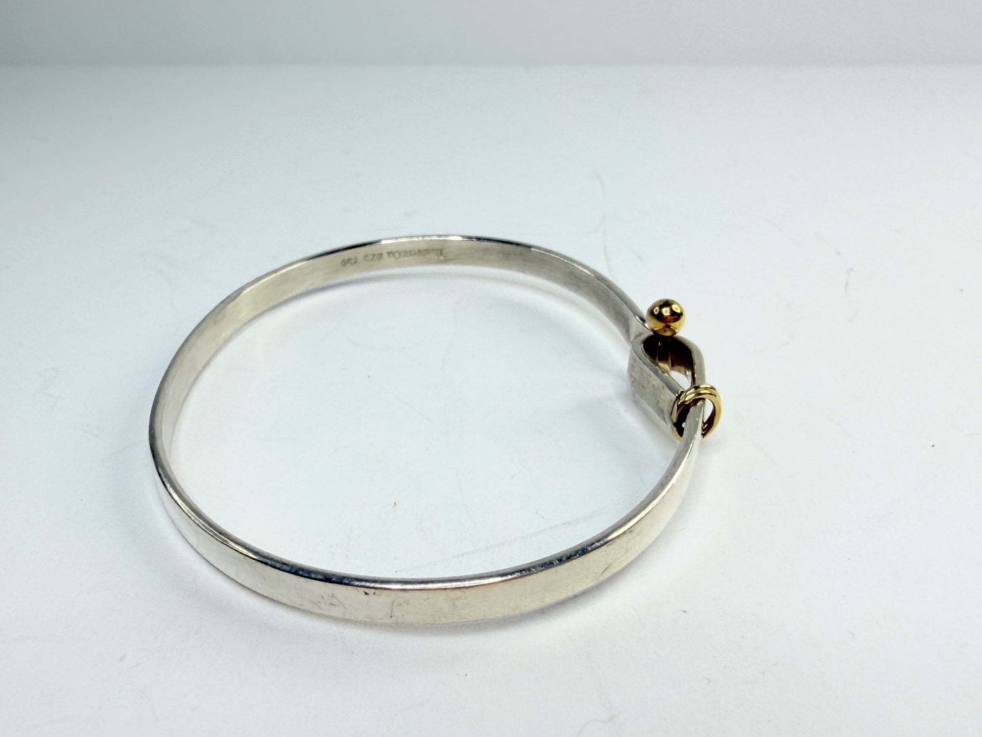 Sterling silver Tiffany & Co hook bracelet with an integrated 18K gold ball accent, combining a clean circular bangle form with a functional hook closure. The bracelet has a smooth, polished finish and balanced proportions, reflecting Tiffany’s classic mixed-metal design language. Marked TIFFANY & CO. 925 750 on the interior. Comes with a pouch.