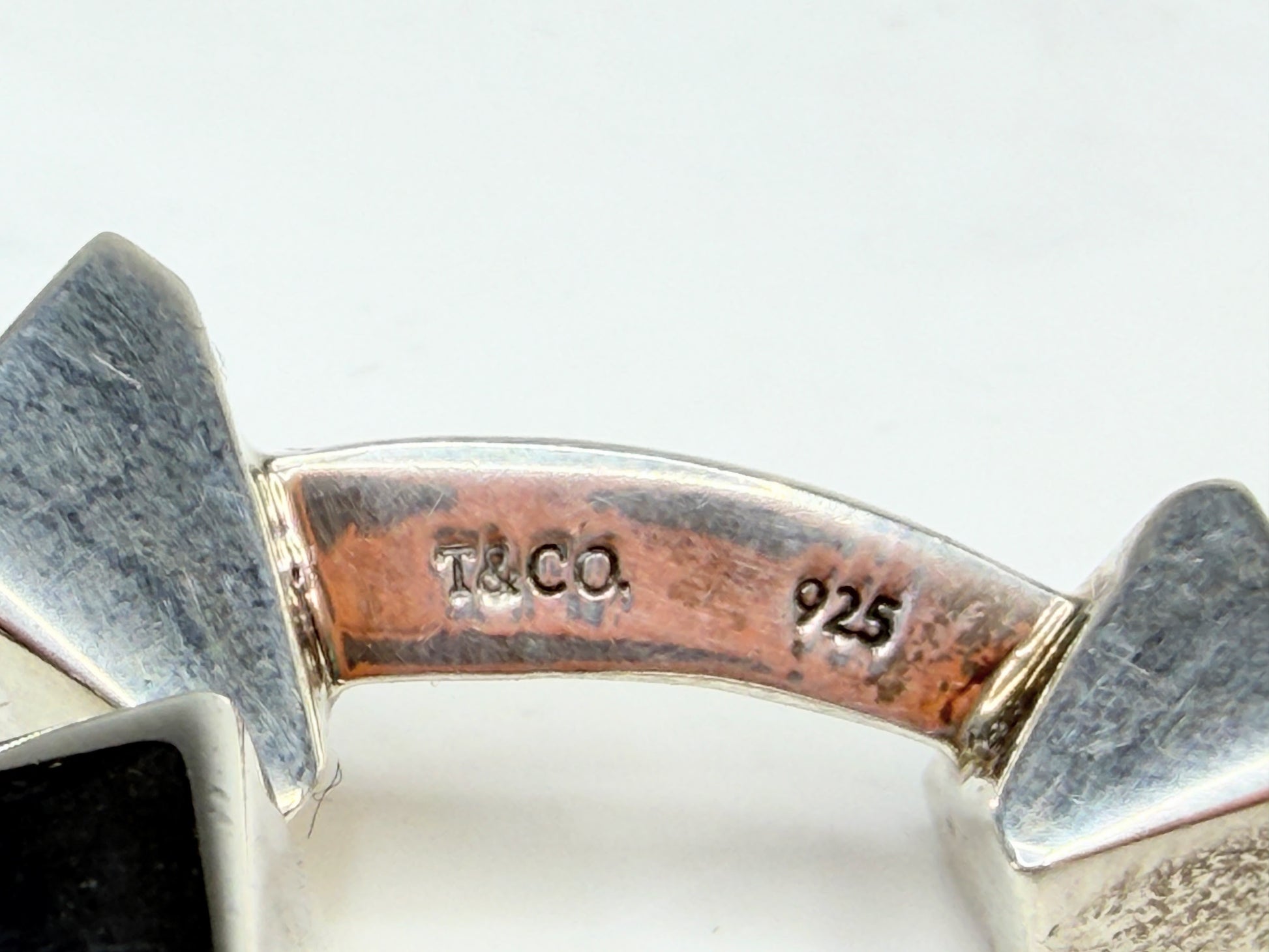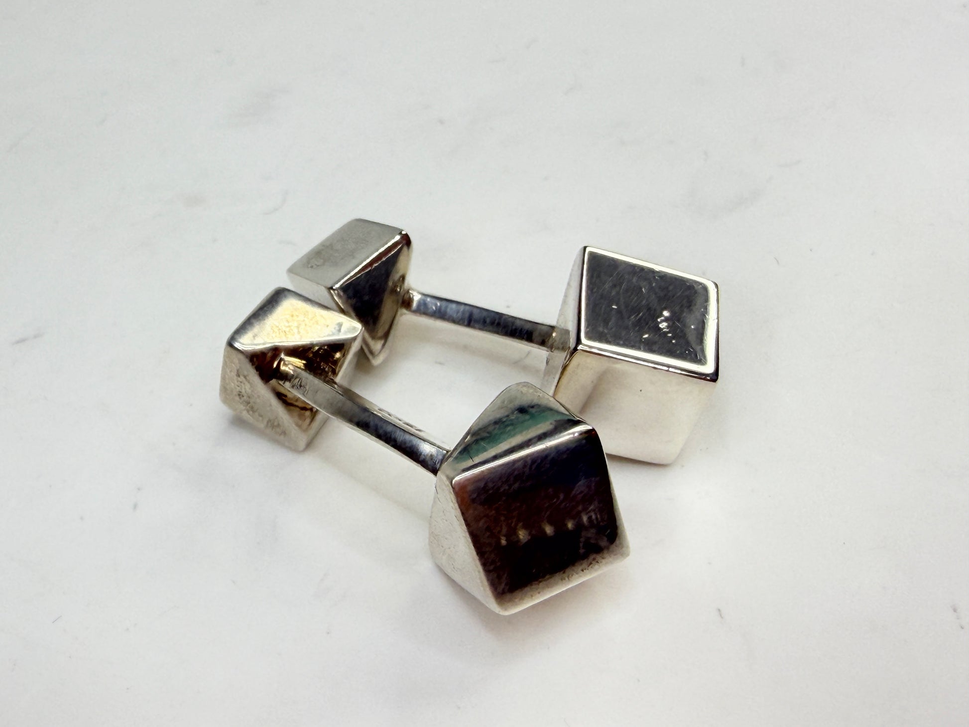 Sculptural sterling silver cufflinks featuring bold cube forms with angled planes, designed by renowned architect Frank Gehry for Tiffany & Co. The design reflects Gehry’s signature architectural language—strong geometry, tension, and industrial elegance—translated into wearable form. Substantial, minimalist, and unmistakably modern, these cufflinks are a statement piece for collectors of Tiffany design and architectural jewelry. Comes with original Tiffany pouch.