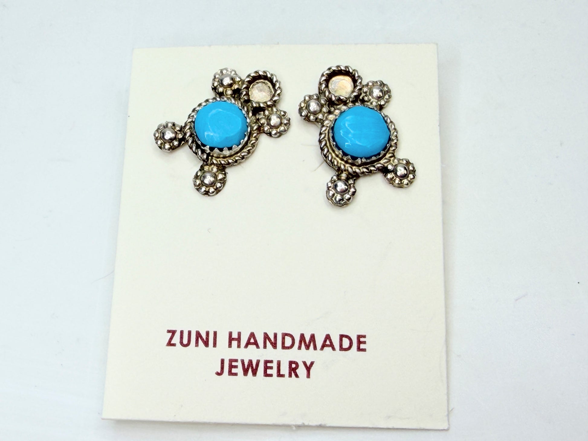 Vintage Zuni handmade sterling silver post earrings featuring bezel-set round Kingman turquoise centers surrounded by traditional rope and granulated silver motifs. The earrings display the hallmark characteristics of Zuni lapidary and silversmith work, with balanced proportions and bright natural turquoise color. These earrings are presented as new old stock on original display card and offer classic Southwestern artisan style suited for everyday wear or collectors of Native American jewelry.