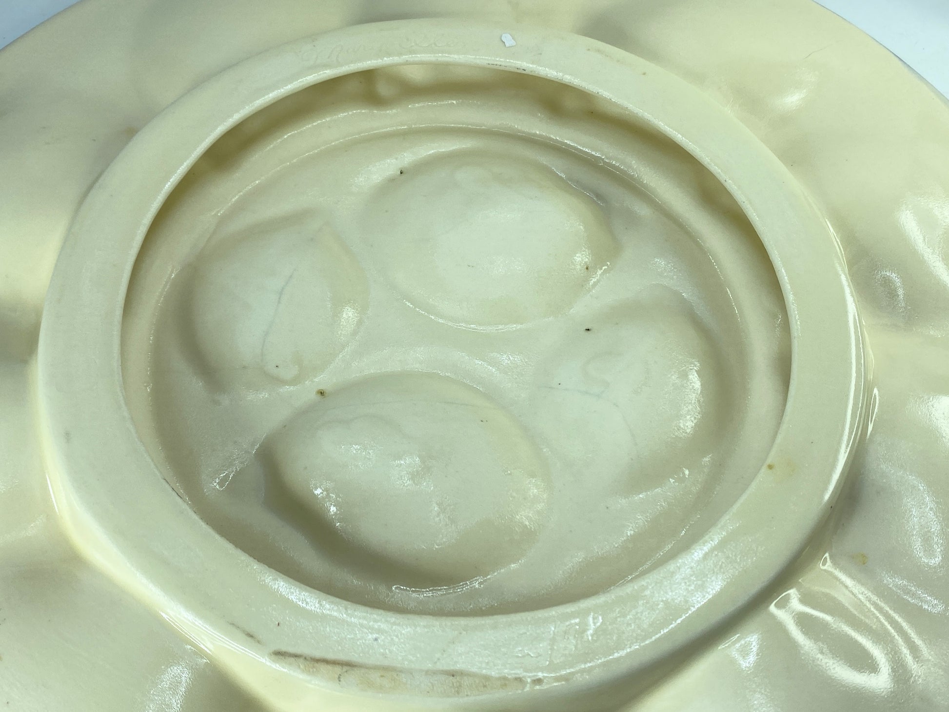 X-Large French Majolica Oyster St Clement Lavender Yellow Serving Platter. Gorgeous and original oyster plate! It has 12 oyster/shell compartments + 2 in the center for lemon slices and sauces.