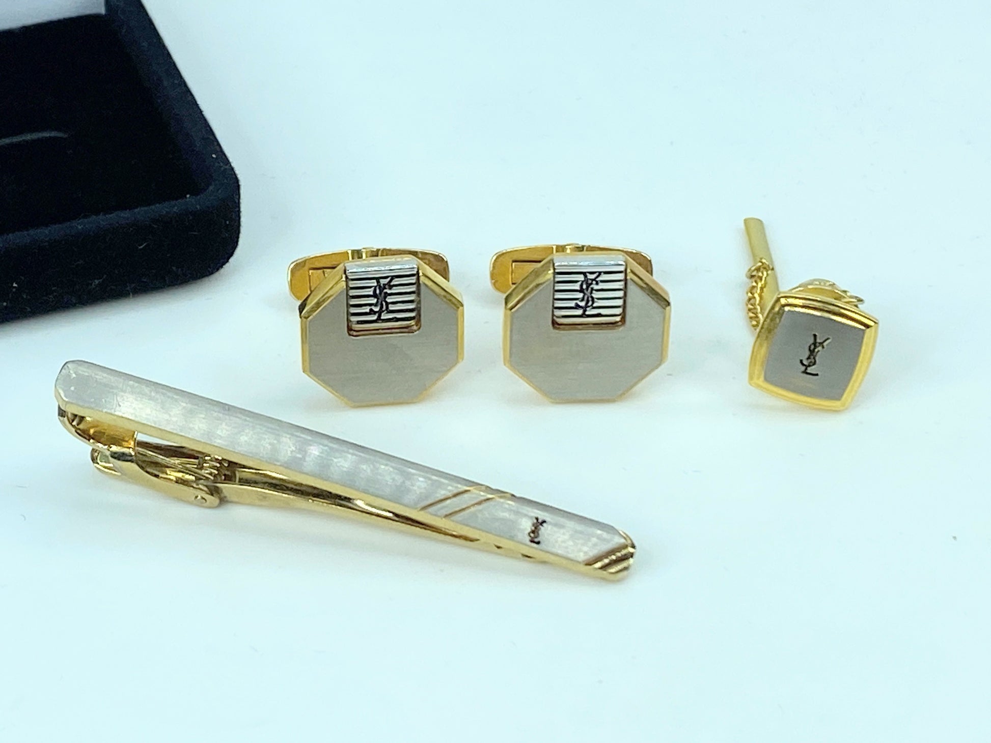 Vintage Yves Saint Laurent Tie Pin, Tie Clip and Cufflinks Set –Silver tone with Gold Gilt.